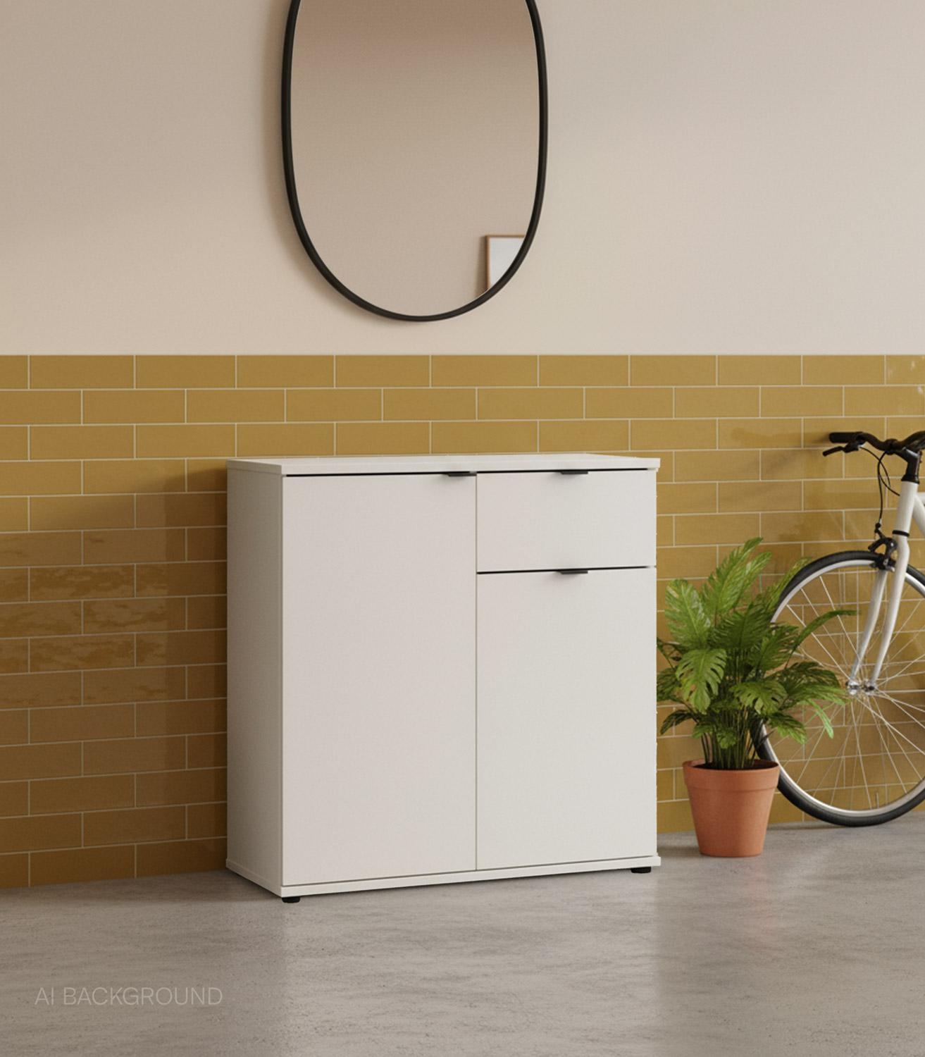 | Lieferumfang: | 1 Kommode mit 2 Türen, 1 Schublade und 1 mehrfach höhenverstellbarem Einlegeboden |