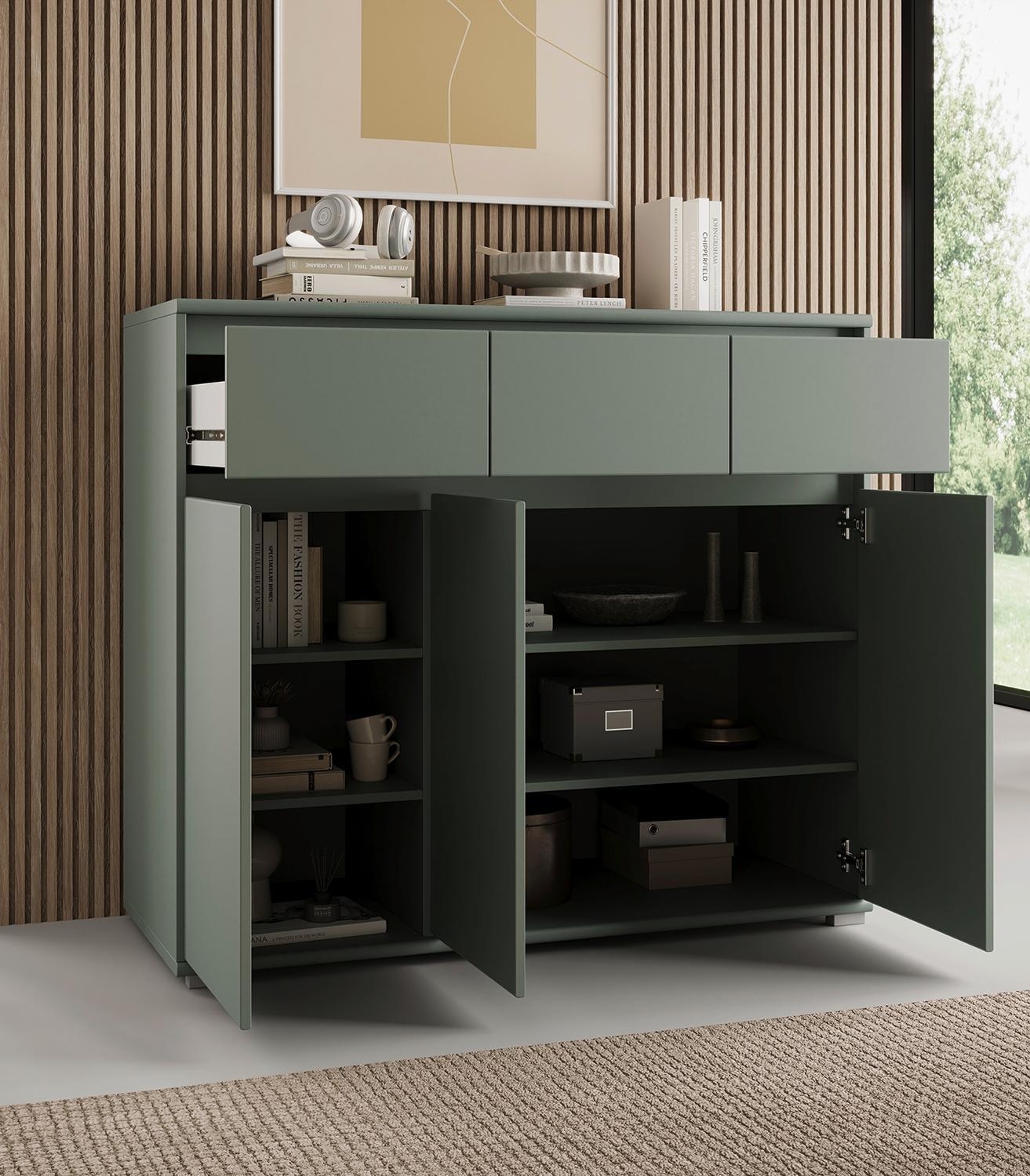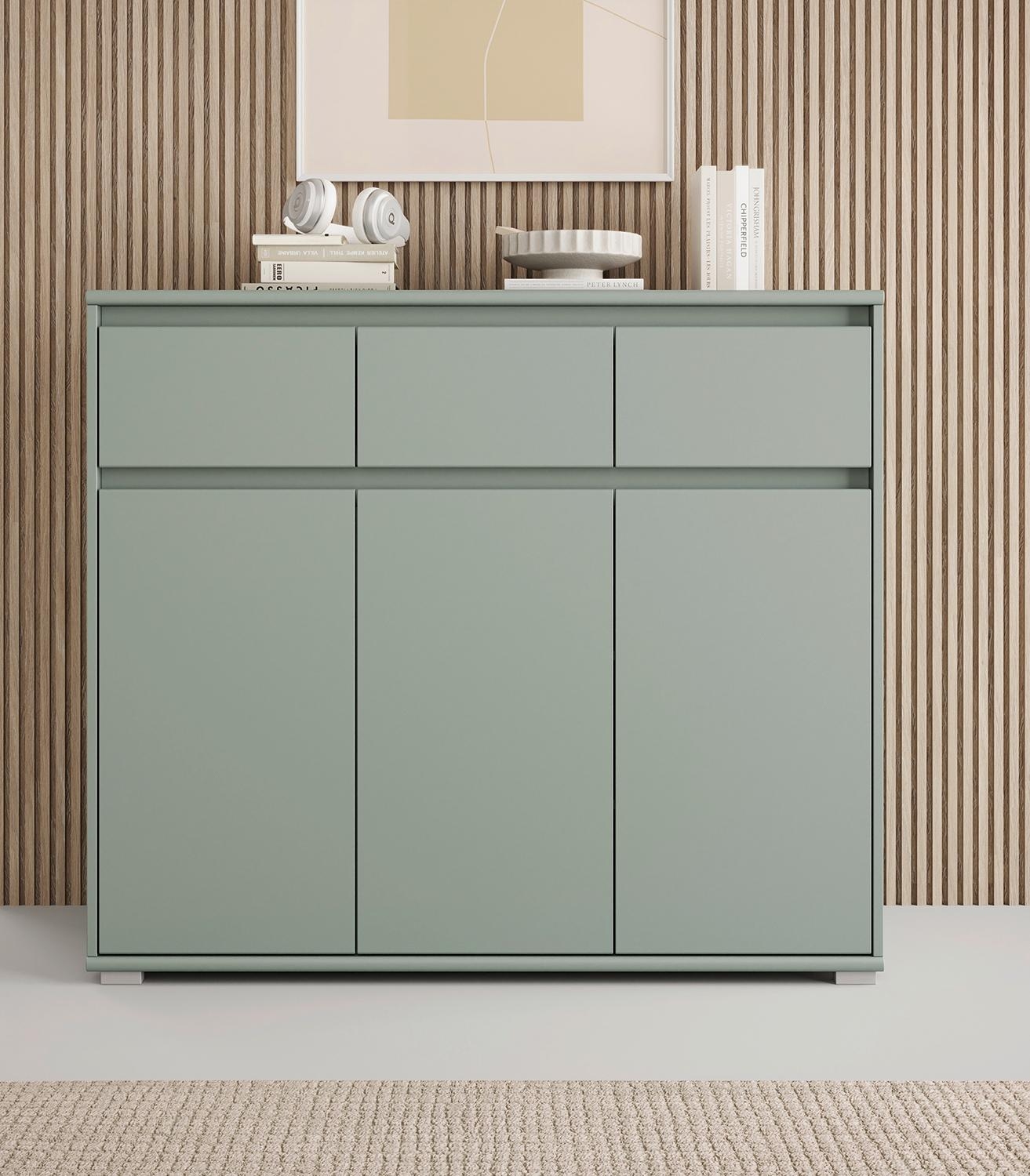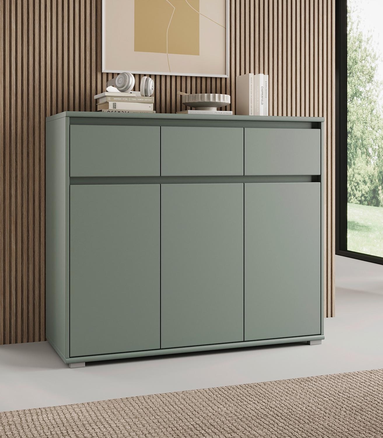 Die Kommode IDOLA ist in Salbeigrün matt gehalten und zeichnet sich durch ein griffloses Design aus. Als Anrichte verfügt sie über drei Türen und drei Schubladen. Im Inneren stehen vier Einlegeböden zur Verfügung. Die Breite beträgt 118 cm, die Höhe 103 cm und die Tiefe 48 cm.