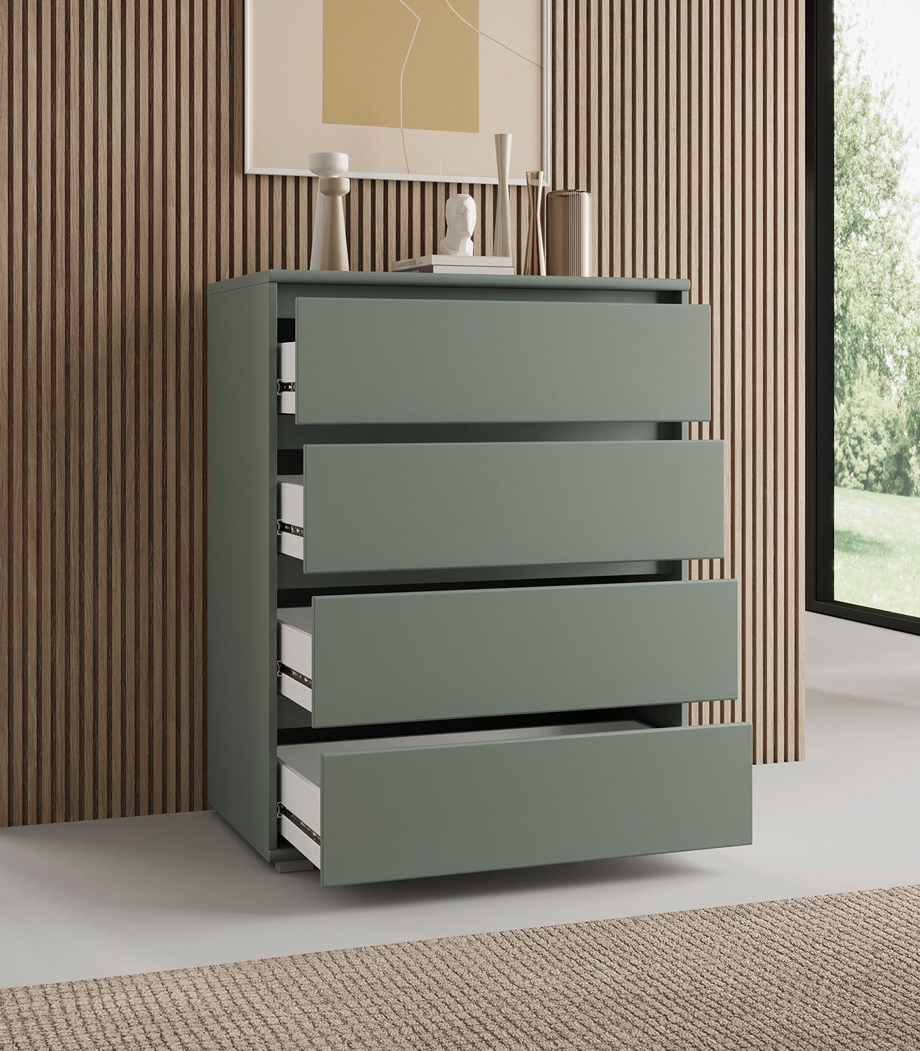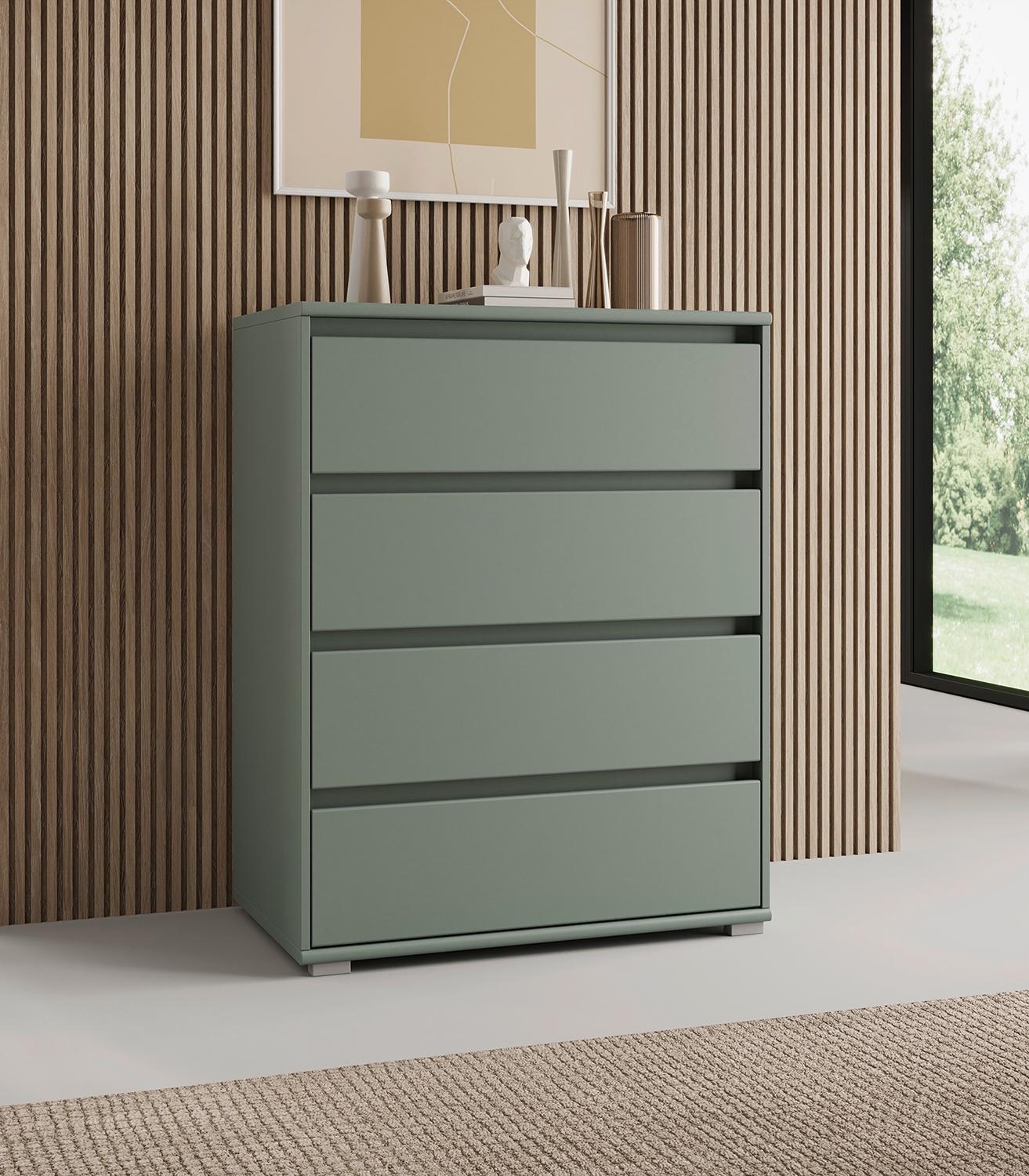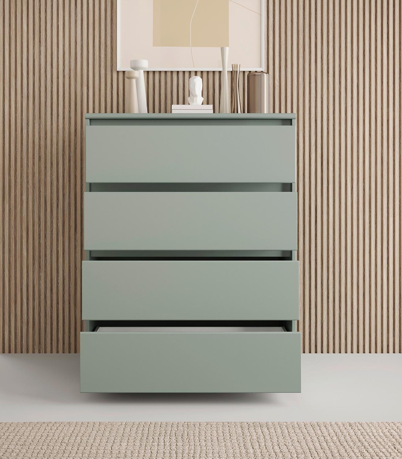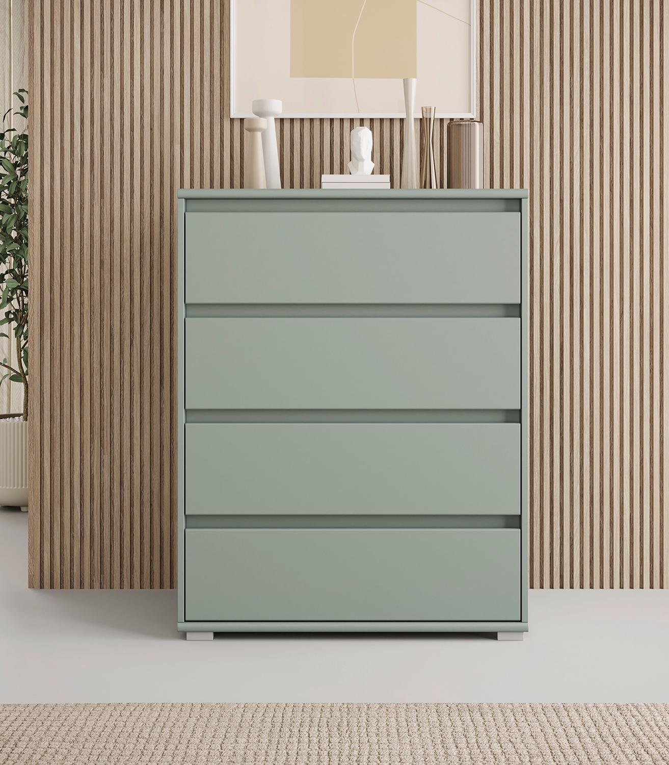 Die Kommode IDOLA ist in Salbeigrün matt gehalten und mit einem grifflosen Design ausgeführt. Vier Schubladen schaffen Stauraum für Kleidung, Accessoires und weitere Utensilien. Die Schubladenkommode hat eine Breite von 80 cm, einer Höhe von 103 cm und einer Tiefe von 48 cm.