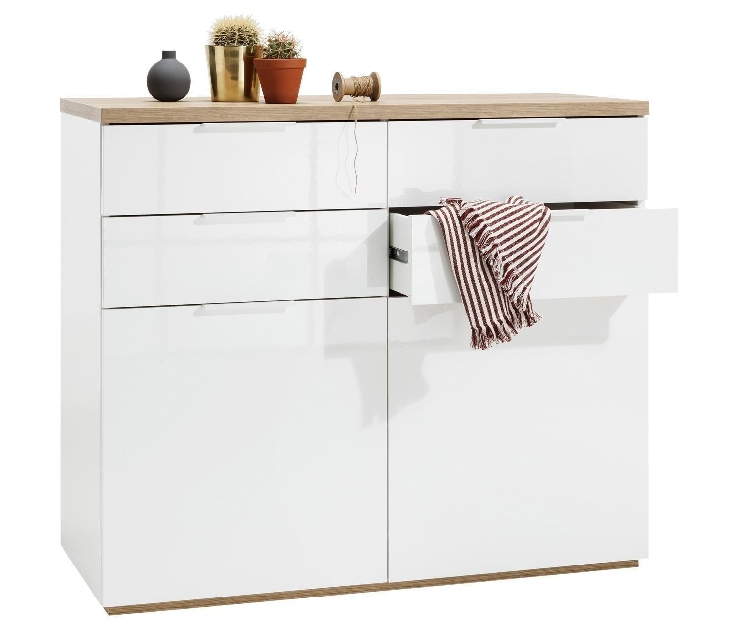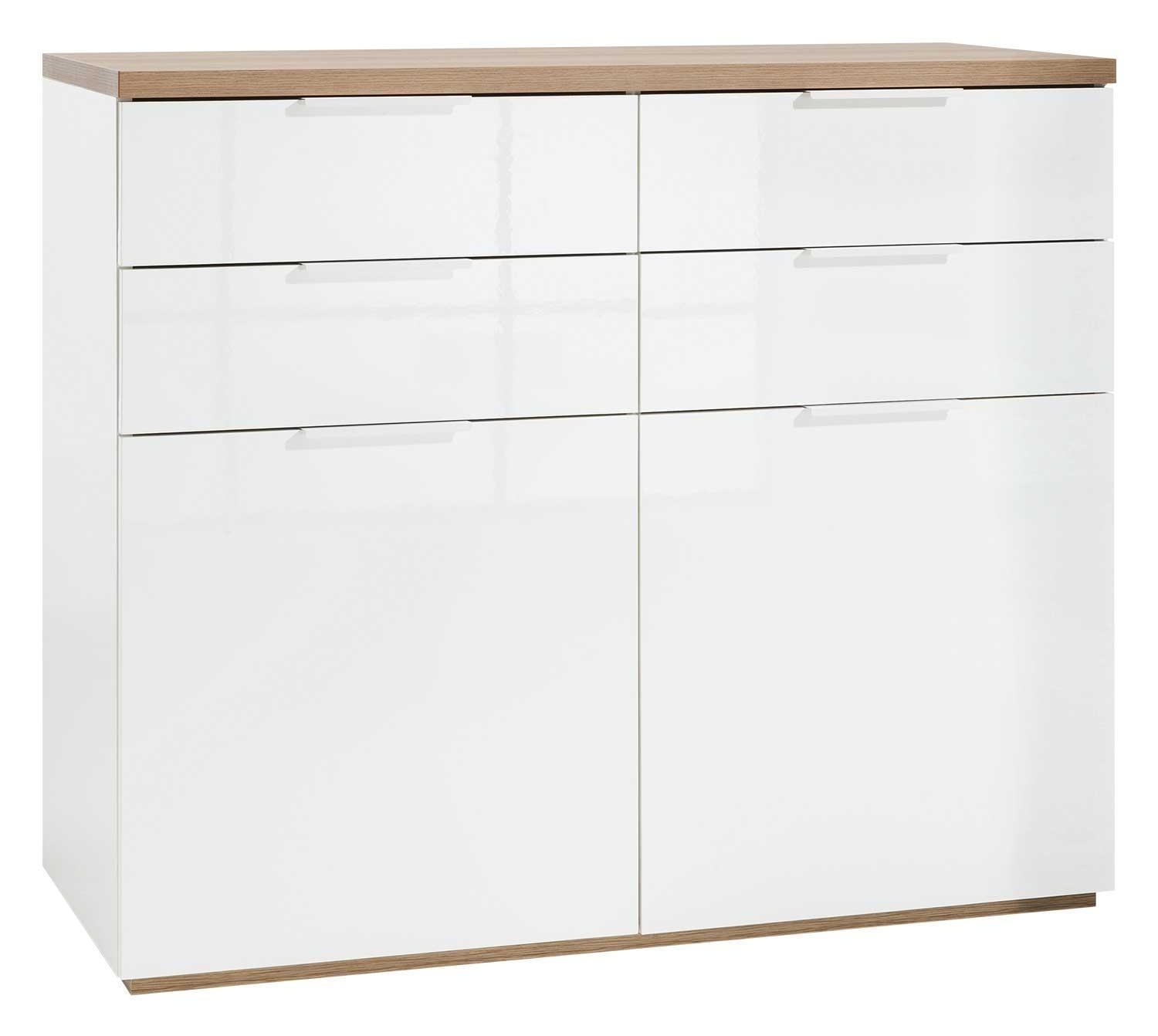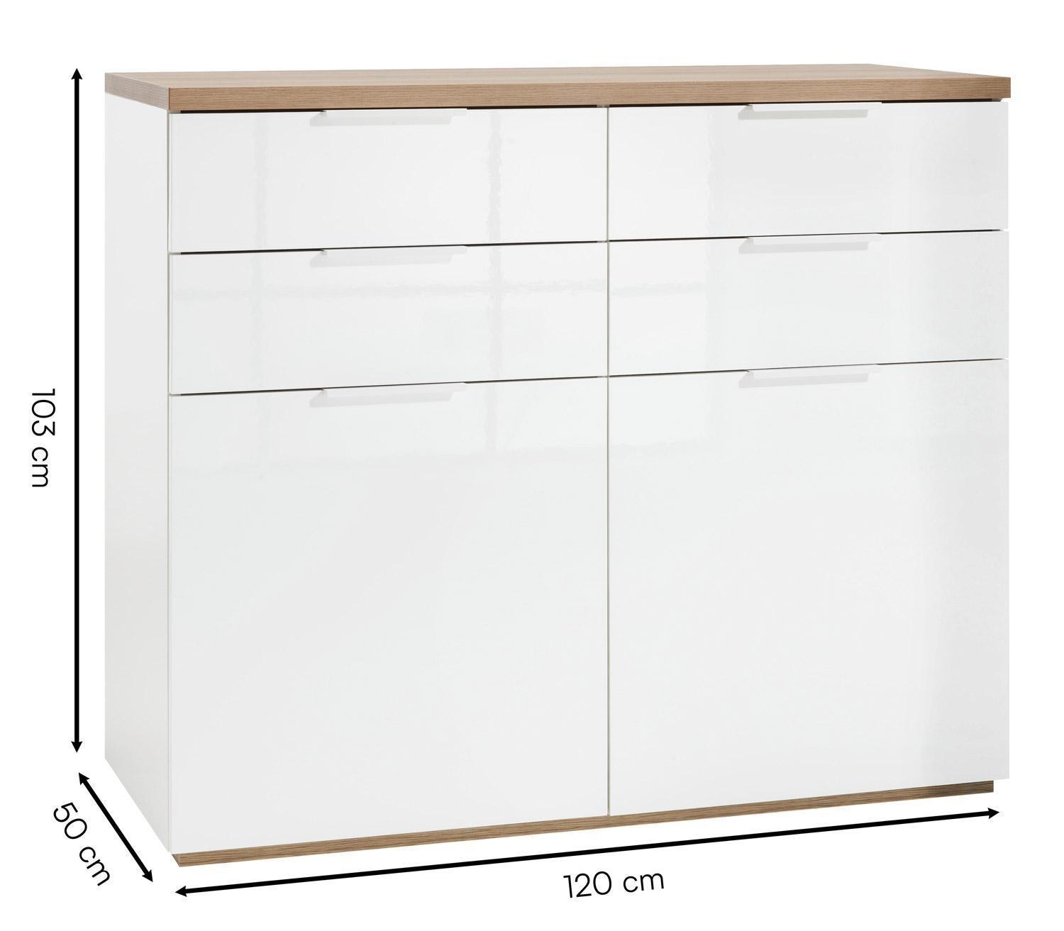 Die Kommode MICHA ist in Weiß Hochglanz gehalten und verfügt über Absetzungen in Eiche Riviera Dekor. Sie ist mit zwei Türen und vier Schubladen ausgestattet. Im Innenbereich befinden sich zwei höhenverstellbare Einlegeböden, die eine flexible Nutzung des Stauraums ermöglichen. Die Griffe bestehen aus weiß lackiertem Metall. Die Kommode hat eine Breite von 120 cm, eine Höhe von 103 cm und eine Tiefe von 50 cm.