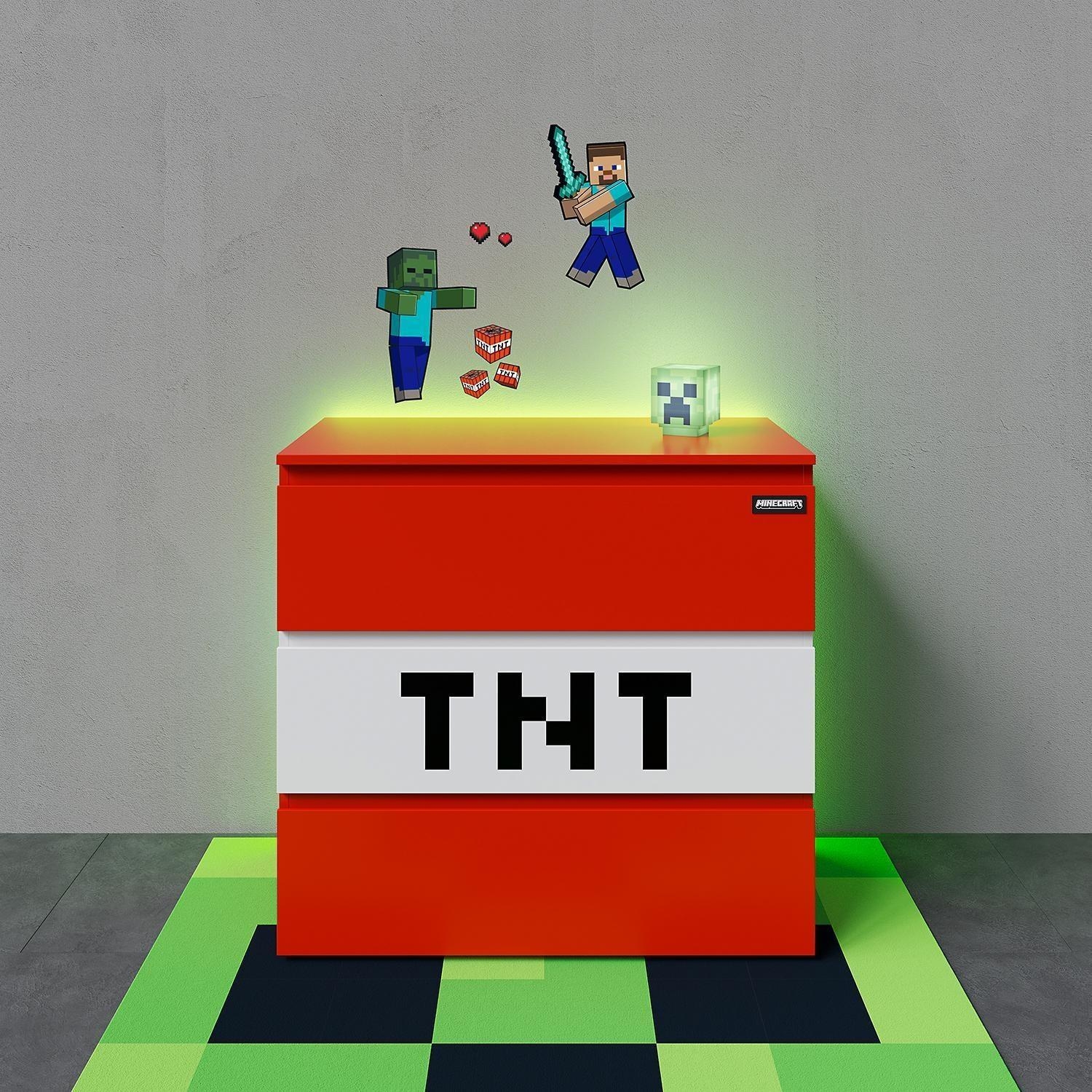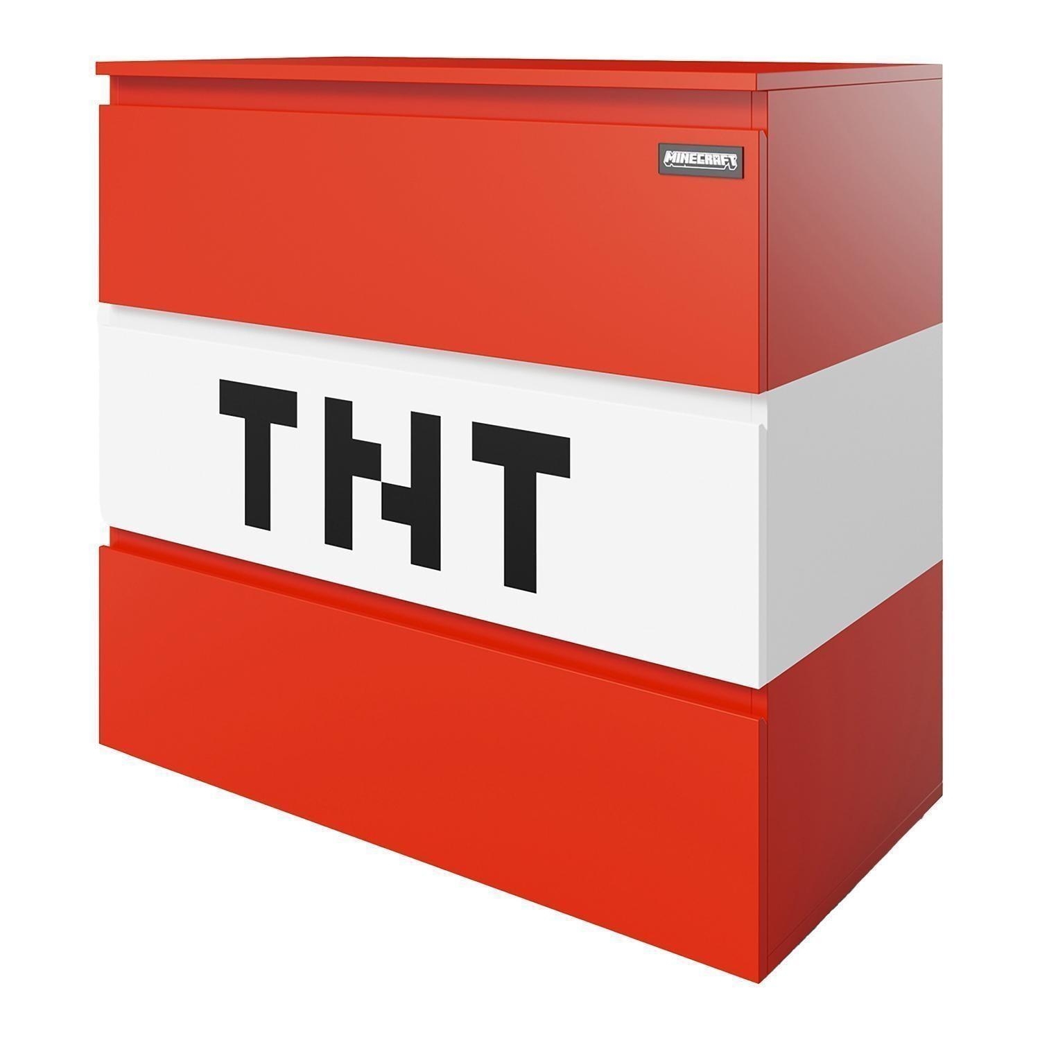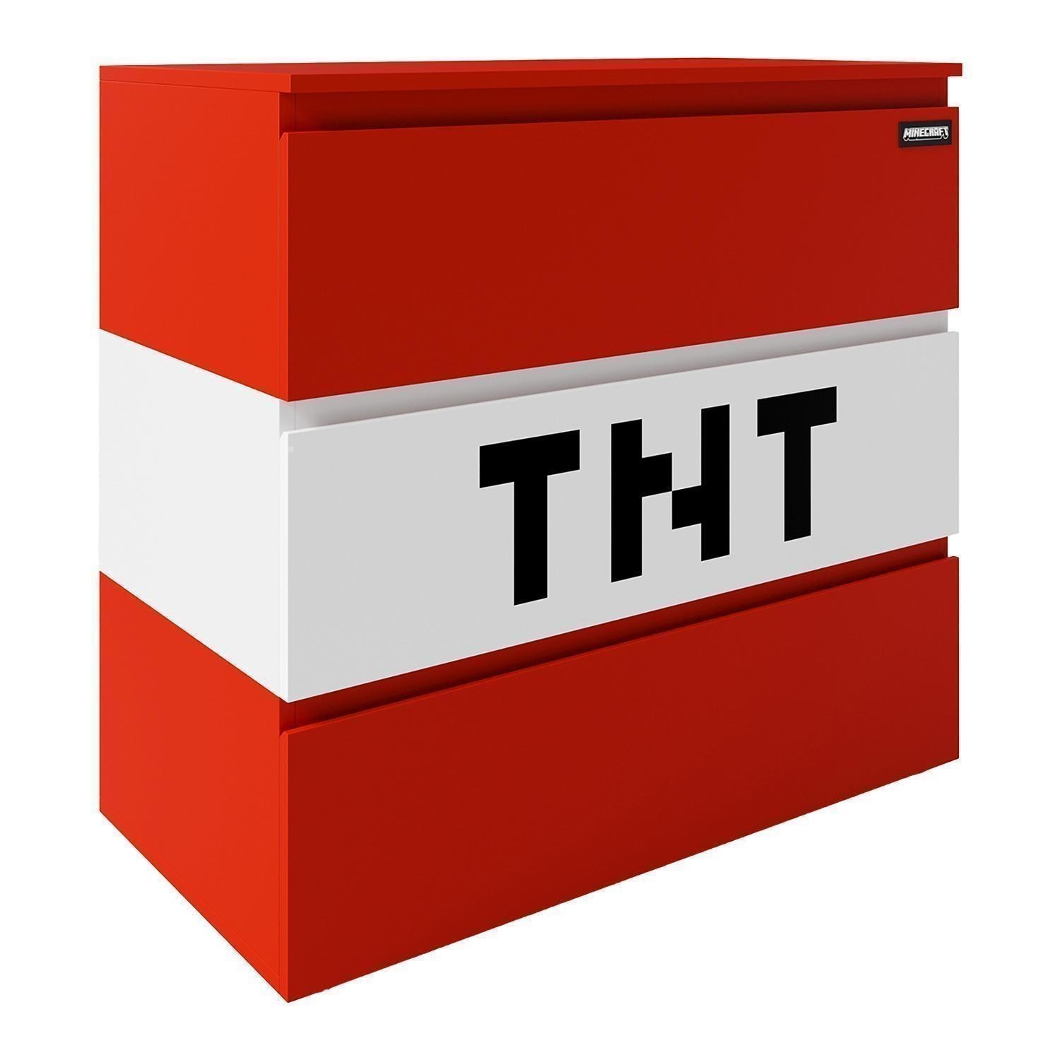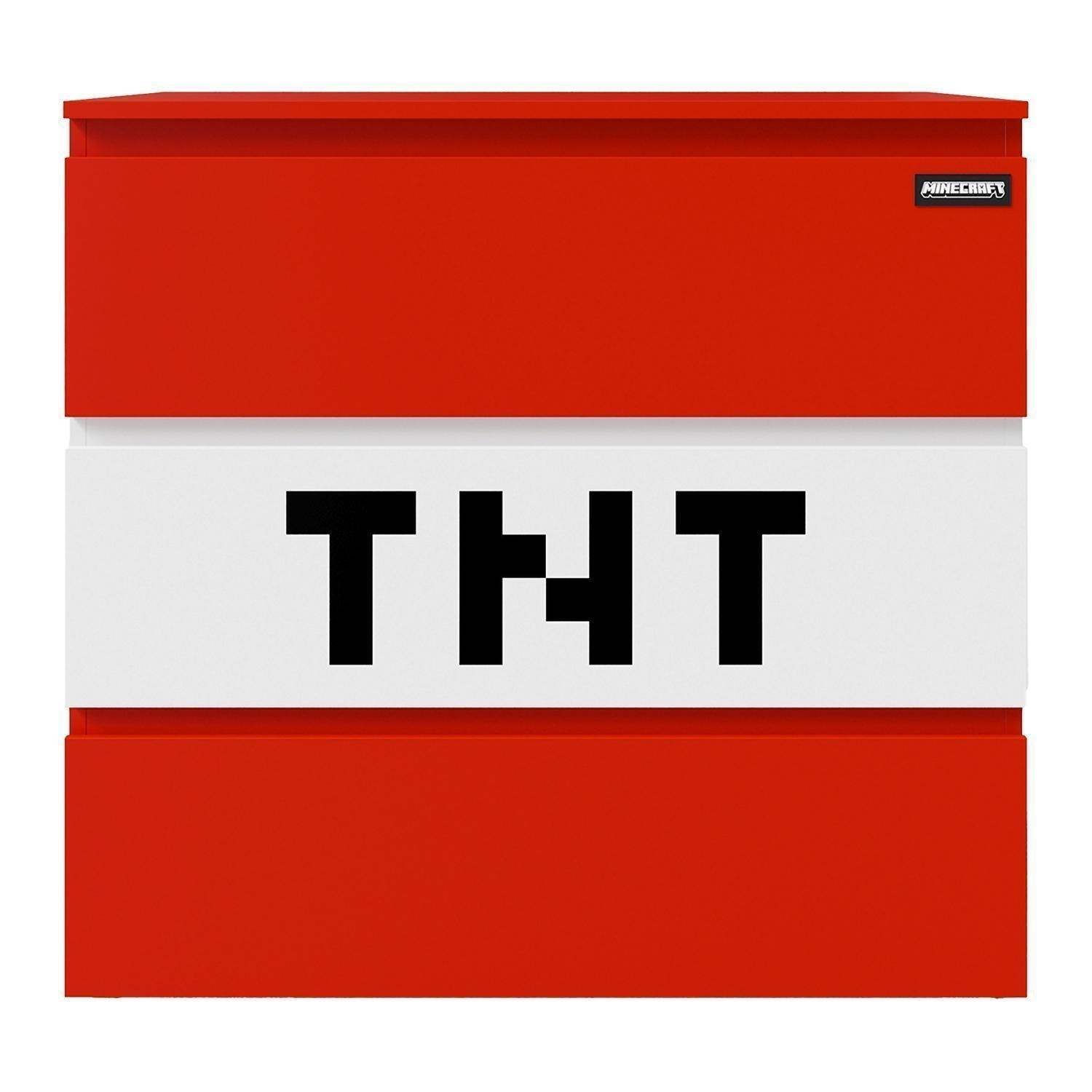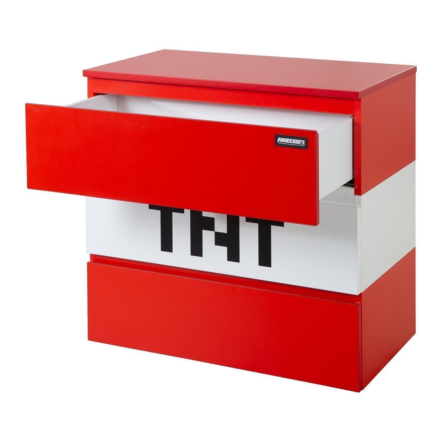 Die Kommode MINECRAFT ist in den Farben Rot und Weiß gestaltet und verfügt über ein Design im Stil des Minecraft-TNT-Blocks. Sie ist mit drei Schubladen ausgestattet und besitzt eine LED-Rückwandbeleuchtung. Die Kommode hat eine Breite von 80 cm, eine Höhe von 77 cm und eine Tiefe von 42 cm.