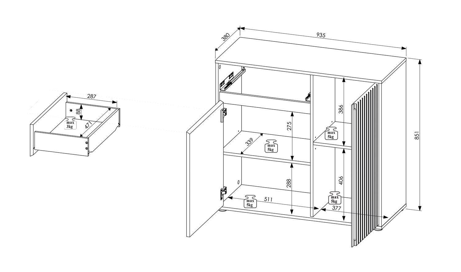 | Lieferumfang: | 1 Kommode mit 2 Türen, 2 dreifach höhenverstellbaren Einlegeböden und 1 Schublade |