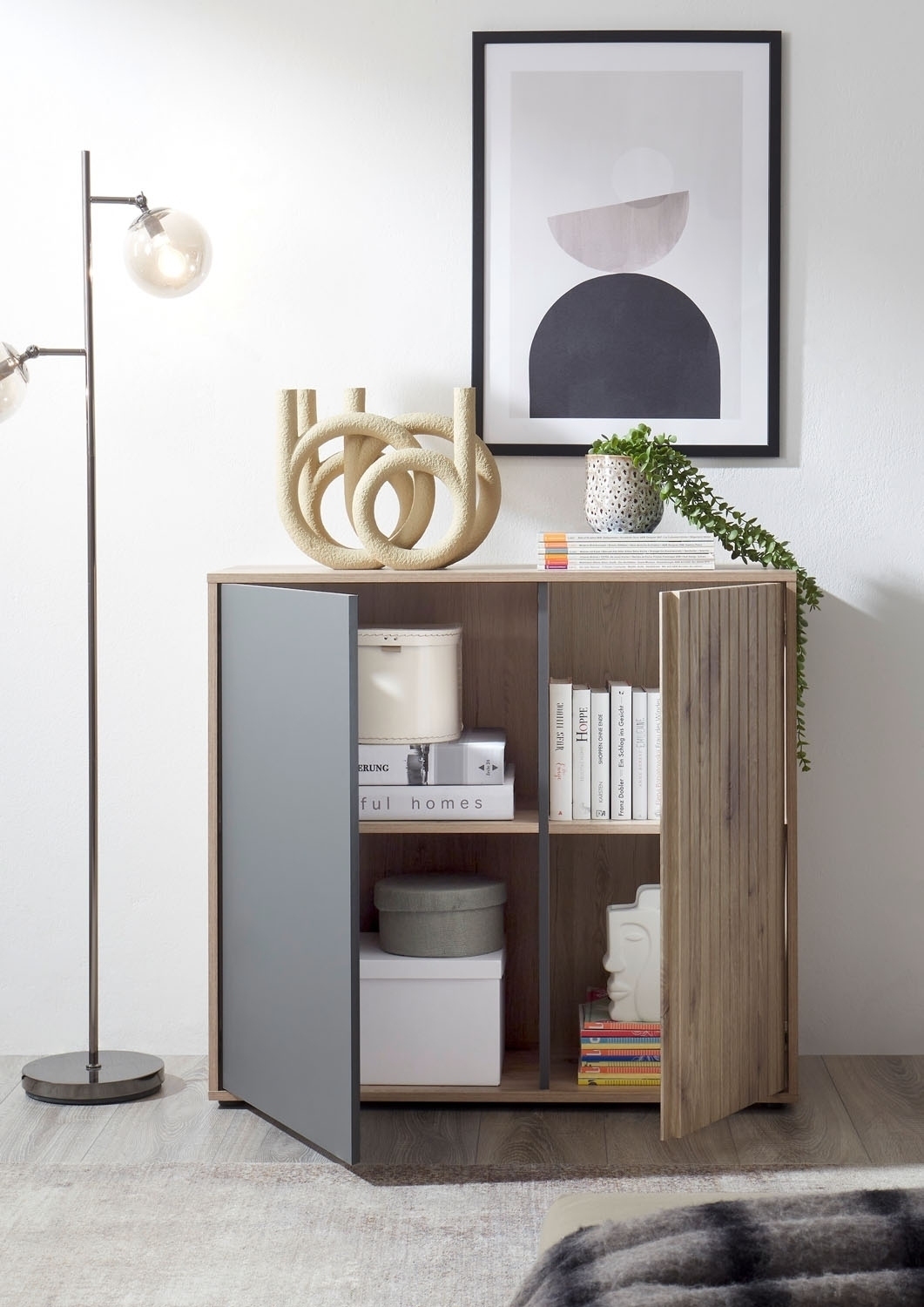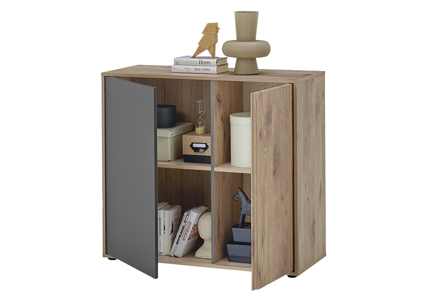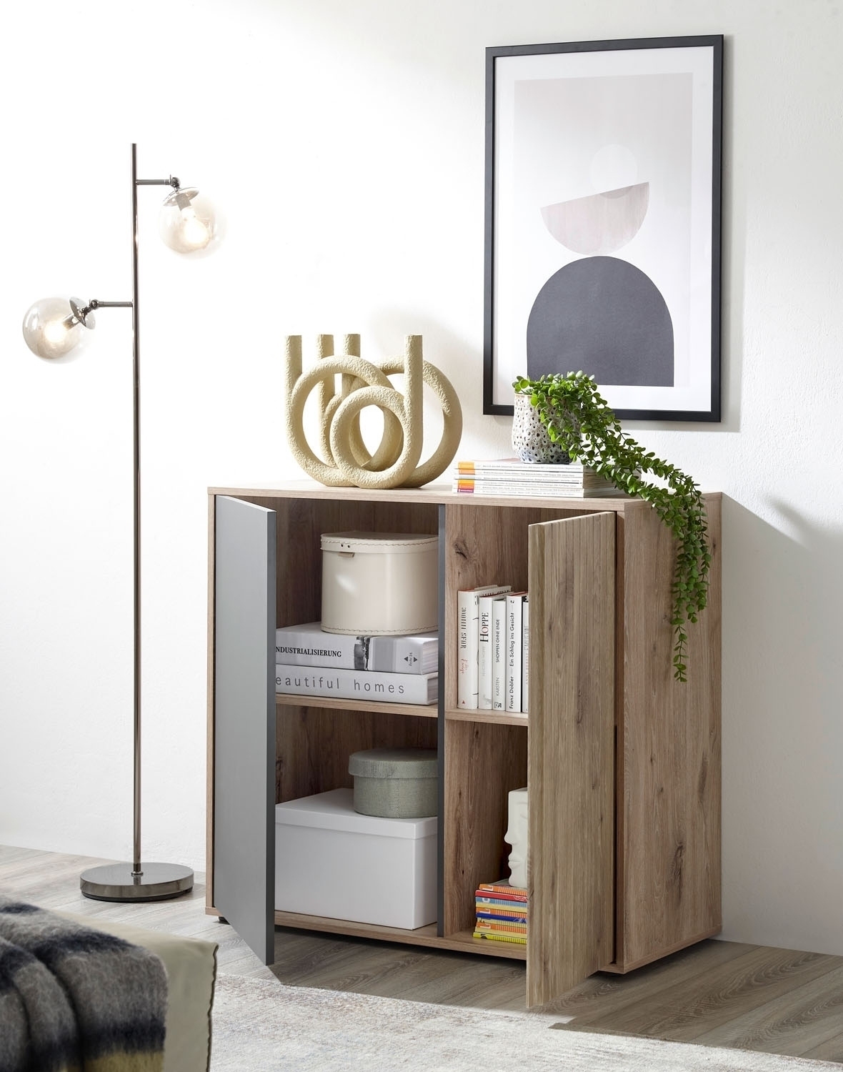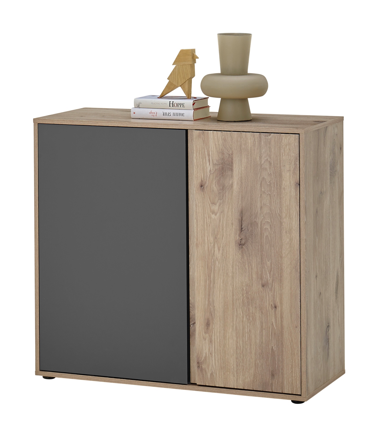 Die Kommode NICOS kombiniert stilvolles Design in Viking Eiche Dekor mit eleganter, grauer Teilfront in matt. Es bietet eine Breite von 94 cm, eine Höhe von 85 cm und eine Tiefe von 38 cm, wodurch es sich ideal in verschiedene Wohnräume einfügt. Die Kommode verfügt über zwei Türen. Zusätzlich sind zwei höhenverstellbare Einlegeböden integriert, die für flexible Stauraummöglichkeiten sorgen.