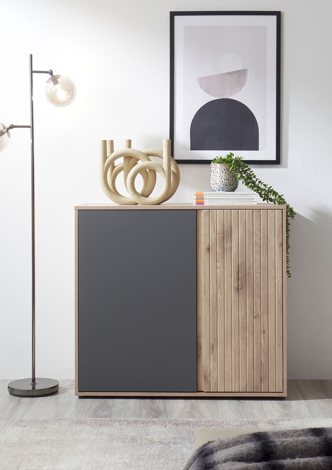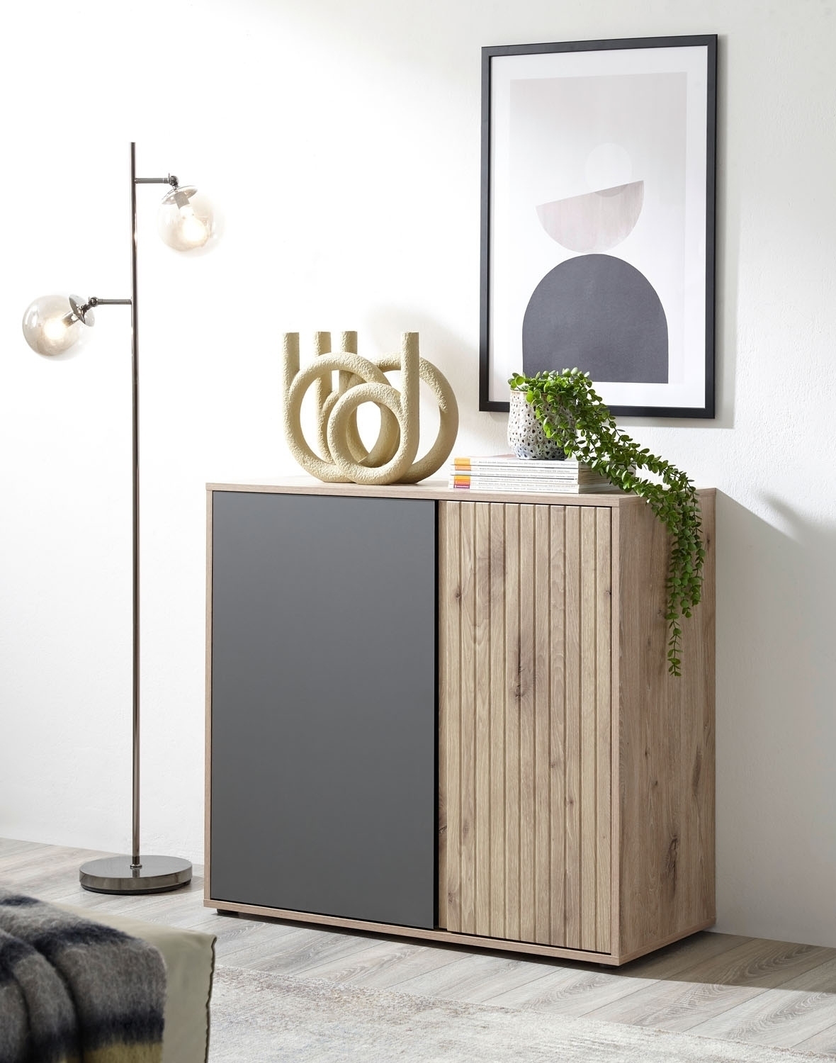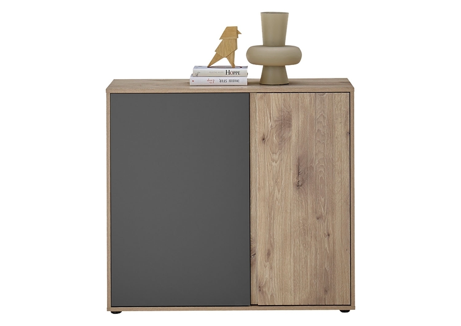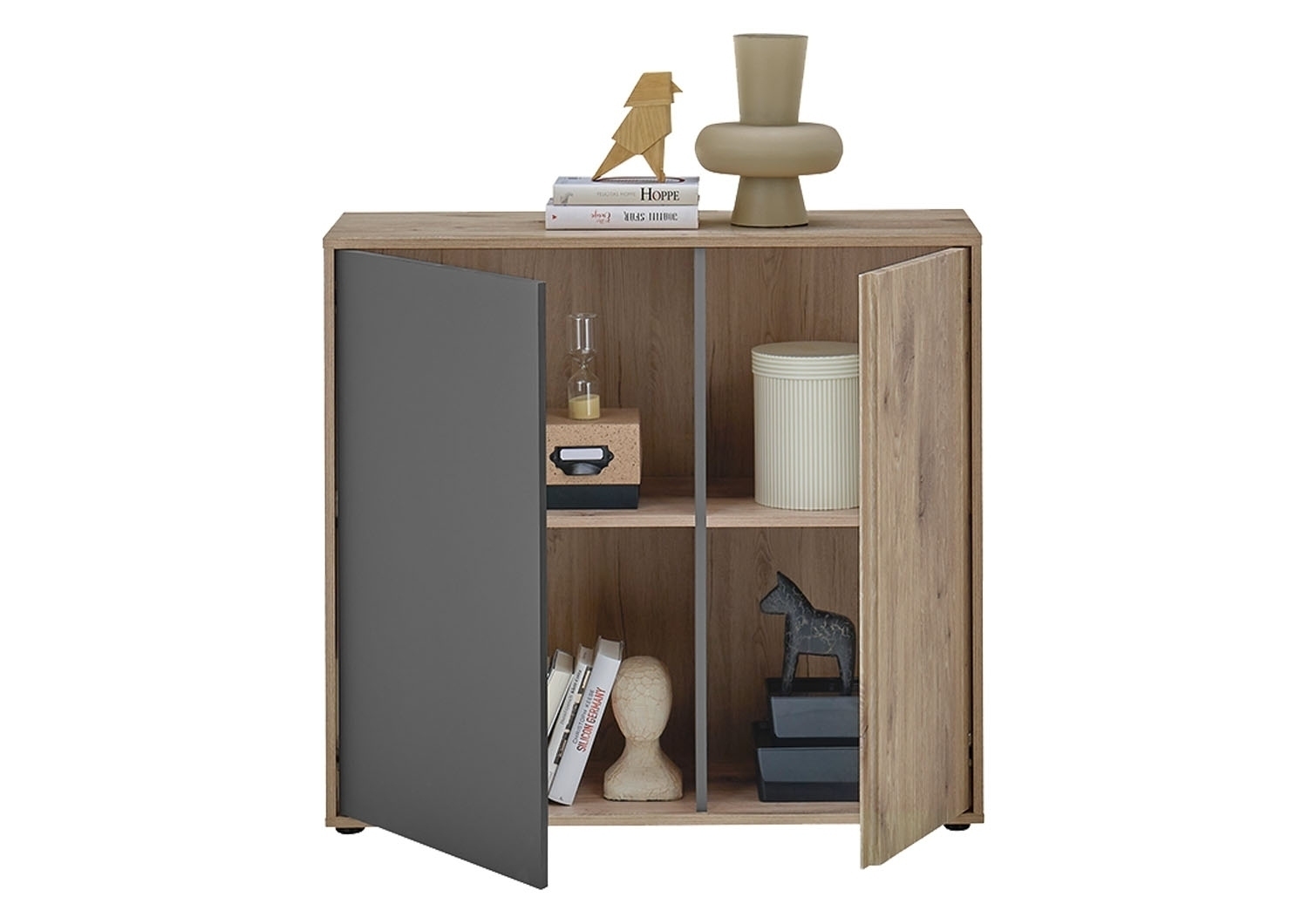 Die Kommode NICOS kombiniert stilvolles Design in Viking Eiche Dekor mit eleganter, grauer Teilfront in matt. Es bietet eine Breite von 94 cm, eine Höhe von 85 cm und eine Tiefe von 38 cm, wodurch es sich ideal in verschiedene Wohnräume einfügt. Die Kommode verfügt über zwei Türen. Zusätzlich sind zwei höhenverstellbare Einlegeböden integriert, die für flexible Stauraummöglichkeiten sorgen.