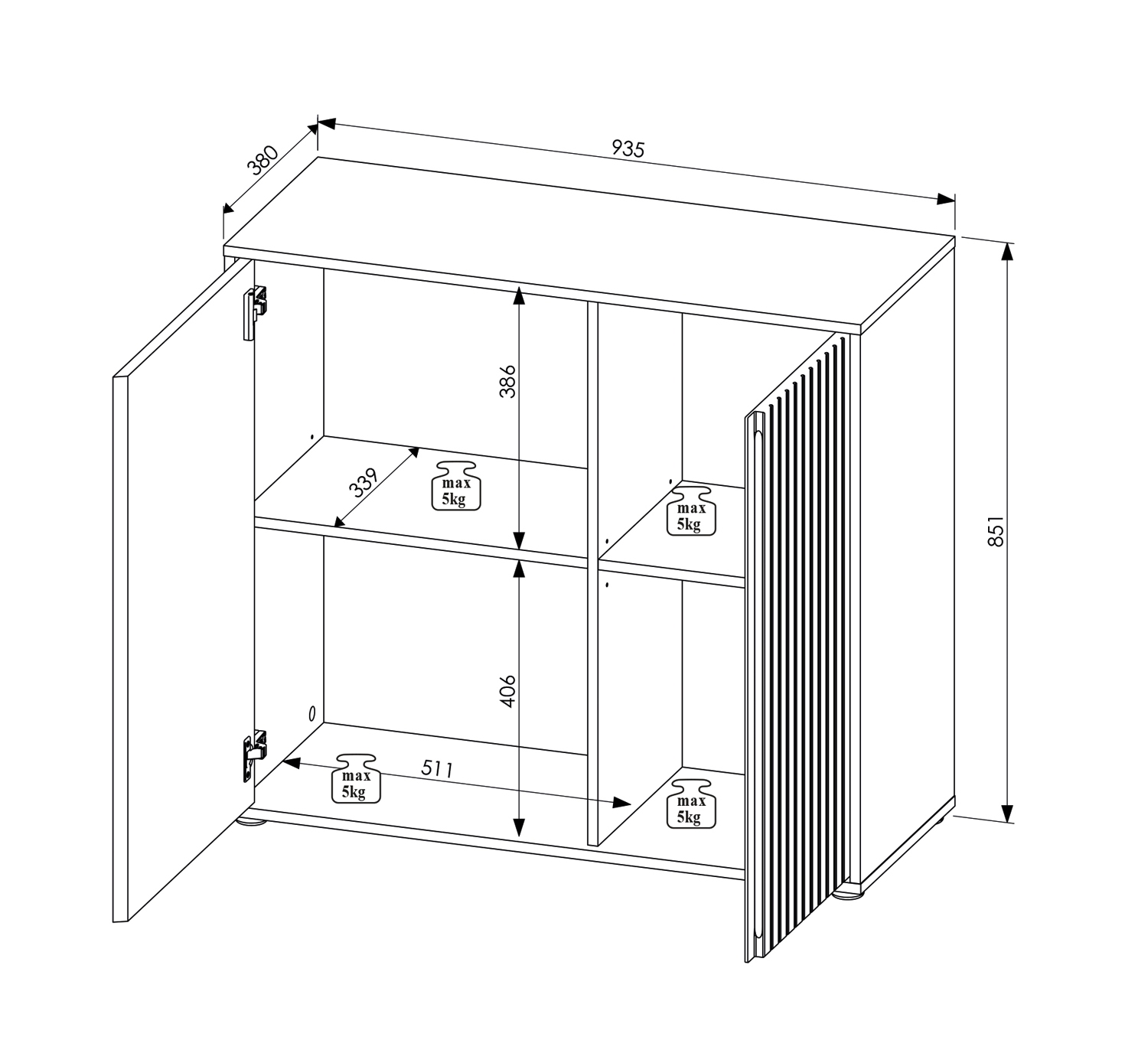| Lieferumfang: | 1 Kommode mit 2 Türen und 2 dreifach höhenverstellbaren Einlegeböden |