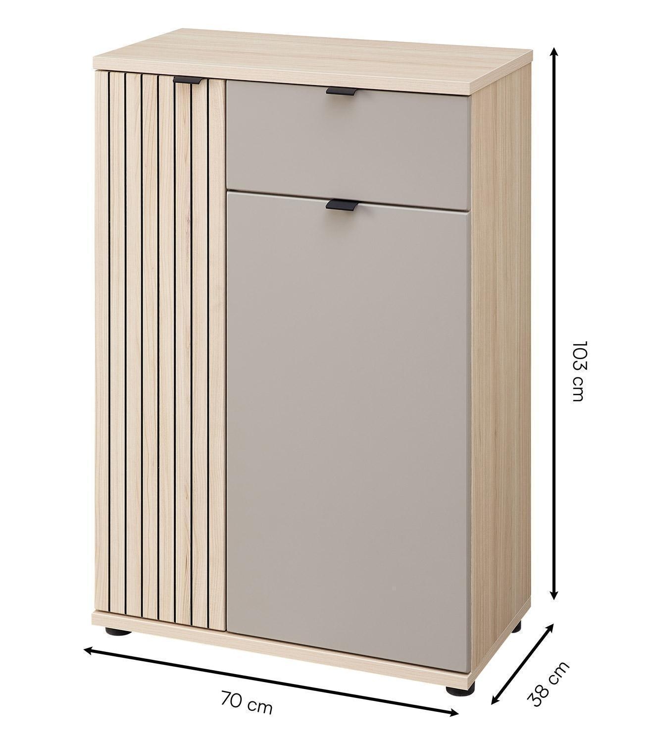 Die Kommode PISOLO ist im Riva Eiche Dekor ausgeführt und mit Fronten in Basalt sowie Riva Eiche Dekor gestaltet. Sie verfügt über zwei Türen mit Soft-Close-Funktion und eine Schublade, die ebenfalls mit Soft-Close ausgestattet ist. Im Inneren befinden sich drei Einlegeböden, die Stauraum für unterschiedliche Gegenstände bieten. Die Kommode hat eine Breite von 70 cm, eine Höhe von 103 cm und eine Tiefe von 38 cm. Die Griffe bestehen aus Metall in Schwarz.