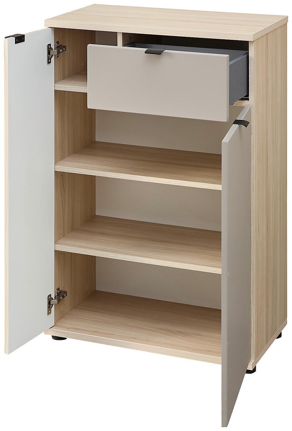 | Lieferumfang: | 1 Schuhschrank mit 2 Türen, 1 Schublade 1 festem Einlegeboden und 2 dreifach höhenverstellbaren Einlegeböden |