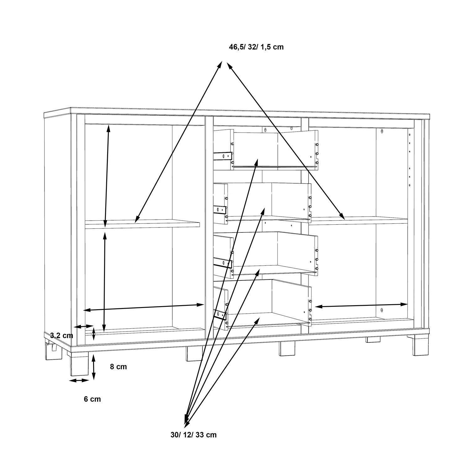 | Lieferumfang: | 1 Kommode mit 2 Türen, 4 Schubladen und 2 mehrfach höhenverstellbaren Einlegeböden |