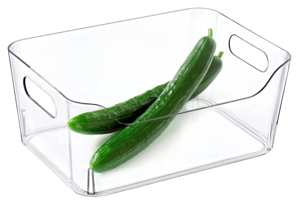 Die transparente Kühlschrankbox VARARIE aus robustem Kunststoff ist ideal zur Aufbewahrung von frischen und verpackten Lebensmitteln. Mit seitlichen Griffen ausgestattet, lässt sie sich leicht handhaben und reinigen. Ihr Fassungsvermögen von 5 Litern bietet ausreichend Platz, um Ordnung im Kühlschrank zu schaffen. Mit einer Breite von 27 cm, einer Höhe von 19 cm und einer Tiefe von 11 cm ist sie vielseitig einsetzbar.