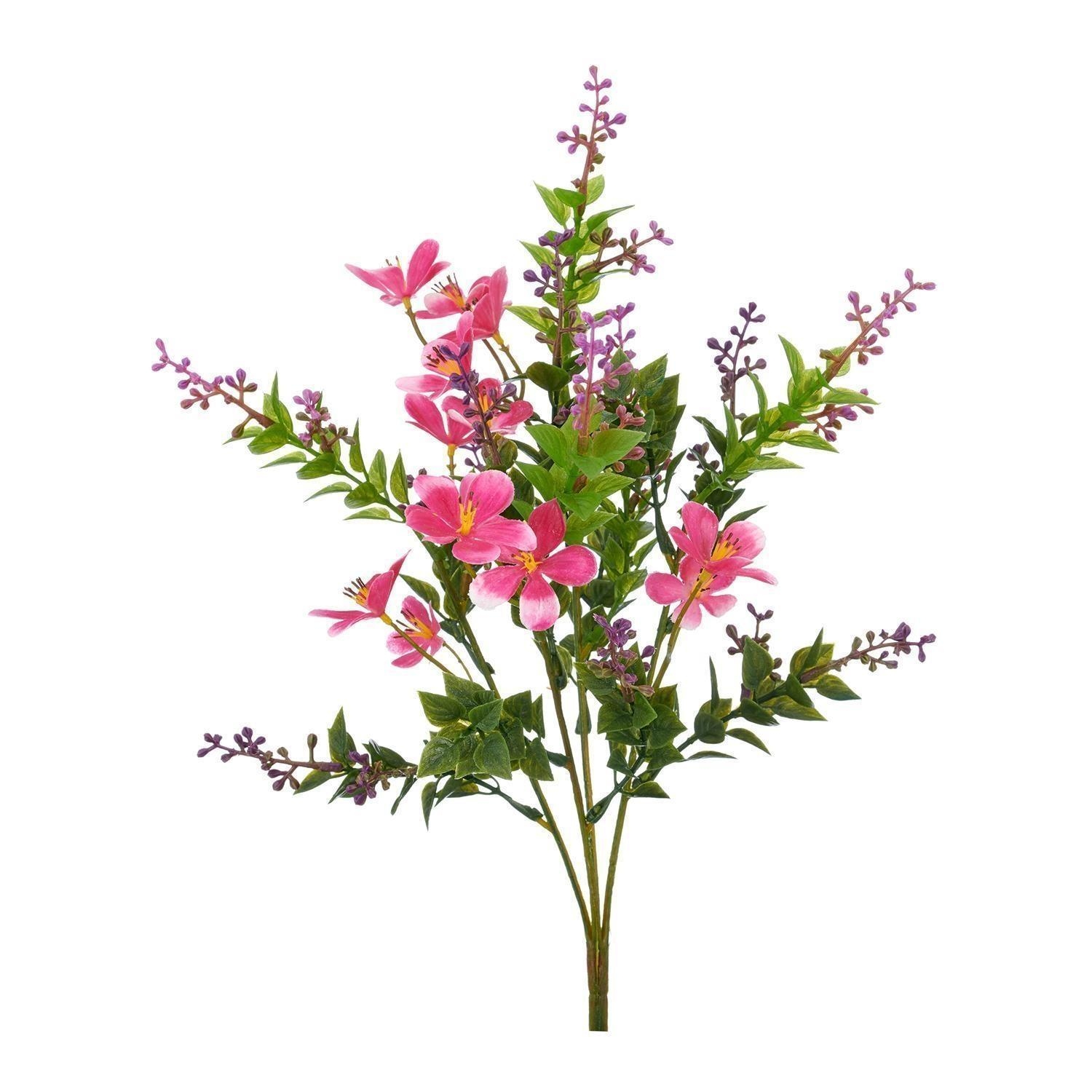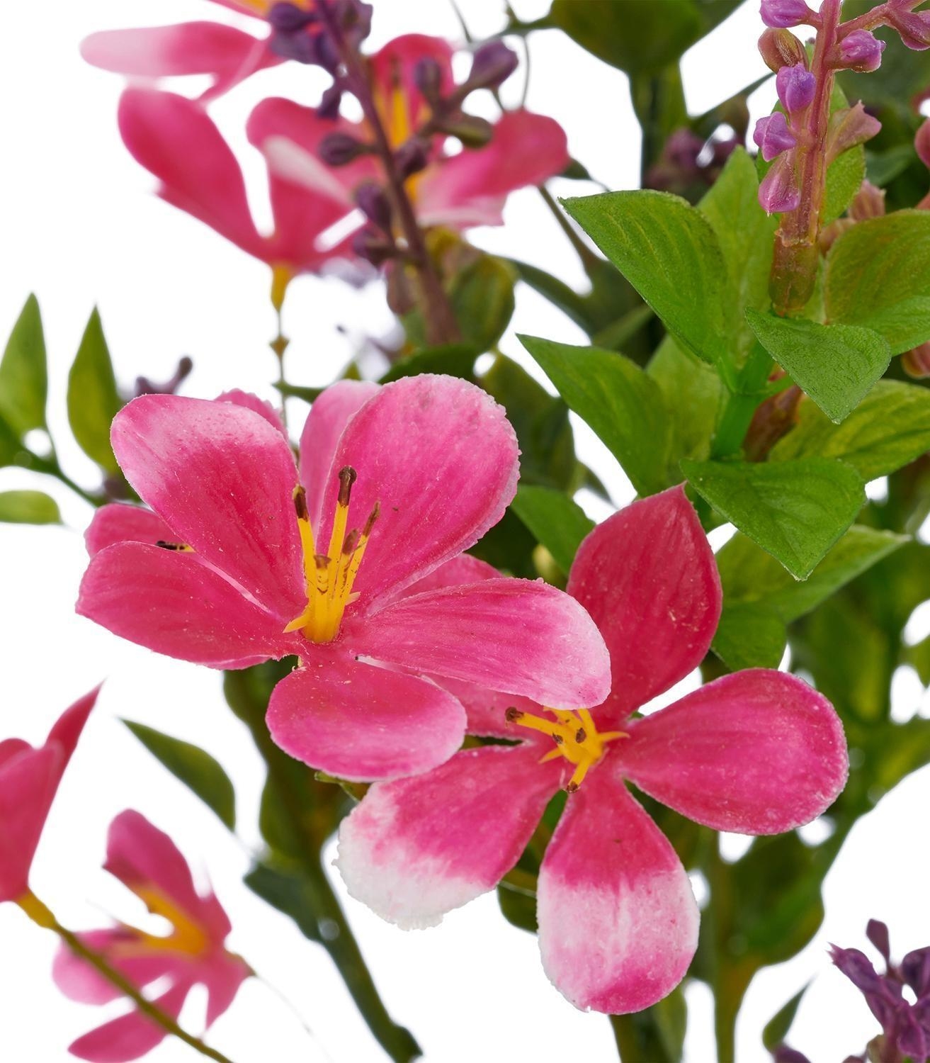 Der künstliche Miniblattbusch BELETA ist in Grün gestaltet und mit pinken Blüten versehen. Die naturgetreue Kunstpflanze besteht aus Kunststoff und weist eine Höhe von 34 cm auf.