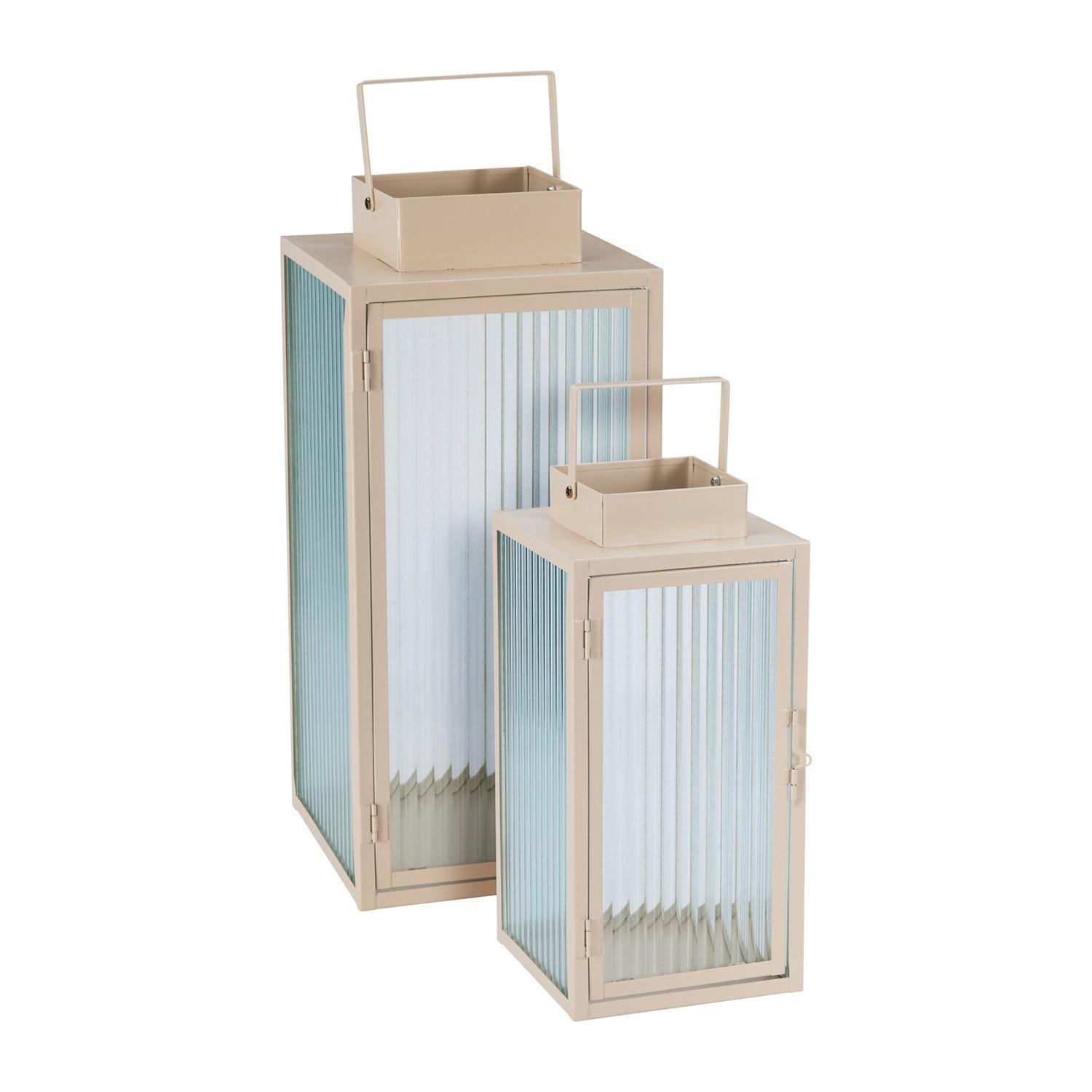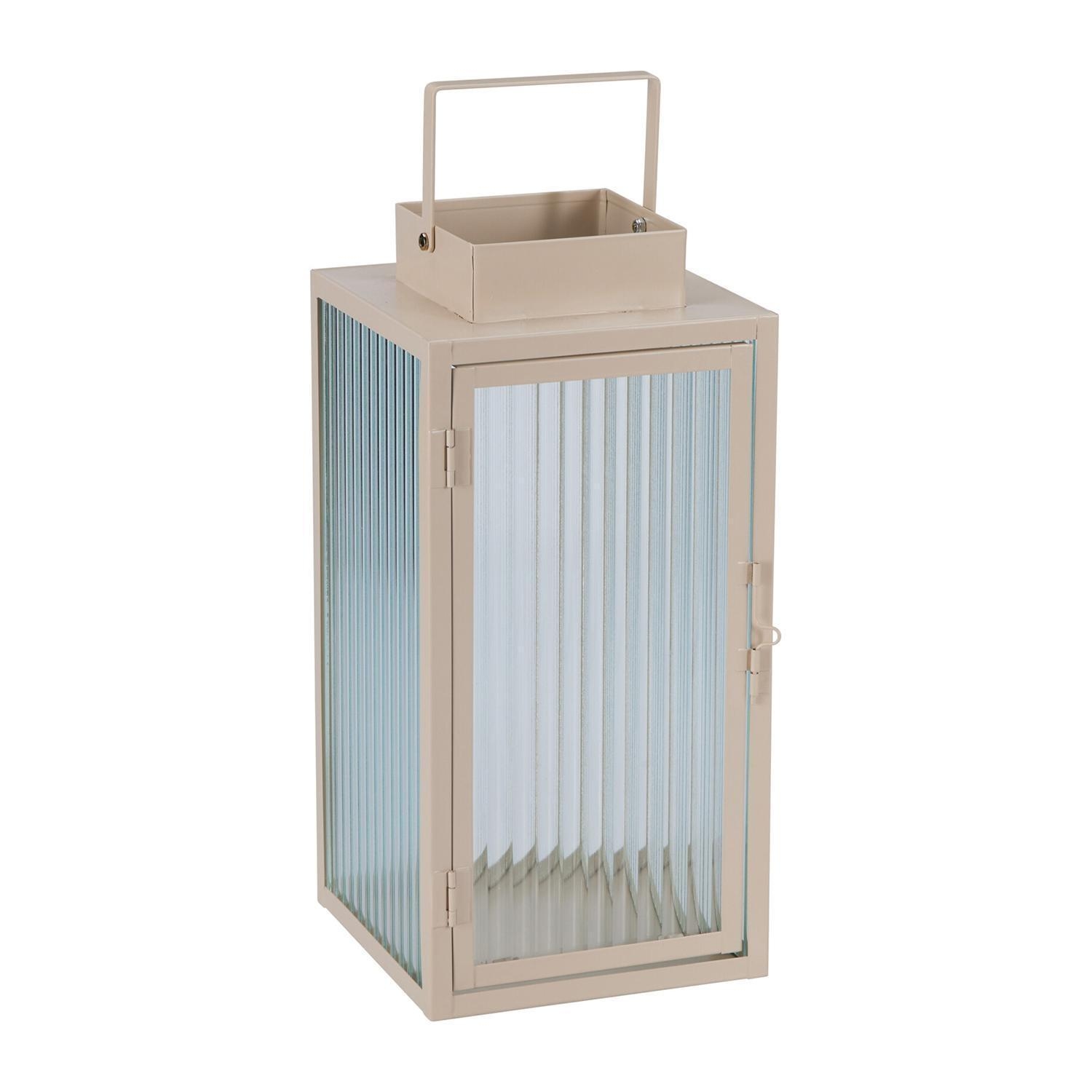 Die Laterne MAILA ist ein elegantes Accessoire für drinnen und draußen. Ihr Gestell und Tragegriff aus robustem Eisen in Beige verleihen ihr Stabilität und Langlebigkeit, während die Wände aus Rillenglas für eine stimmungsvolle Beleuchtung sorgen. Mit einer Höhe von 45 cm und einer Breite sowie Tiefe von je 34 cm bietet sie ausreichend Platz für eine Kerze. Dank der Tür ist das Wechseln der Kerze einfach und unkompliziert.