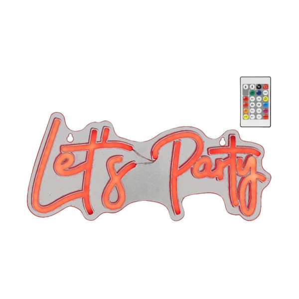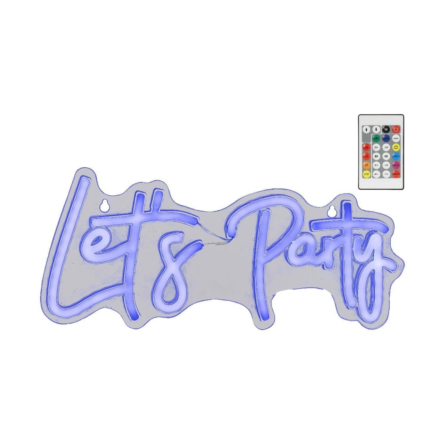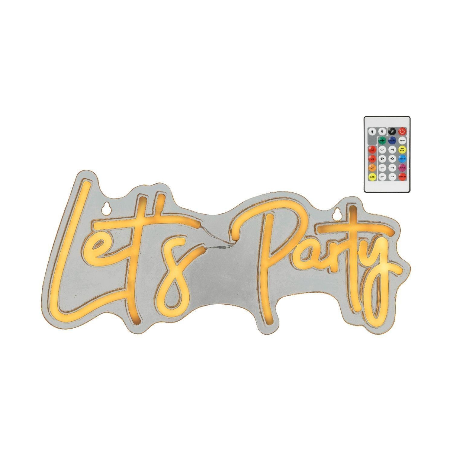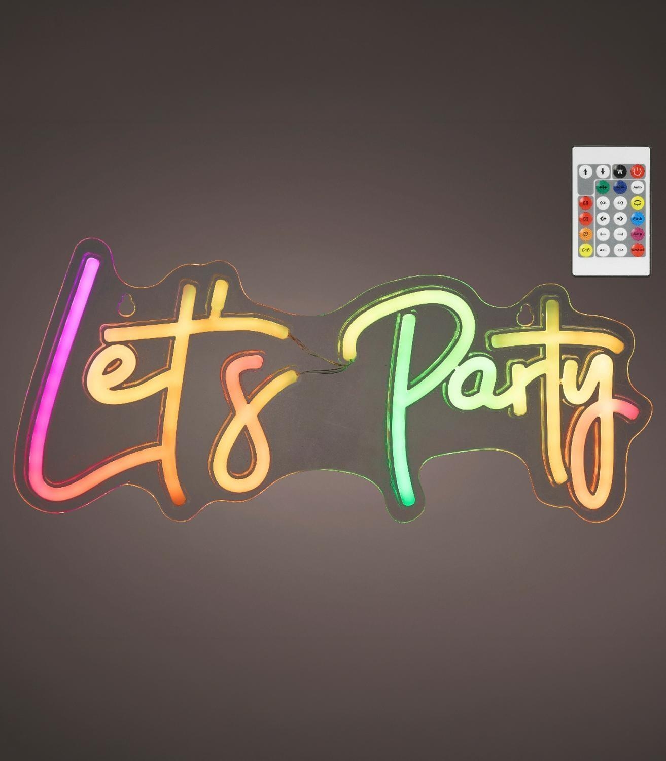 Die LED-Dekoleuchte SIGNS wird aus transparentem Kunststoff gefertigt und präsentiert den Schriftzug „Let's Party“. Diese Effektleuchte besitzt eine Breite von 41 cm, eine Höhe von 18 cm sowie eine Tiefe von 1,6 cm. Über die im Lieferumfang enthaltene Fernbedienung lassen sich ein RGB-Farbwechsel sowie verschiedene einstellbare Farbmuster steuern. Die Gestaltung dieser Lichtdekoration ermöglicht eine individuelle Farbanpassung der Illumination.