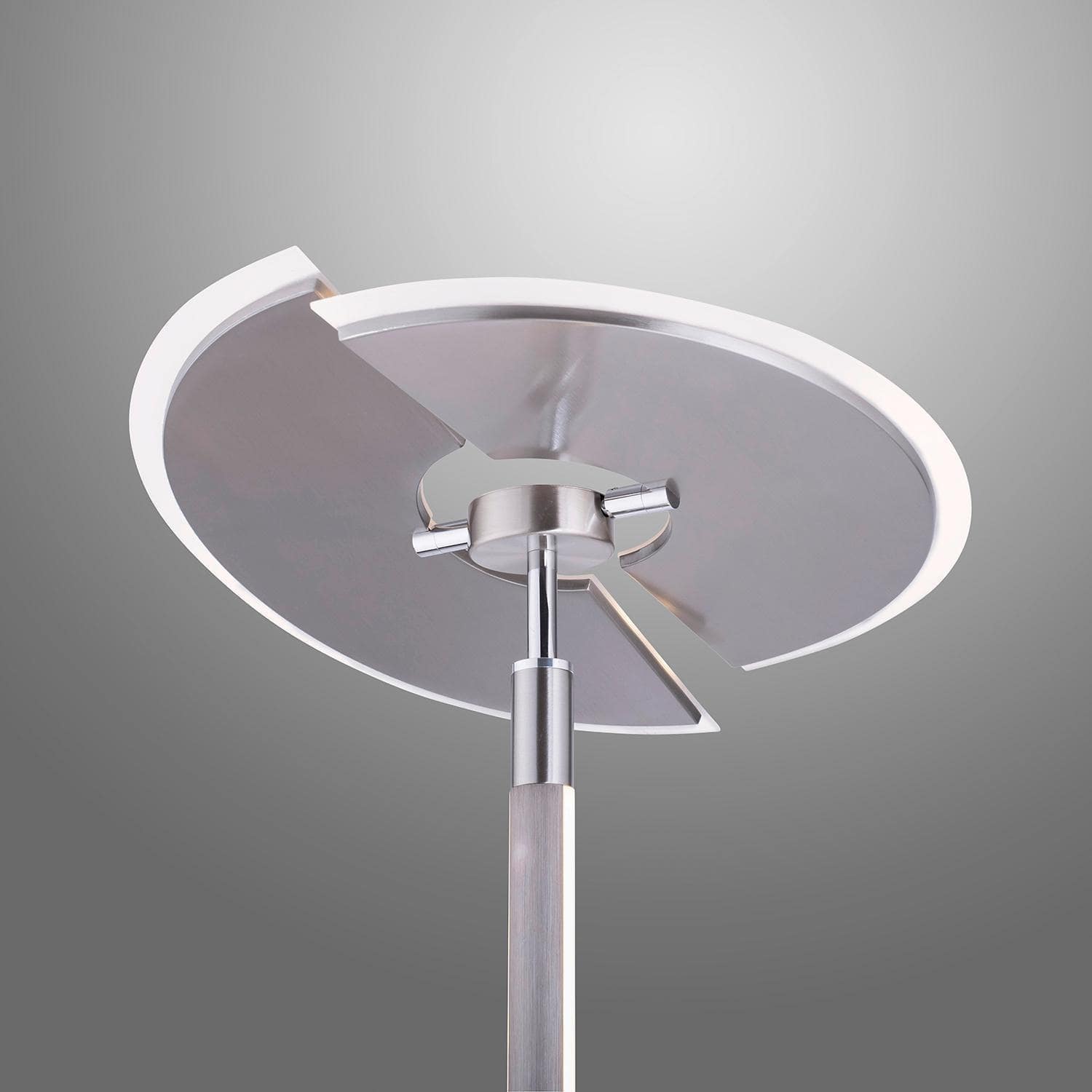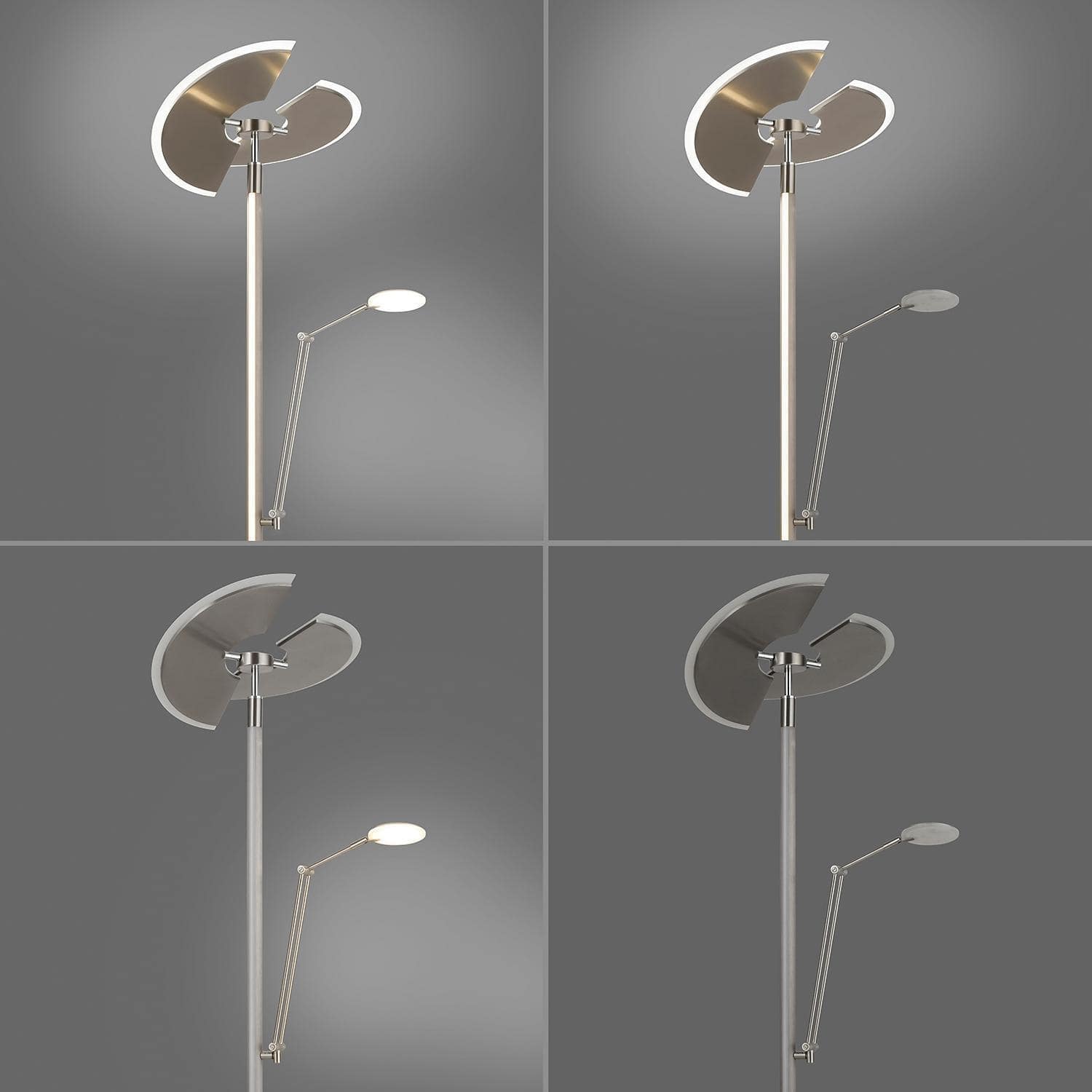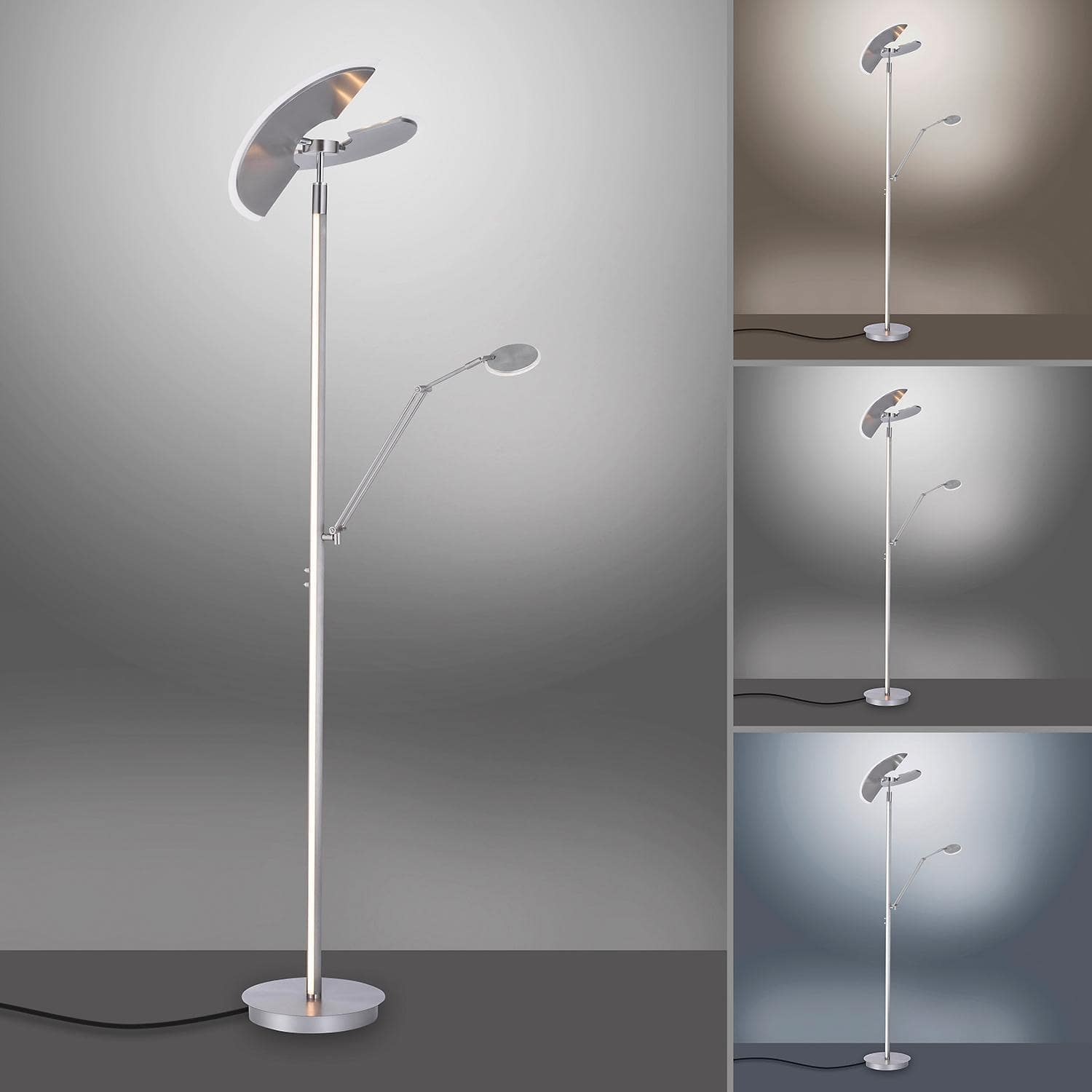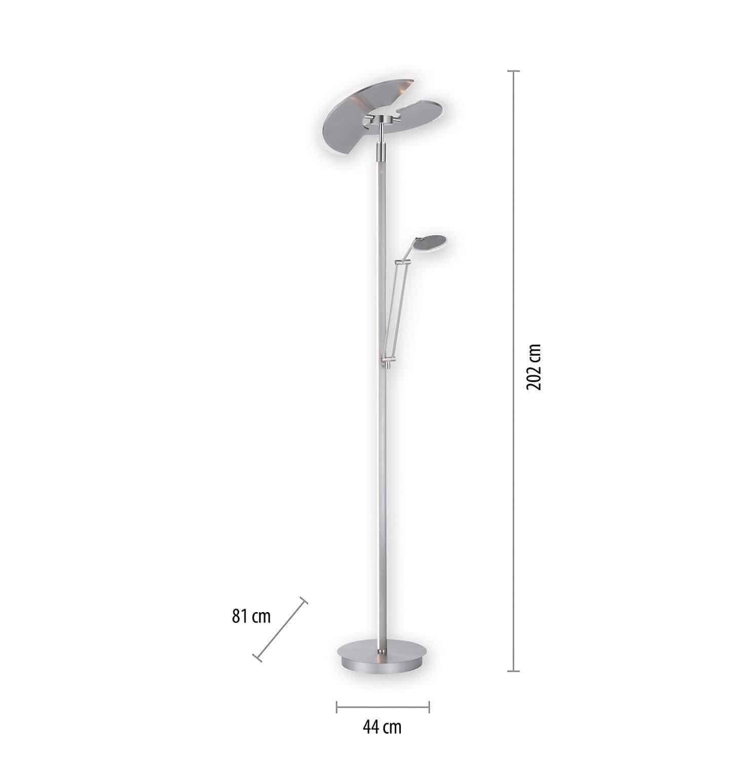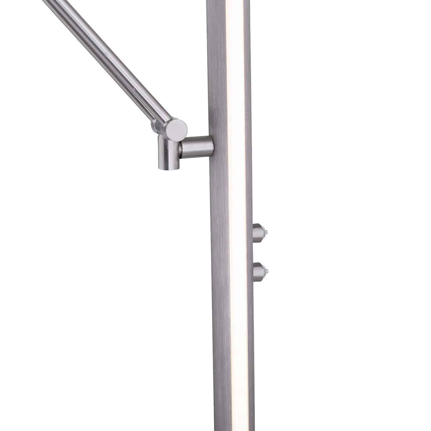 Der LED-Fluter PURE MUTIL der Marke Paul Neuhaus besteht aus Aluminium und Stahl in Silbergrau. Das Hauptlicht ist zweigeteilt und drehbar. Die Leuchte verfügt über eine stufenlos einstellbare Dimmfunktion, die zusammen mit der Anpassung der Farbtemperatur über den Tastdimmer gesteuert wird. Des Weiteren ist eine Memoryfunktion integriert, die nach dem Ausschalten die vorher eingestellten Lichteinstellungen beibehält und nach erneutem Einschalten wieder gibt. Zusätzlich ist ein verstell- und schwenkbarer Lesearm integriert. Der Fluterkopf wird zusammen mit der Rohrbeleuchtung gesteuert, während der Lesearm separat schaltbar ist. Die Leuchte hat eine Breite von 87 cm, eine Höhe von 202 cm und eine Tiefe von 44 cm. Sie ist mit zwei fest verbauten LED-Leuchtmitteln ausgestattet, die nicht austauschbar sind. Die Gesamtleistung beträgt 56 Watt, die Farbtemperatur kann zwischen 2700 und 5000 Kelvin variiert werden, und die Helligkeit liegt bei 7000 Lumen.