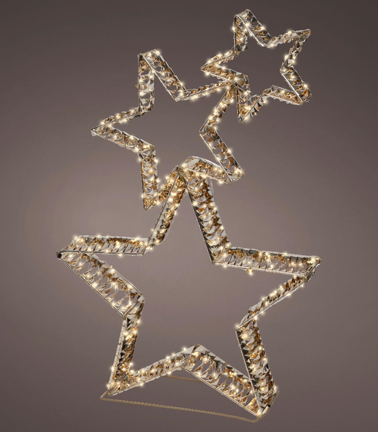 Der LED-Stern EMMELY besteht aus Glas und Metall in Goldgelb und hat eine Breite von 51 cm, eine Höhe von 80 cm und eine Tiefe von 10 cm. Die Beleuchtung erfolgt batteriebetrieben über insgesamt 350 LED-Leuchtmittel. Der Stern ist mit einem Blinkeffekt sowie einer integrierten Timerfunktion ausgestattet.