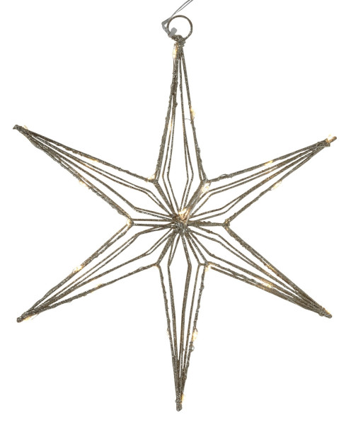 Der LED-Weihnachtsstern KALIST in Goldgelb besteht aus filigranem Metalldraht und ist mit 25 warmweißen LEDs ausgestattet. Mit einer Breite und Höhe von jeweils 30 cm ist er ideal für weihnachtliche Dekorationen geeignet. Der praktische Timer ermöglicht ein automatisches Ein- und Ausschalten, was den Batterieverbrauch reduziert. Der Stern wird mit 2 AA-Batterien betrieben und bietet eine stimmungsvolle Beleuchtung für festliche Anlässe, ohne auf eine Steckdose angewiesen zu sein.