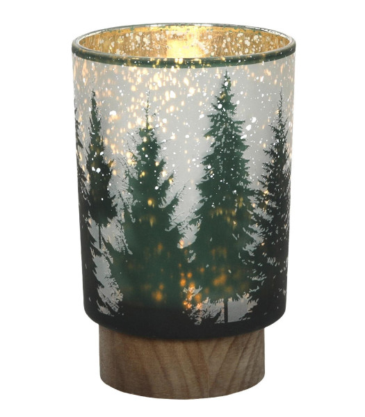 Das LED-Windlicht BRILETTA besteht aus weißem Glas und ist mit Tannenbäumen in Grün verziert. Es verfügt über einen Standfuß aus Holz, der für Stabilität sorgt. Das Windlicht wird batteriebetrieben und ist dadurch flexibel platzierbar. Mit einem Durchmesser von 10 cm und einer Höhe von 15 cm besitzt es ein handliches Format, das sich für verschiedene Dekorationsbereiche eignet.