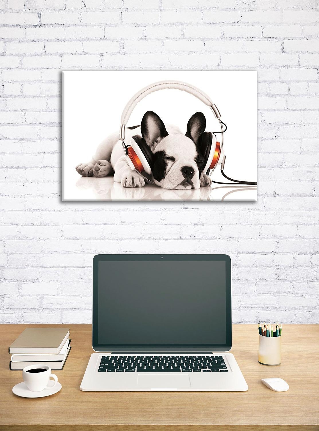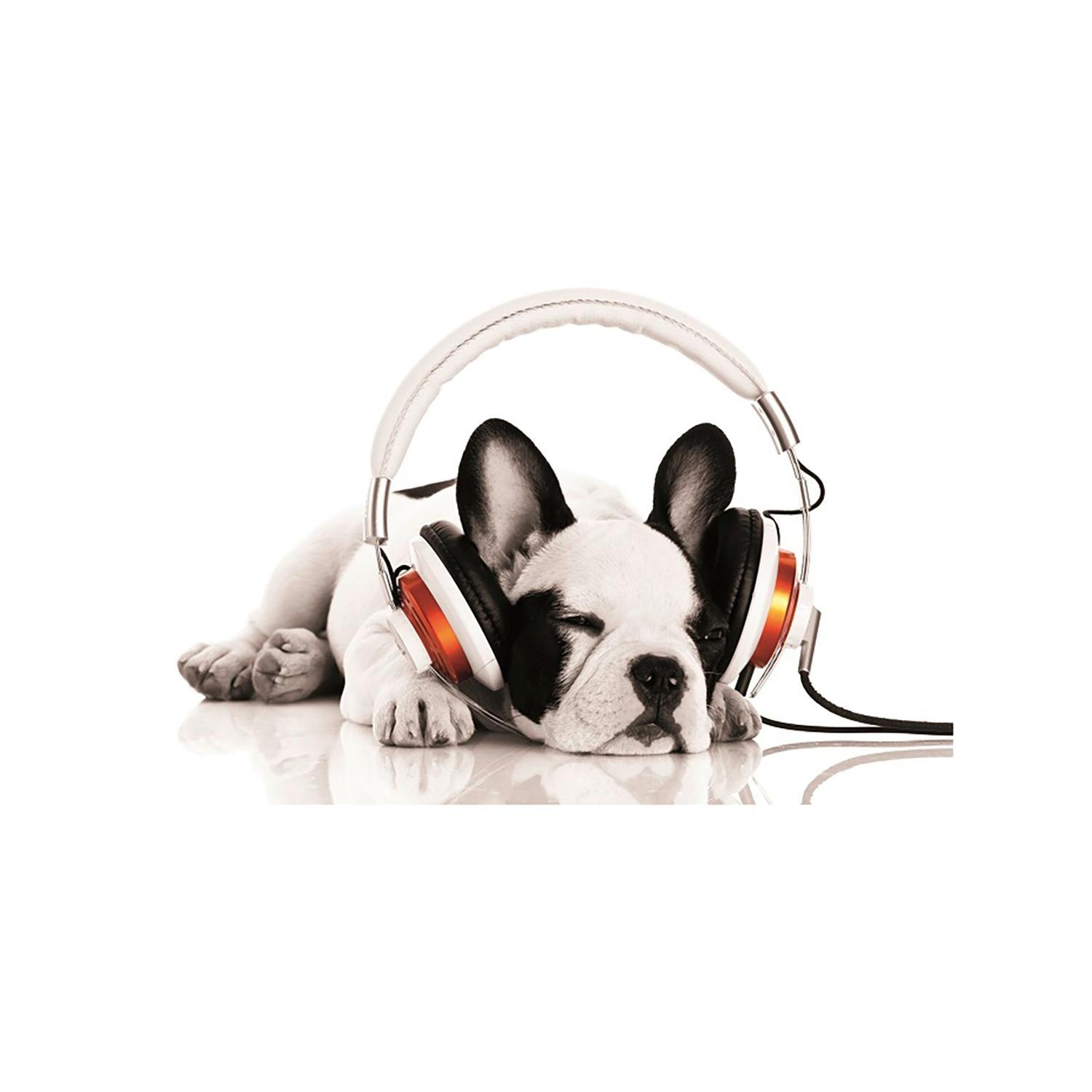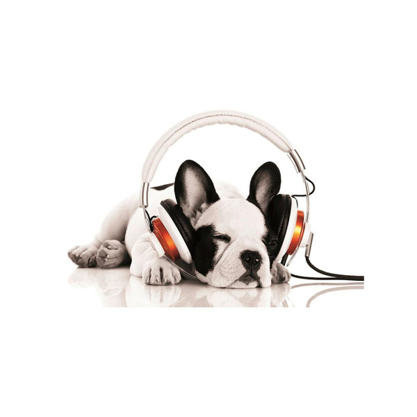 90 x 60 cm - Weiß - Schwarz - Hund mit Kopfhörer