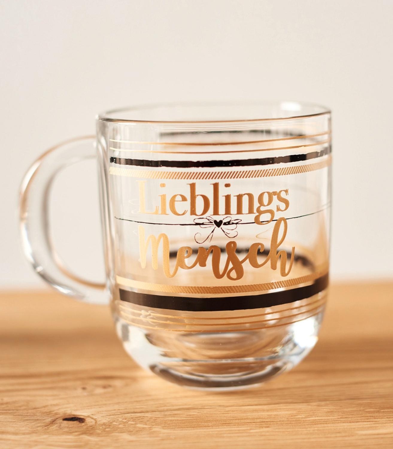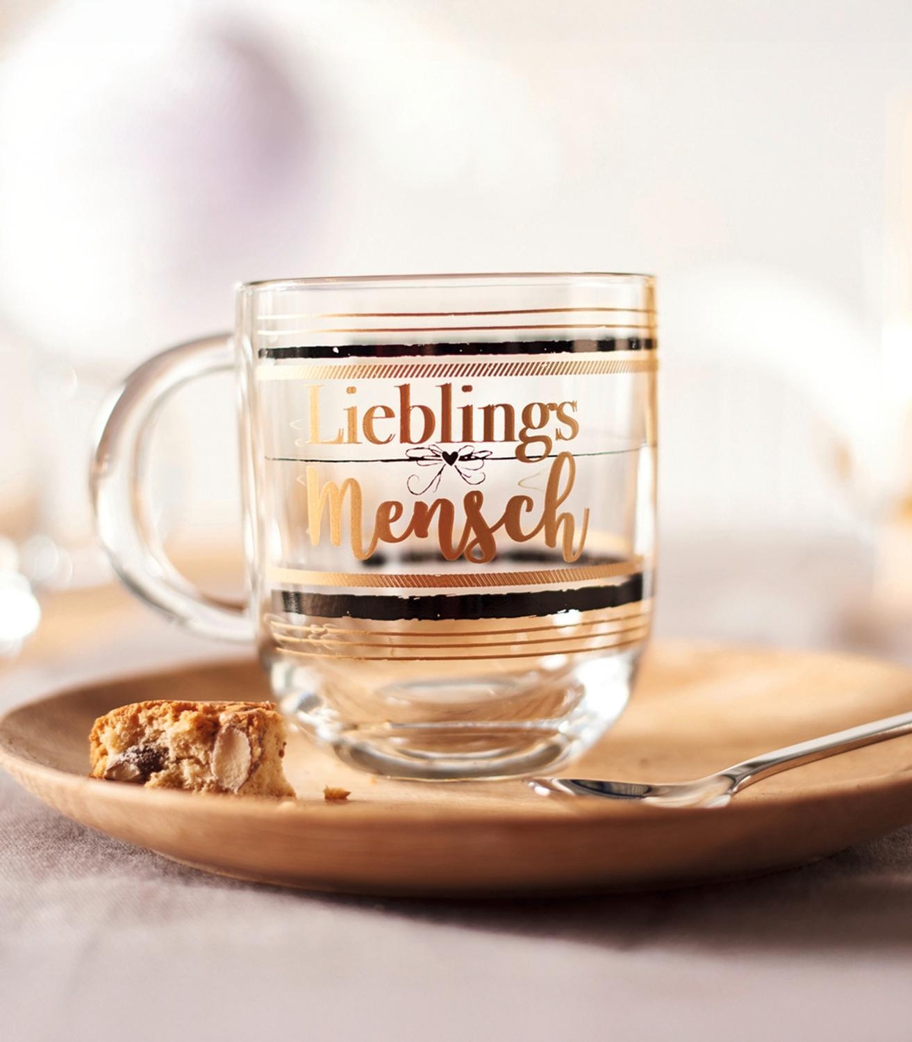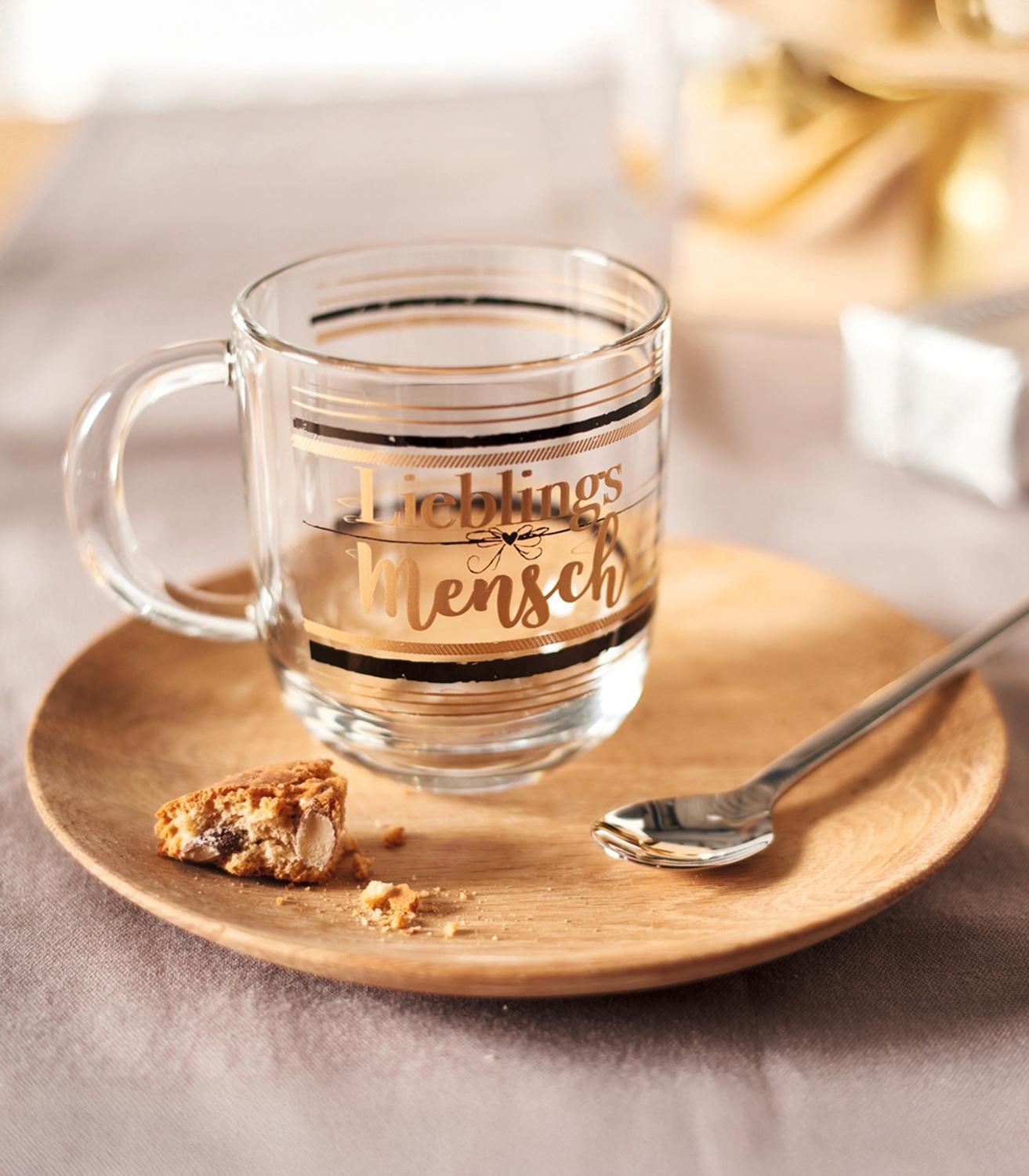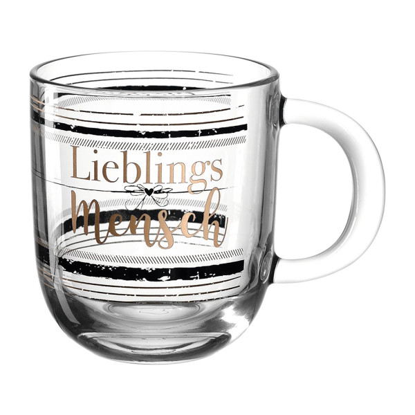 Die Kaffeetasse EMOZIONE von Leonardo besteht aus transparentem Glas und fasst 400 ml, ideal für Kaffee, Tee, Kakao und weitere Heißgetränke. Verziert ist sie mit einem goldgelben Schriftzug sowie Streifen in Schwarz und Goldgelb, die ihr eine moderne, elegante Optik verleihen. Spülmaschinen- und mikrowellengeeignet, überzeugt die Tasse durch Alltagstauglichkeit und stilvolles Design – perfekt für genussvolle Momente.