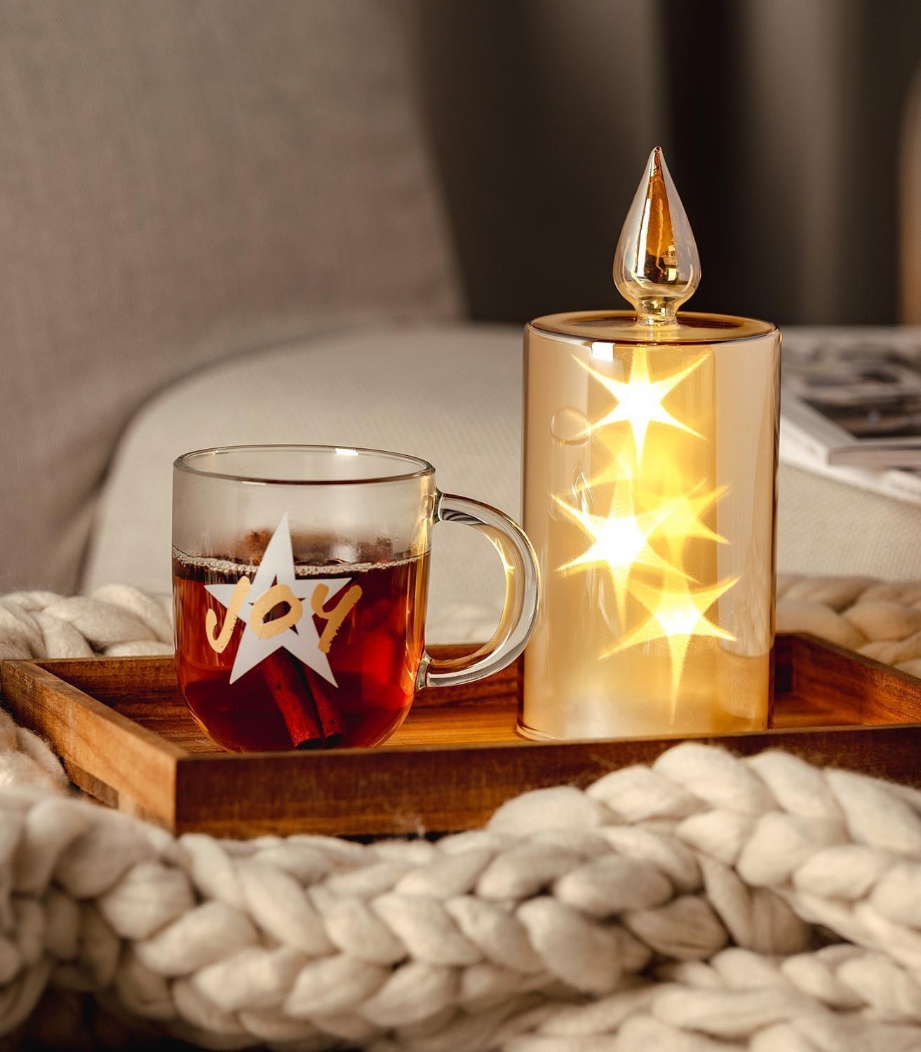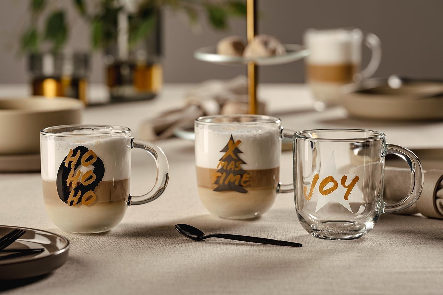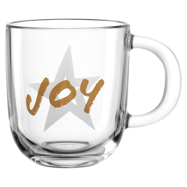 Die Kaffeetasse SILENZIO von Leonardo ist aus transparentem Glas gefertigt und bietet eine Füllmenge von 400 ml. Sie eignet sich perfekt für Kaffee, Tee, Kakao und vieles mehr. Der Schriftzug "JOY" in Braun auf einem schwarzen Sternmotiv verleiht ihr eine freundliche Note. Diese Tasse ist spülmaschinen- und mikrowellengeeignet und besitzt einen seitlichen Henkel für komfortables Halten. Mit Maßen von 14 cm Breite, 8,7 cm Tiefe und 15 cm Höhe bietet sie ausreichend Platz für Ihr Lieblingsheißgetränk.