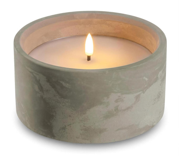 Die LED-Kerze SILENZIO von Leonardo besteht aus weißem Kunststoff und wird in einem grauen Beton-Kerzenhalter geliefert. Sie hat einen Durchmesser von 15 cm und eine Höhe von 8 cm. Betrieben wird die Kerze mit Batterien und sie ist mit einem Timer ausgestattet.