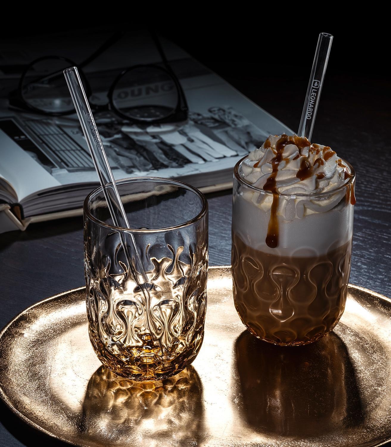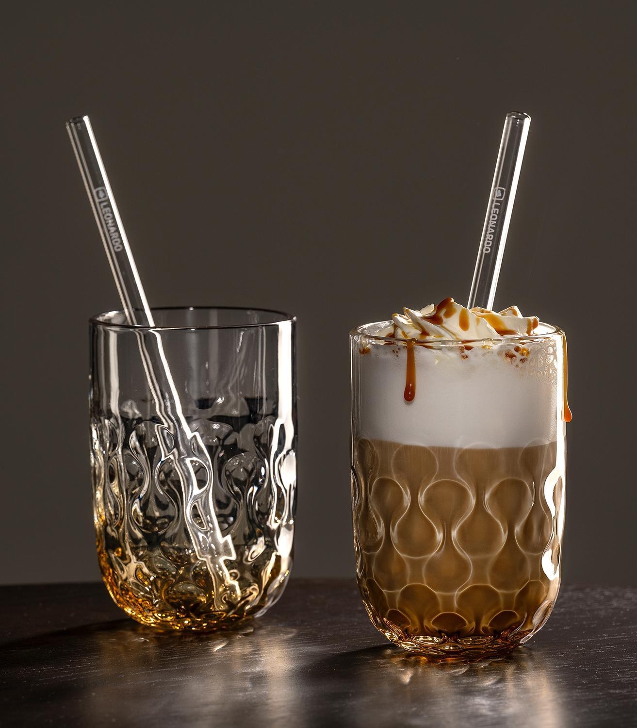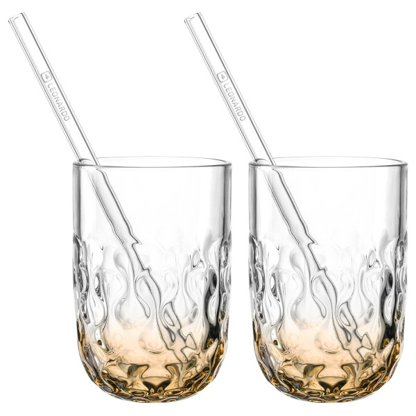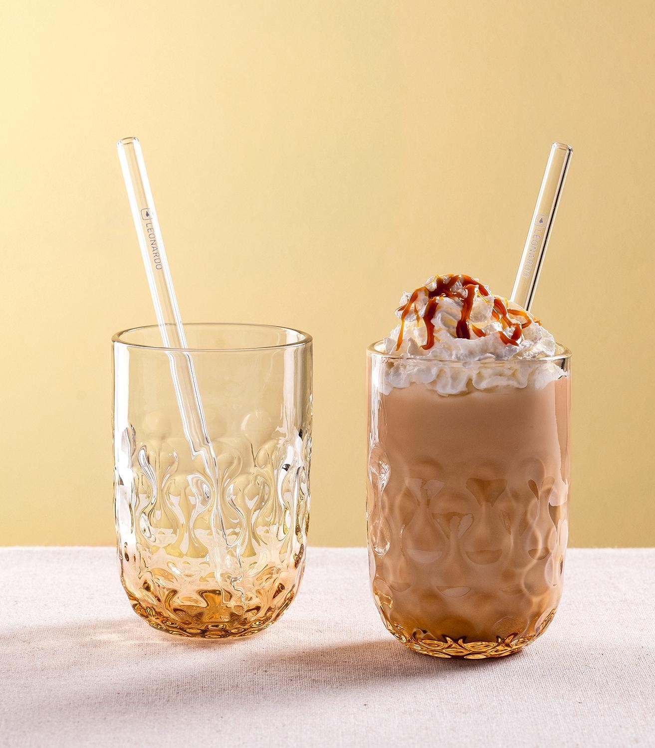 Das 4-teilige Trinkgläser-Set GOCCE der Marke Leonardo besteht aus apricotfarbenem und transparentem Glas und ist mit einem feinen Relief verziert. Die Trinkgläser fassen jeweils 390 ml. Das Set beinhaltet zwei Gläser mit zwei dazu passenden Glastrinkhalmen. Das Gläserset ist für heiße und kalte Getränke geeignet, zudem spülmaschinenfest und hitzebeständig. Der Durchmesser beträgt für jedes Matcha-Latte-Glas 7,9 cm mit einer Höhe von 11,9 cm.