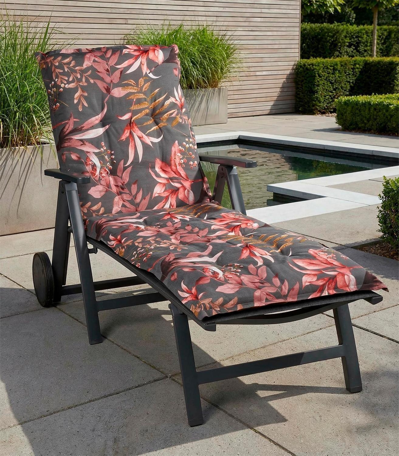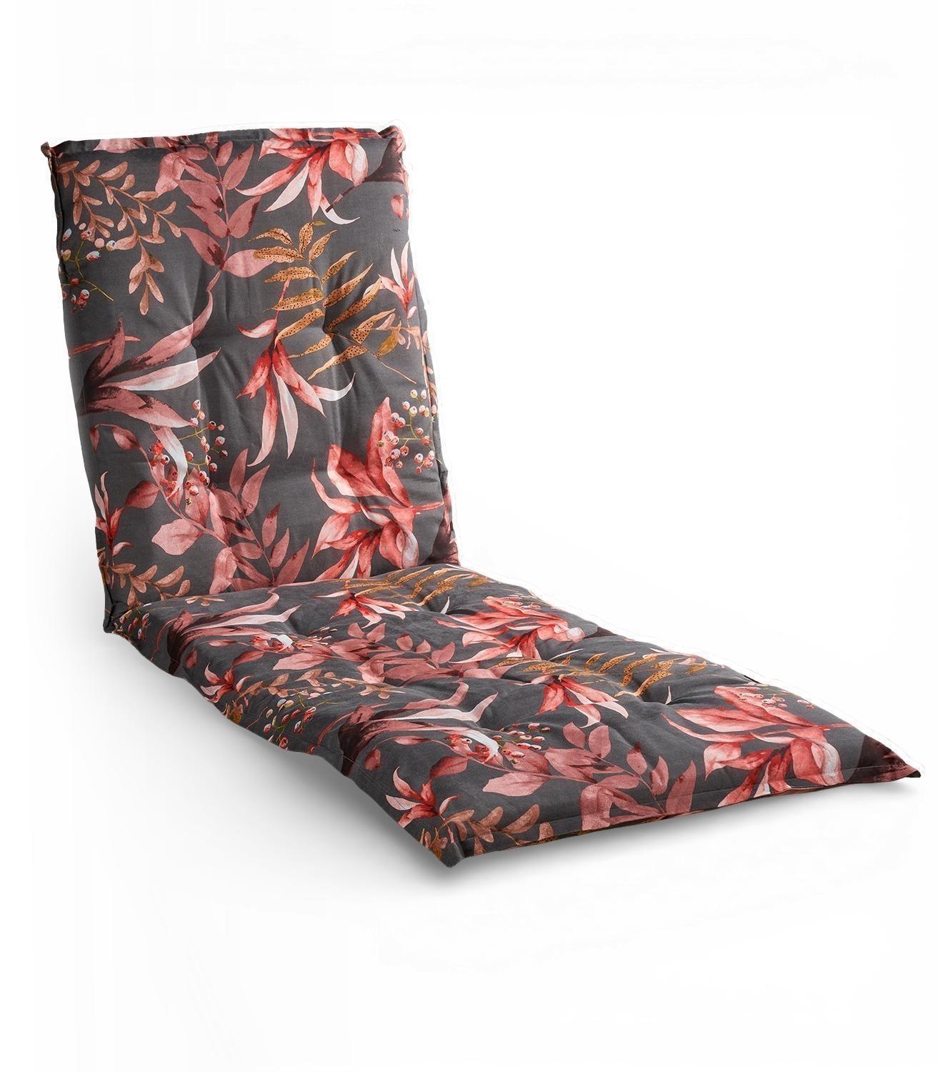 Die Liegenauflage DIMITRA von GO-DE überzeugt mit einem roten Blütenmuster auf anthrazitfarbenem Grund und sorgt für stilvollen Komfort im Garten. Mit einer Größe von 60 x 7 x 190 cm ist sie ideal für Gartenliegen geeignet. Gefertigt aus 65 % Polyester und 35 % Baumwolle bietet sie angenehmen Liegekomfort. Verstellbares Gurtband und seitliche Bindekordeln sorgen für sicheren Halt. Knopfsteppung und umlaufender 2 cm Stehsaum runden das Design ab. Made in Germany, Handwäsche empfohlen.