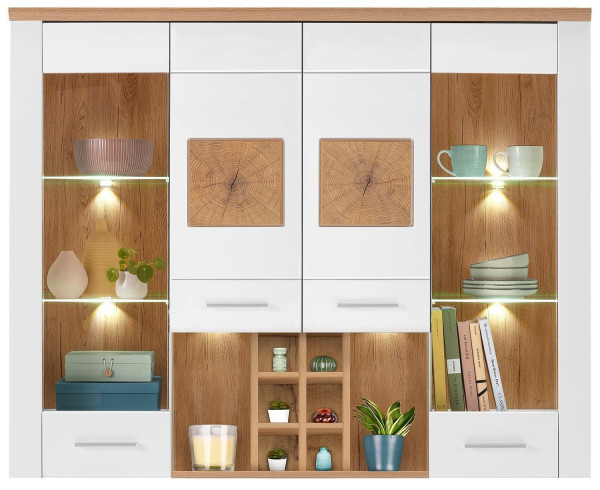 Der Sideboard-Aufsatz MATERA der Marke LIV’IN ist in Weiß supermatt gestaltet und verfügt über eine Oberplatte sowie Absetzungen in Eiche Altholz Dekor. Diese Aufsatzlösung ist mit zwei Türen inklusive Glasteilfronten sowie zwei Türen mit Soft-Close-Funktion ausgestattet. Das Möbelstück weist vier Glasböden, zwei Einlegeböden und acht Ablagefächer auf. Die Abmessungen belaufen sich auf eine Breite von 164 cm, eine Höhe von 115 cm sowie eine Tiefe von 39 cm. Die LED-Beleuchtung ist mit im Lieferumfang enthalten.