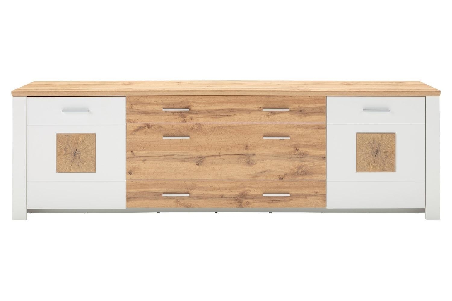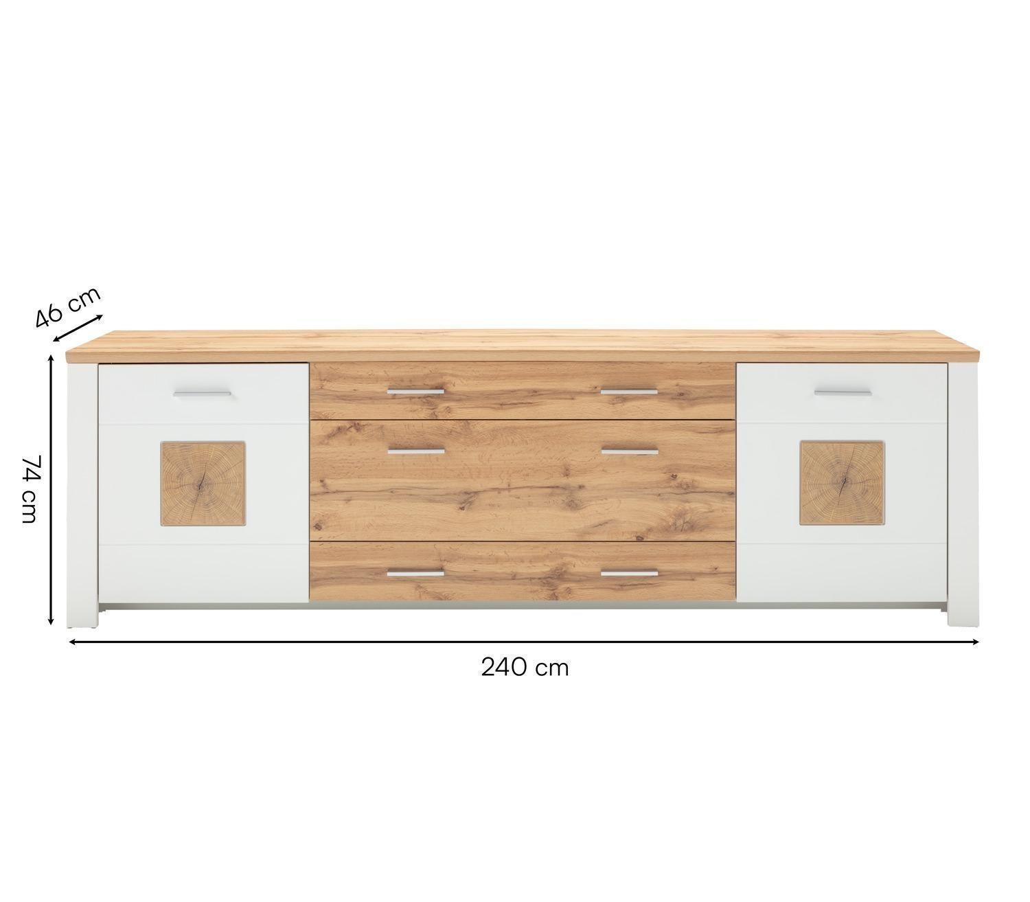 Weiß supermatt Dekor - 240 x 46 cm - Eiche Altholz Dekor - 2 Türen - 3 Schubladen