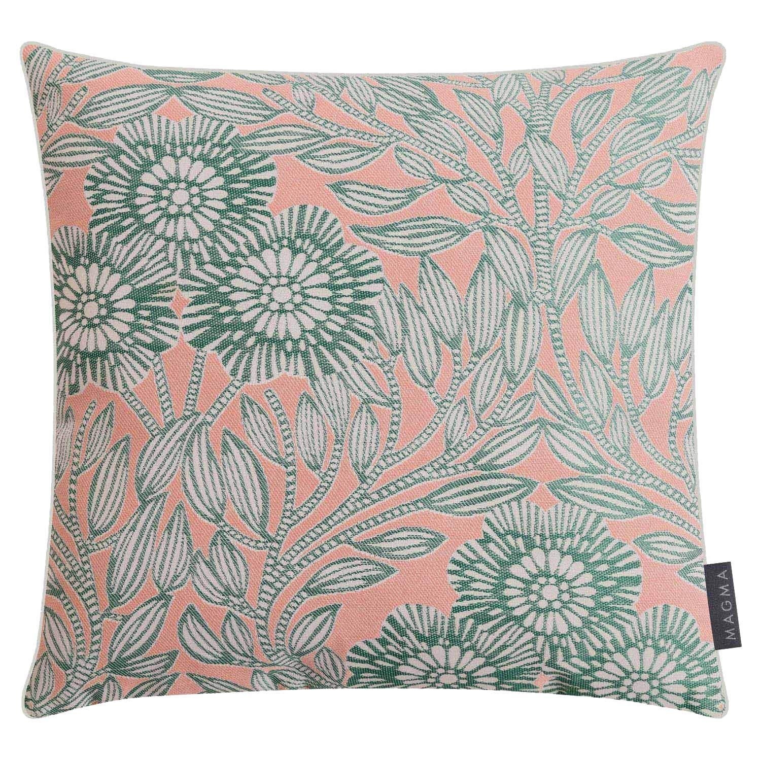 Die Kissenhülle von Magma überzeugt durch ihr stilvolles Design in Pfirsich und Grün, das durch Blumenmotive elegant ergänzt wird. Gefertigt aus Baumwolle und Polyester, bietet die Hülle sowohl Komfort als auch eine ansprechende Optik. Ein praktischer Reißverschluss ermöglicht einfaches Beziehen, und der Keder verleiht dem Kissen eine raffinierte Note. Mit den Maßen von 50 x 50 cm passt sie perfekt auf Standard-Kissen und setzt einen eleganten Akzent in jedem Wohnraum.