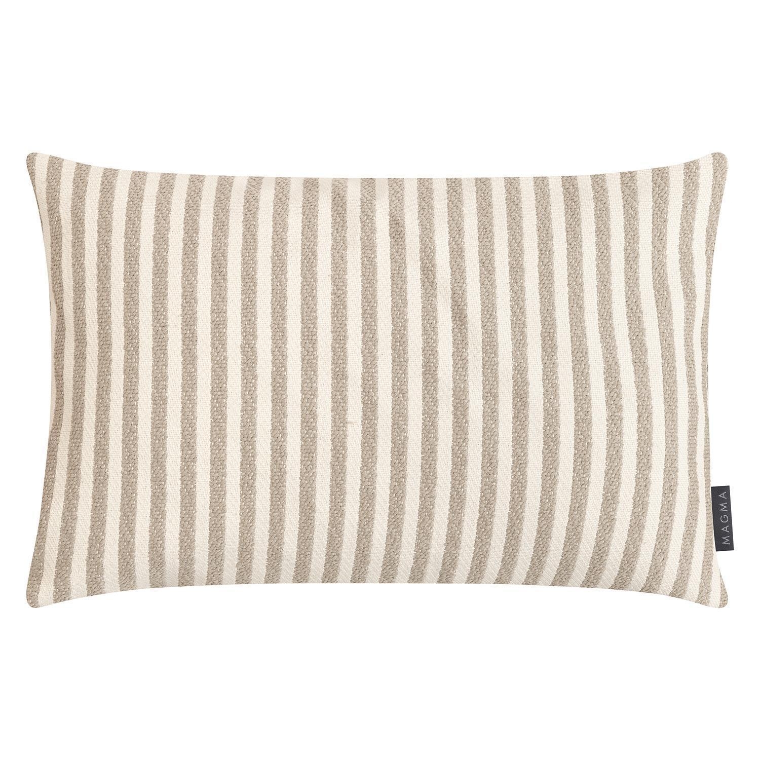 Die Outdoor Kissenhülle PAROS der Marke Magma besteht aus Polypropylen und ist in den Farben Creme sowie Weiß gestaltet. Während die Vorderseite dieses Kissenbezugs mit Streifen gemustert ist, ist die Rückseite einfarbig und ohne Muster gehalten. Das Textil ist schmutz- und wasserabweisend, farbecht sowie lichtbeständig und verfügt über reißfeste Materialeigenschaften. Die Abmessungen dieser Hülle belaufen sich auf eine Länge von 60 cm und eine Breite von 40 cm.