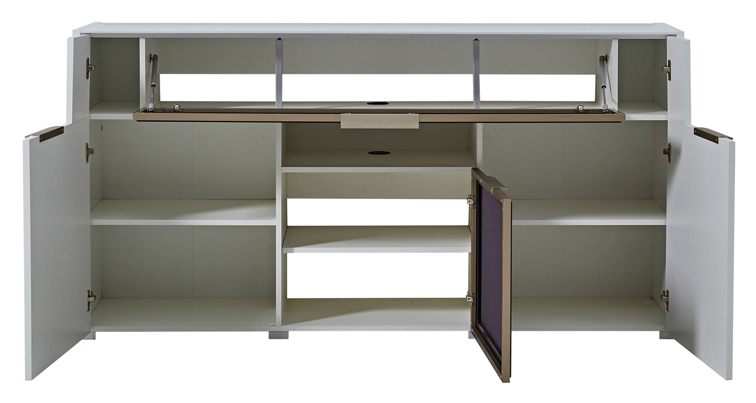 Sowohl die Klappe als auch die mittlere Tür sind mit einem speziellem Bezug mit flammhemmenden Akustikstoff versehen. Dadurch kann der Ton aus dahinter liegenden Boxen oder einer Soundbar selbst im geschlossenem Zustand klar und deutlich wiedergegeben werden. Das offene Fach verfügt nach unten und oben je über eine Kabeldurchführung. Ein aus mehreren Teilen bestehendes Soundystem kann so einfach miteinander verbunden werden, ohne das Kabel stören. Durch die offene Rückwand hinter der Klappe und der mittleren Tür sind zudem Strom- und Verbindungskabel versteckt verlegbar.