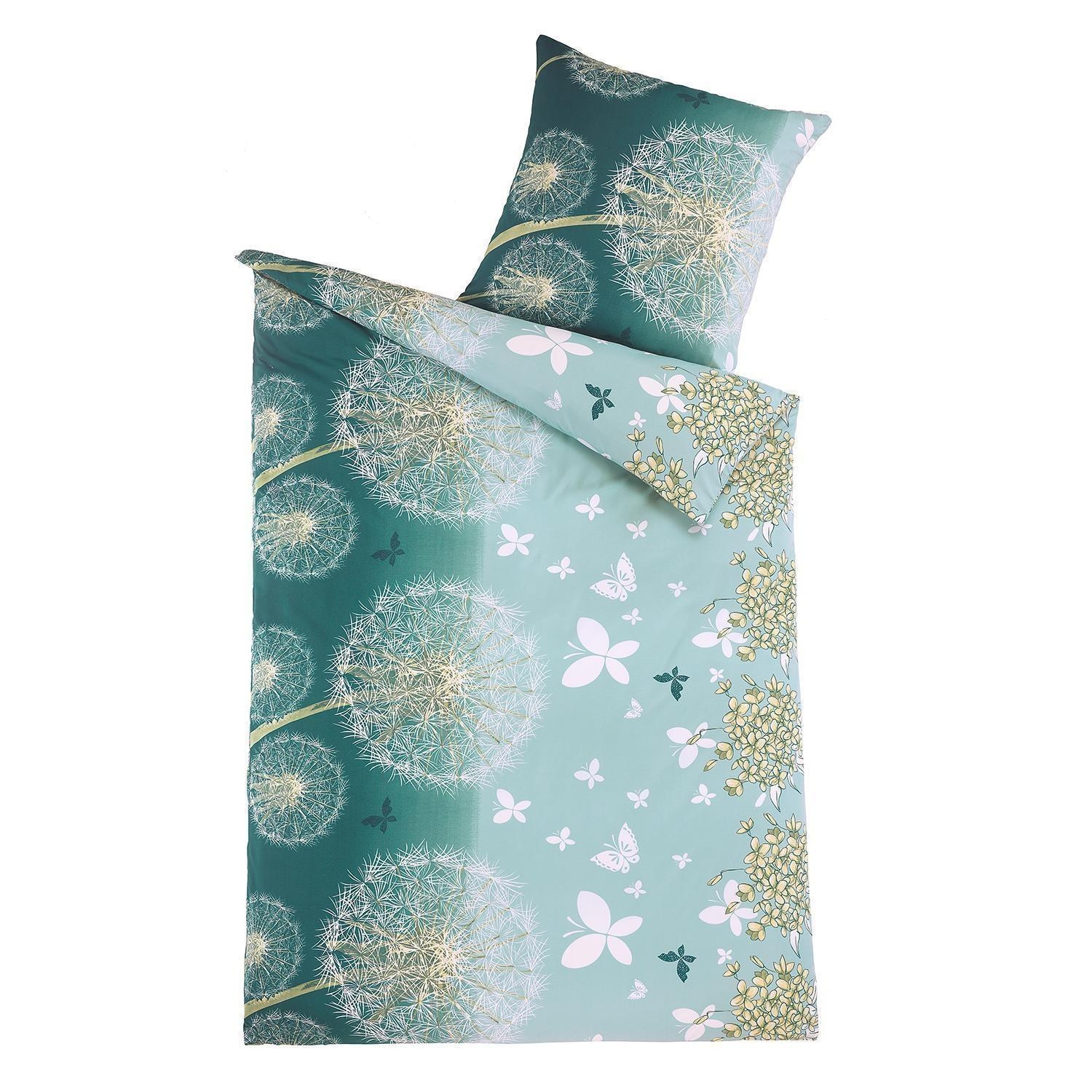Die Mikrofaser-Bettwäsche DANDELION ist in Türkis gehalten und mit Pusteblumen- und Schmetterlingsmotiven in Weiß und Gelb versehen. Die Bettwäsche besteht aus einem Bettbezug und einem Kissenbezug. Sie hat eine Größe von 135 x 200 cm und ist mit einem praktischen Reißverschluss ausgestattet. Die Bettwäsche ist bis 60 °C waschbar, trocknergeeignet und nach Öko-TEX Standard 100 zertifiziert.