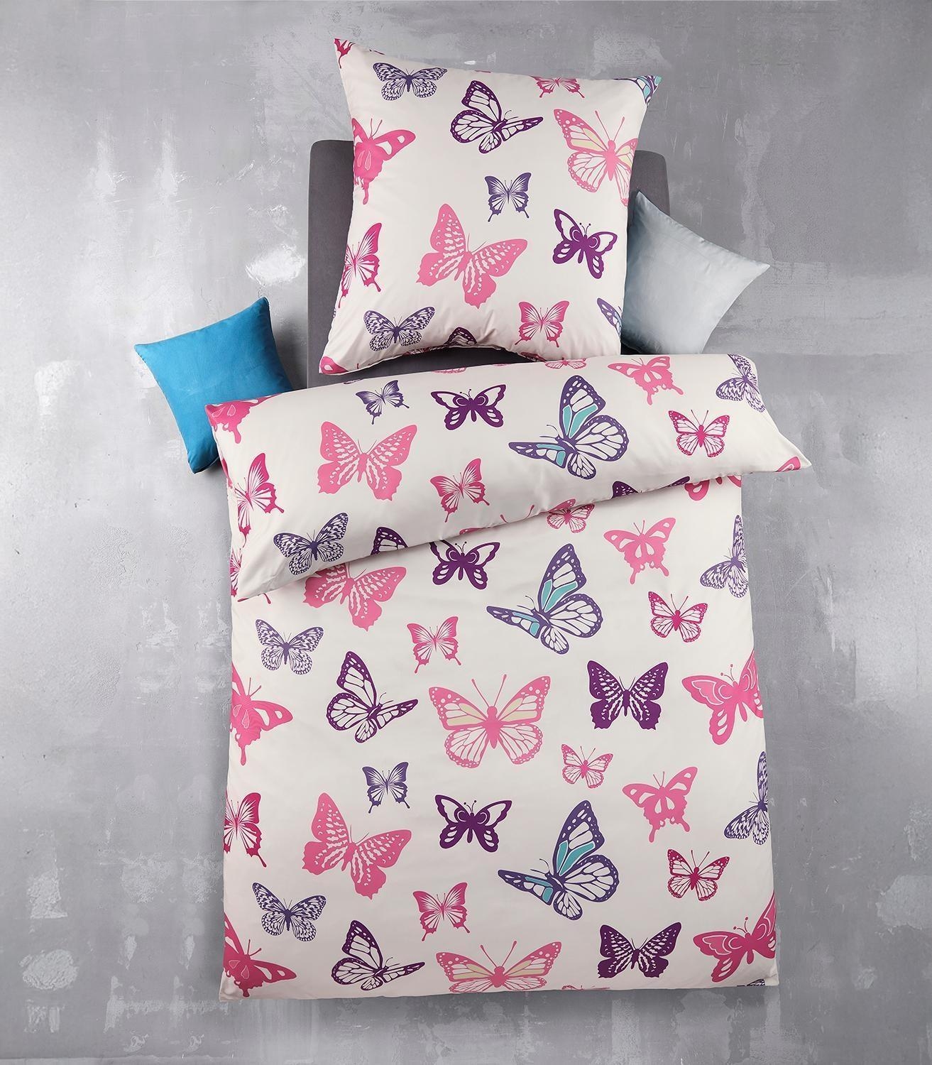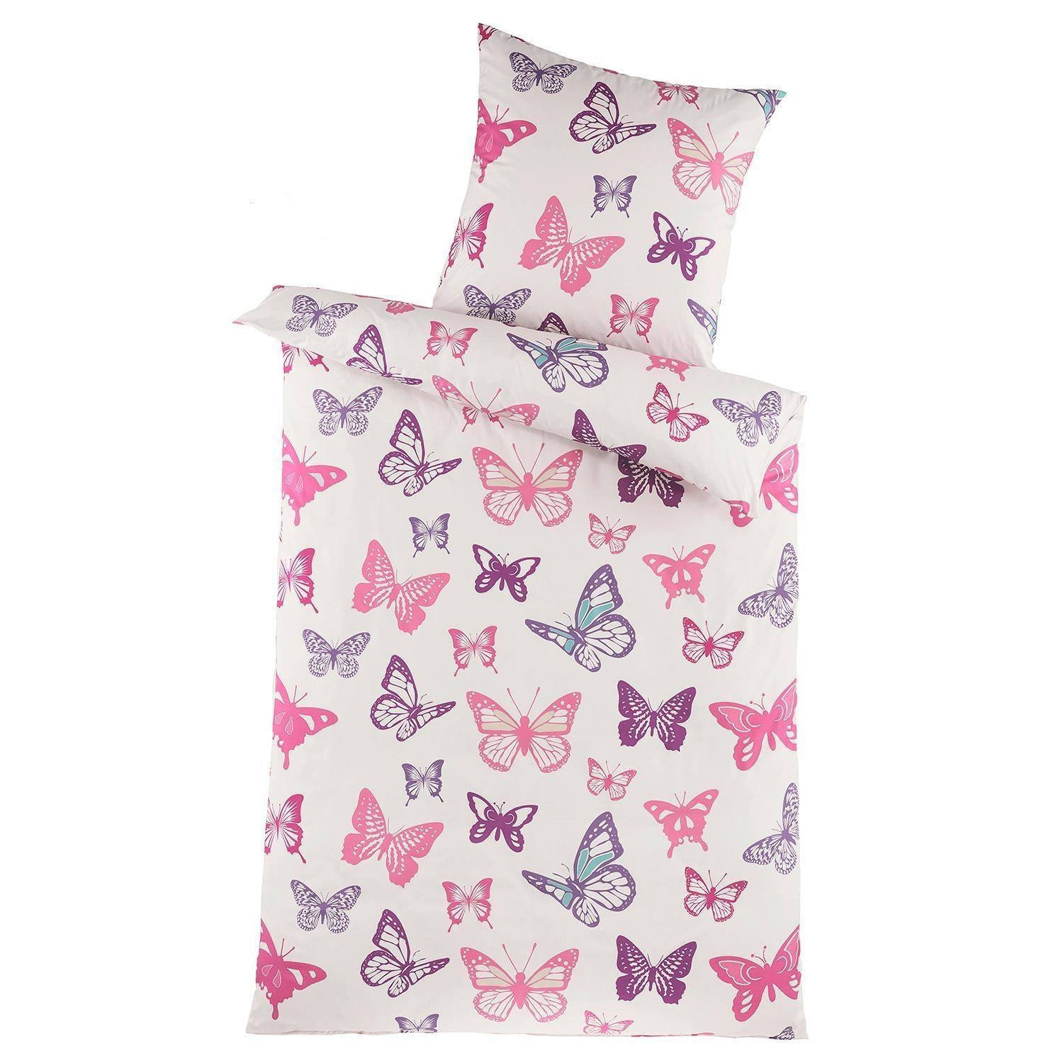 Die Microfaser-Bettwäsche FIONA in Weiß mit süßen Schmetterlingsmotiven in Rosa und Lila hat eine Größe von 135 x 200 cm. Hergestellt aus 100 % Polyester, ist sie mit einem Reißverschluss ausgestattet. Pflegeleicht bei 60 °C waschbar und trocknergeeignet. Eine stilvolle und praktische Ergänzung für jedes Schlafzimmer.