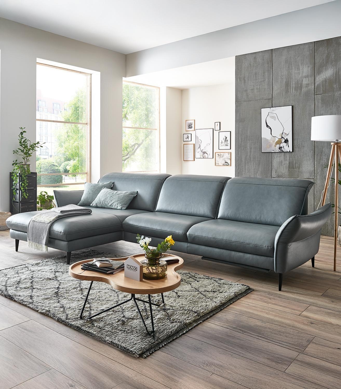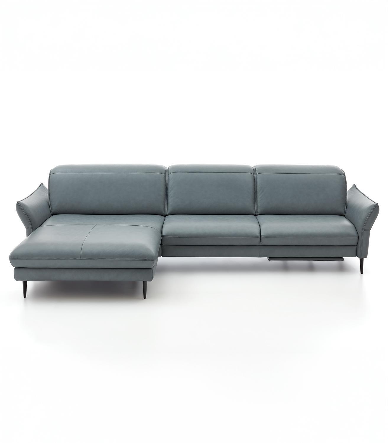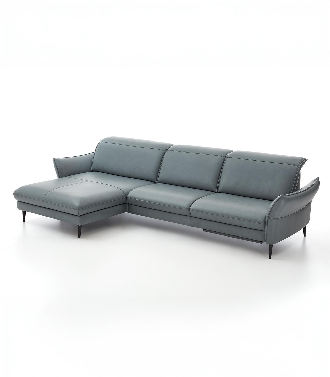 Das Ecksofa MIRUM der Marke MONDO ist mit einem Lederbezug in Opalgrün versehen und steht auf Füßen aus Aluminium in Schwarz. Es verfügt über drei Kopfteilverstellungen sowie zwei verstellbare Armlehnen. Die Sitzfläche ist mit Polstervlies auf einer Federkernpolsterung ausgestattet, während die Rückenfläche über eine Kaltschaumpolsterung verfügt. Die Ottomane ist ausschließlich linksseitig montierbar. Mit eingeklappten Kopfteilen beträgt die Höhe 88 cm, mit ausgeklappten Kopfteilen 106 cm. Das Sofa ist 283 cm breit und 180 cm tief, die Sitzhöhe liegt bei 46 cm und die Sitztiefe bei 55 cm.