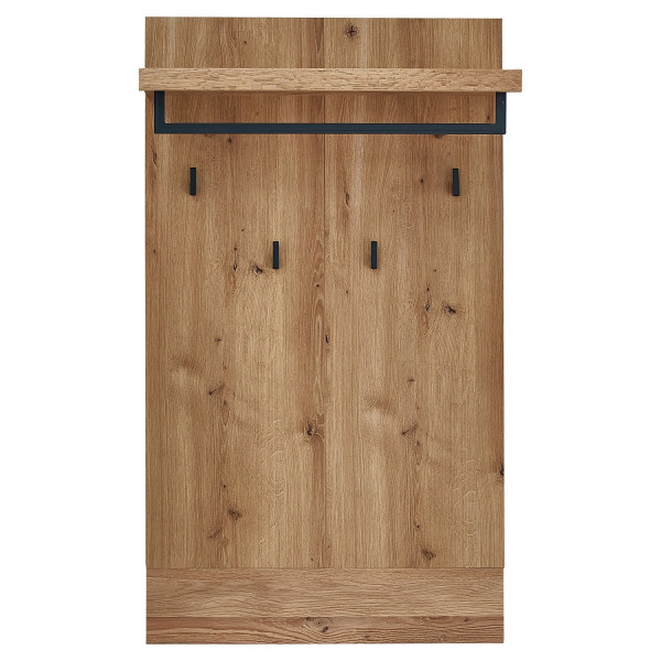 Die Verwendung von massiver Wildeiche verleiht dem Paneel eine natürliche und hochwertige Ausstrahlung. Die Kombination aus Hutablage, Kleiderstange und Haken macht dieses Garderobenpaneel zu einem vielseitigen Aufbewahrungsmöbel, das nicht nur funktional ist, sondern auch einen charmanten Akzent im Eingangsbereich setzt.