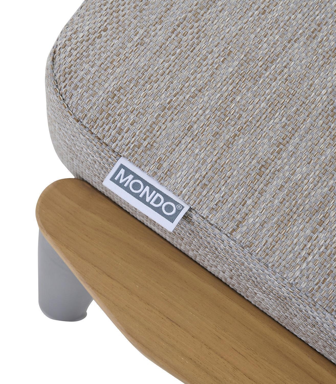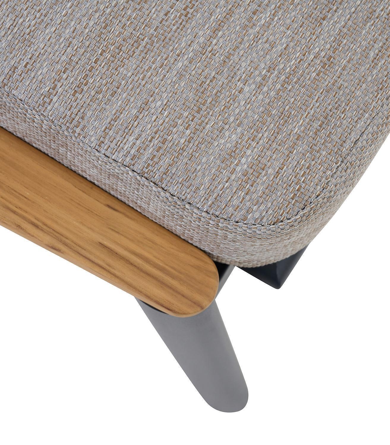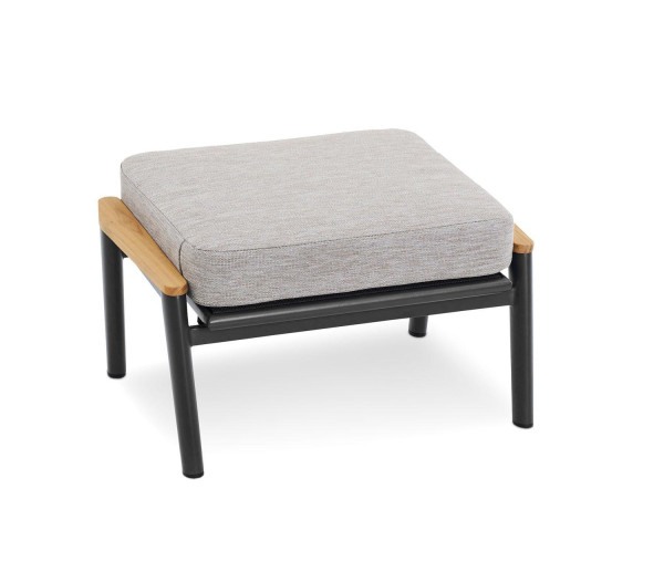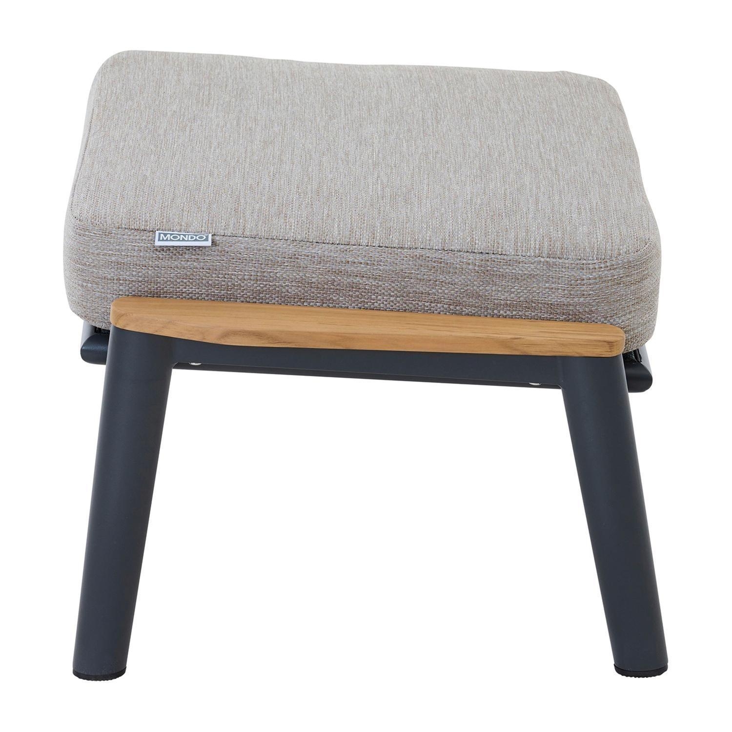 Der Gartenhocker LATEA der Marke MONDO ist mit einem Aluminiumgestell in Anthrazit sowie einem grauen Sitzkissen aus Polypropylen ausgestattet. Dieses Outdoor-Sitzmöbel verfügt über Absetzungen aus massivem, braunem Teakholz und dient als zusätzliche Sitzgelegenheit für den Außenbereich. Die Maße des Hockers belaufen sich auf eine Breite von 53 cm, eine Höhe von 39,5 cm sowie eine Tiefe von 68,5 cm. Durch die wetterbeständigen Materialien eignet sich die Fußablage ideal für die Nutzung auf der Terrasse oder im Garten.