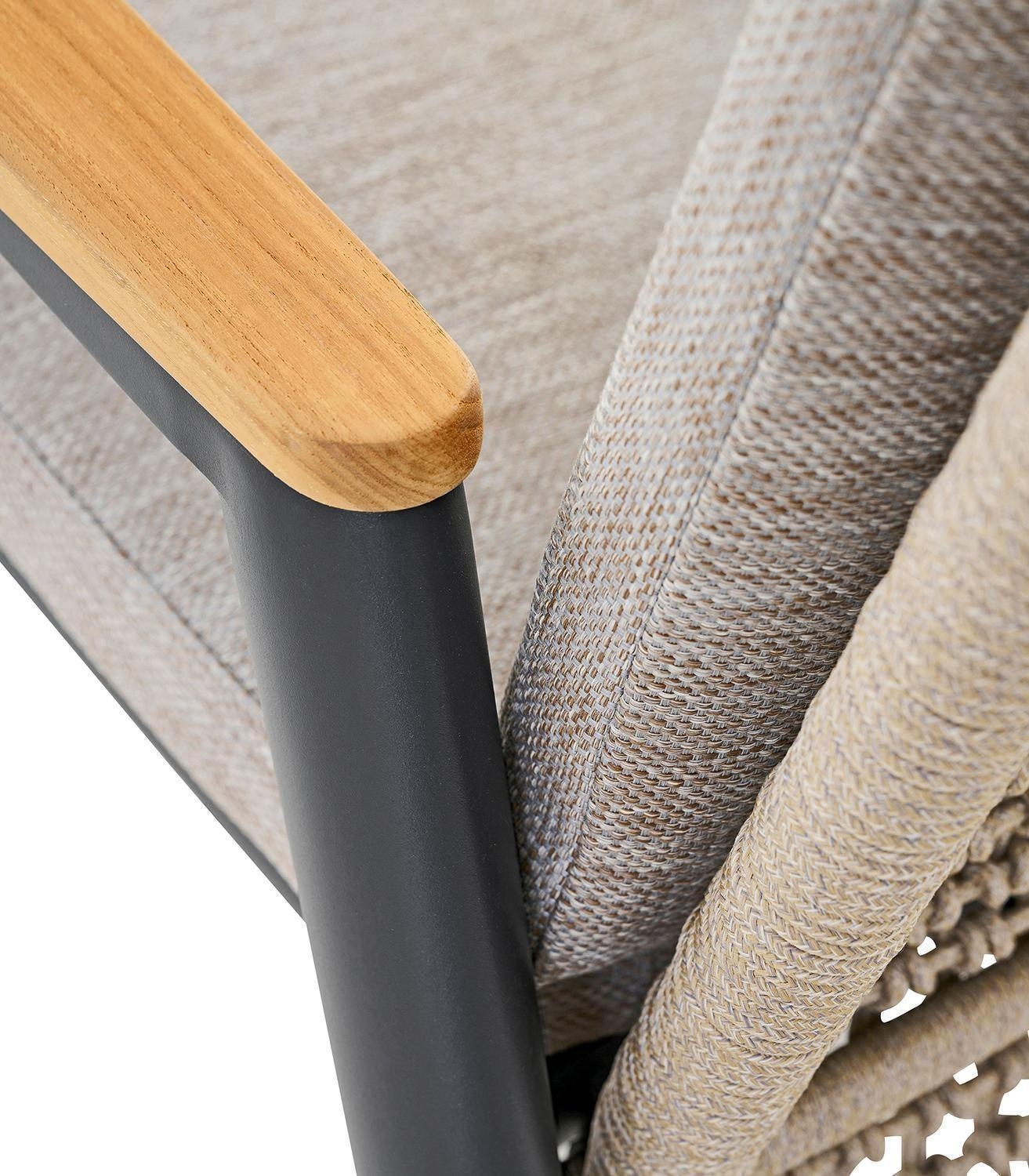 Der Gartensessel LATEA der Marke MONDO verfügt über ein Aluminiumgestell in Anthrazit und eine Rückenbespannung aus Seilen in Taupe. Die Armlehnen sind aus massivem, braunem Teakholz gefertigt. Zur Ausstattung gehören Sitz- und Rückenkissen mit grauen Bezügen aus Polypropylen sowie eine stufenlos verstellbare Rückenlehne. Die Maße belaufen sich auf eine Breite von 83 cm, eine Höhe von 108 cm und eine Tiefe von 60,5 cm.