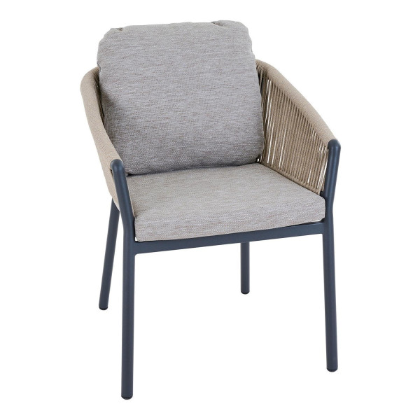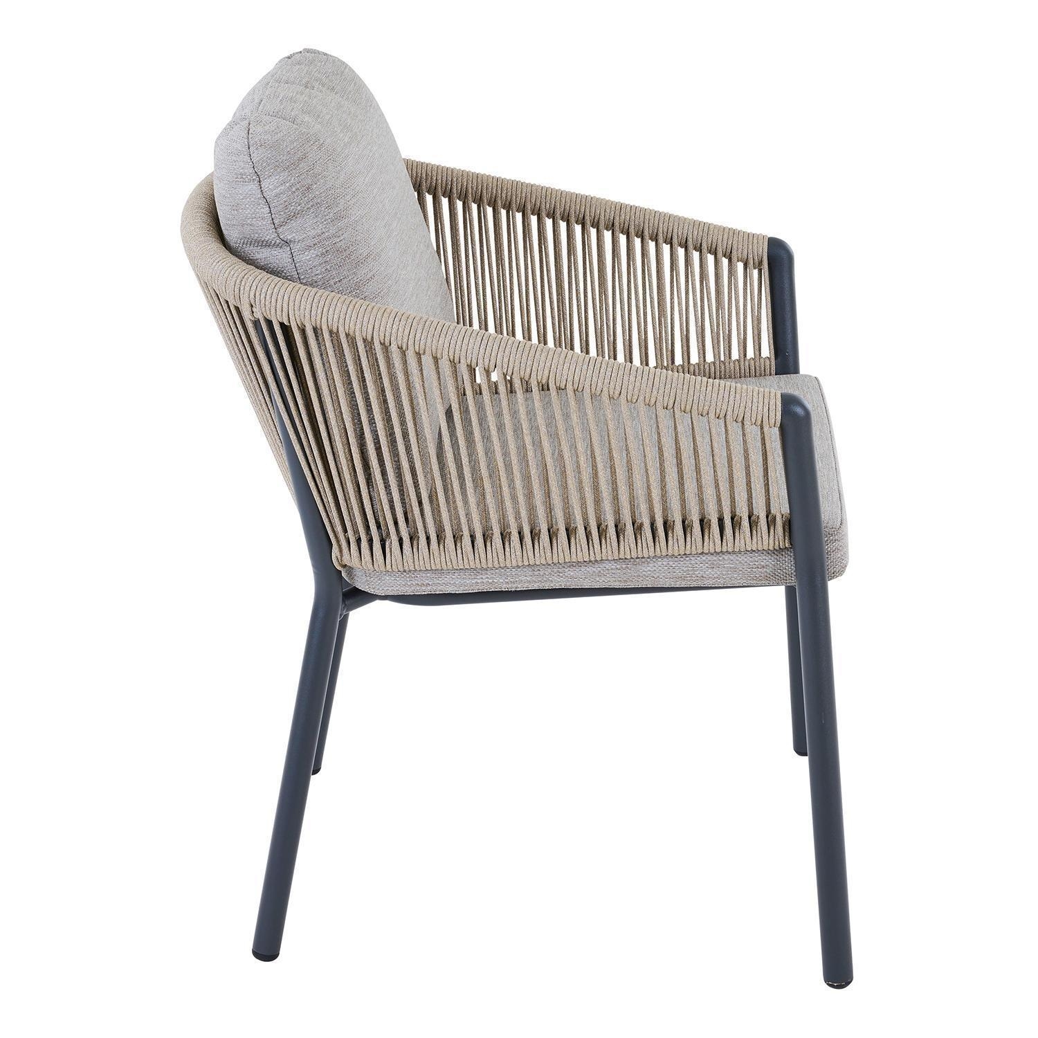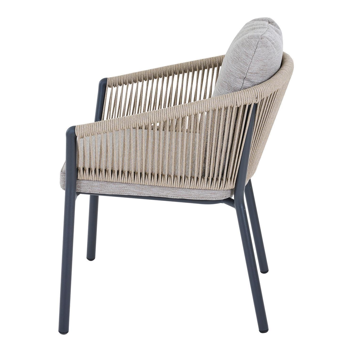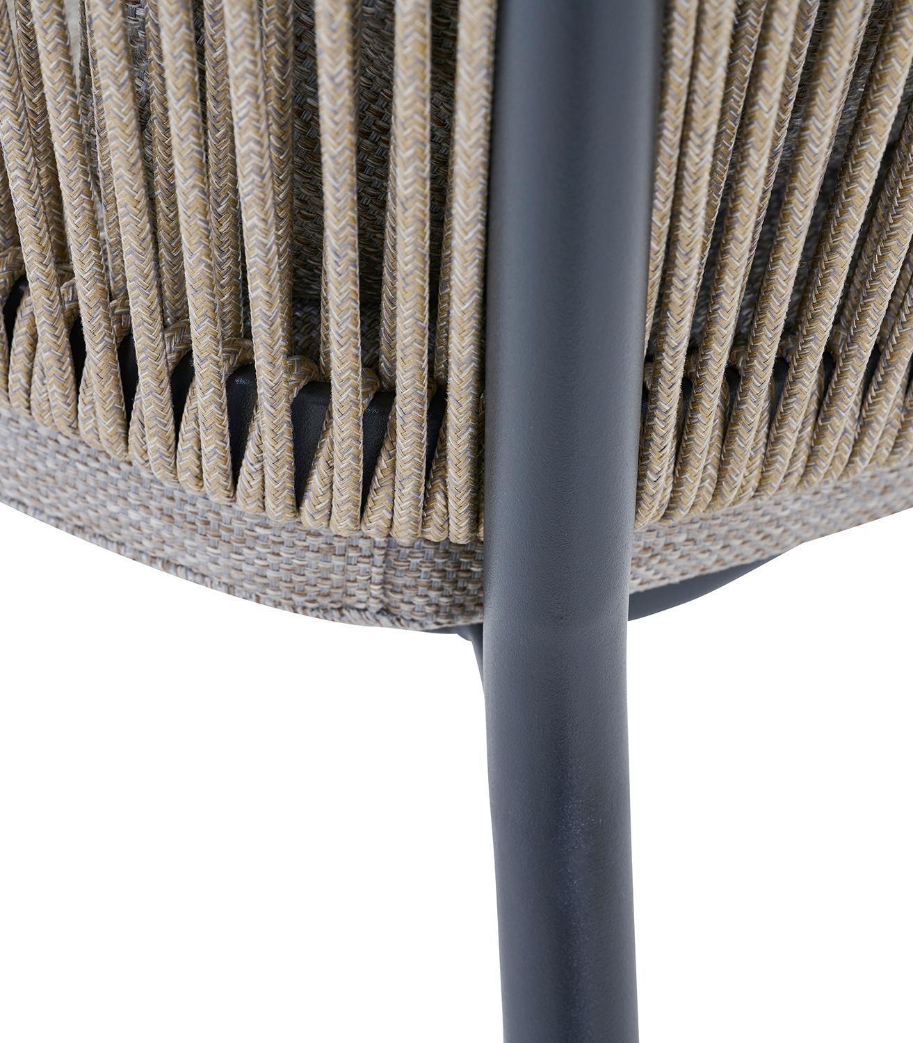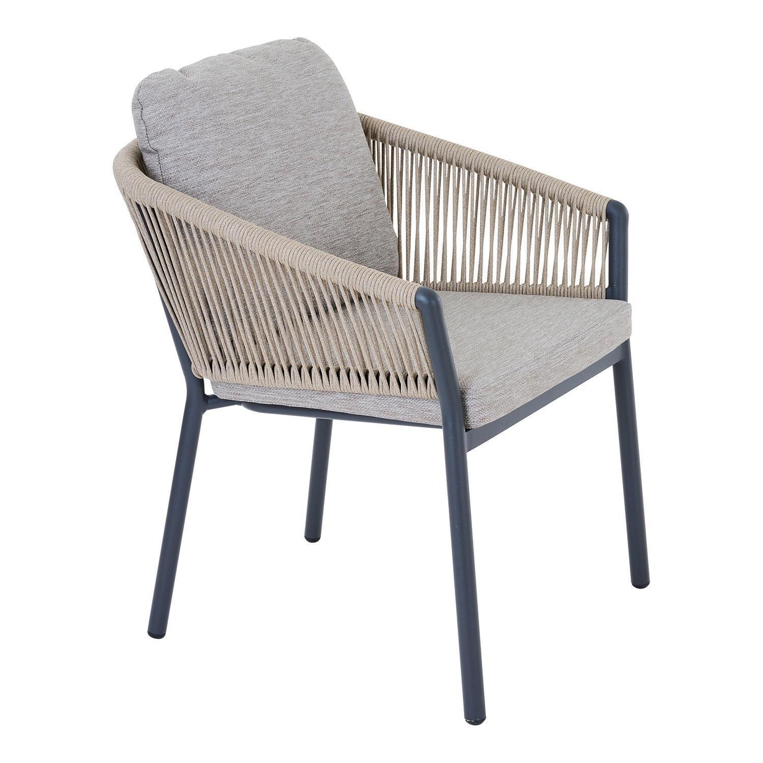 Der Gartenstuhl LATEA der Marke MONDO ist mit einem anthrazitfarbenen Aluminiumgestell ausgestattet und verfügt über eine Seiten- sowie Rückenbespannung aus Seilen in der Farbe Taupe. Dieser Balkonstuhl weist eine Breite von 60 cm, eine Höhe von 70 cm sowie eine Tiefe von 64 cm auf. Zur Ausstattung gehören Sitz- und Rückenkissen, die mit einem Polyesterbezug in Taupe versehen sind. Aufgrund der Materialwahl ist dieser Stuhl für den Außenbereich geeignet, langlebig und witterungsbeständig.