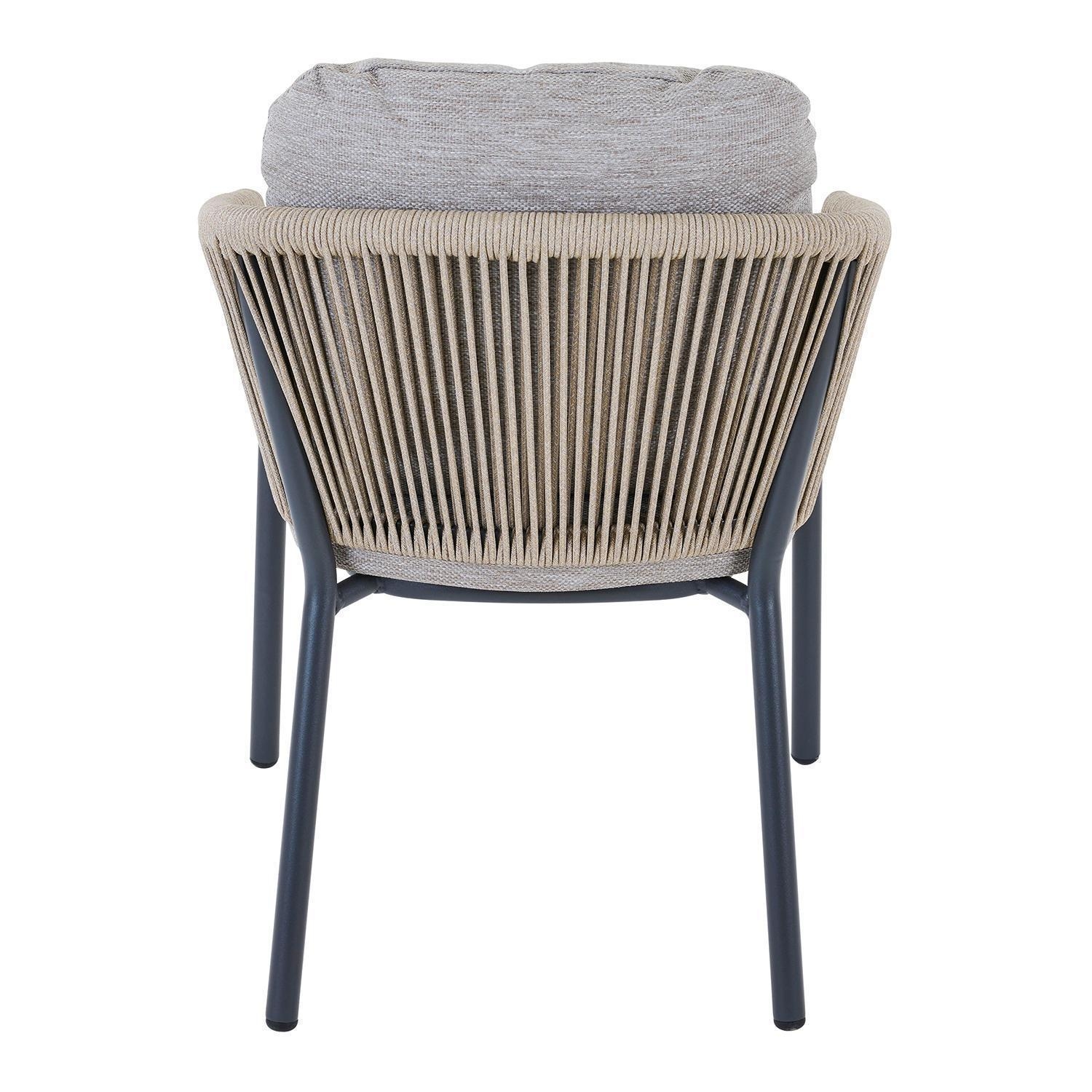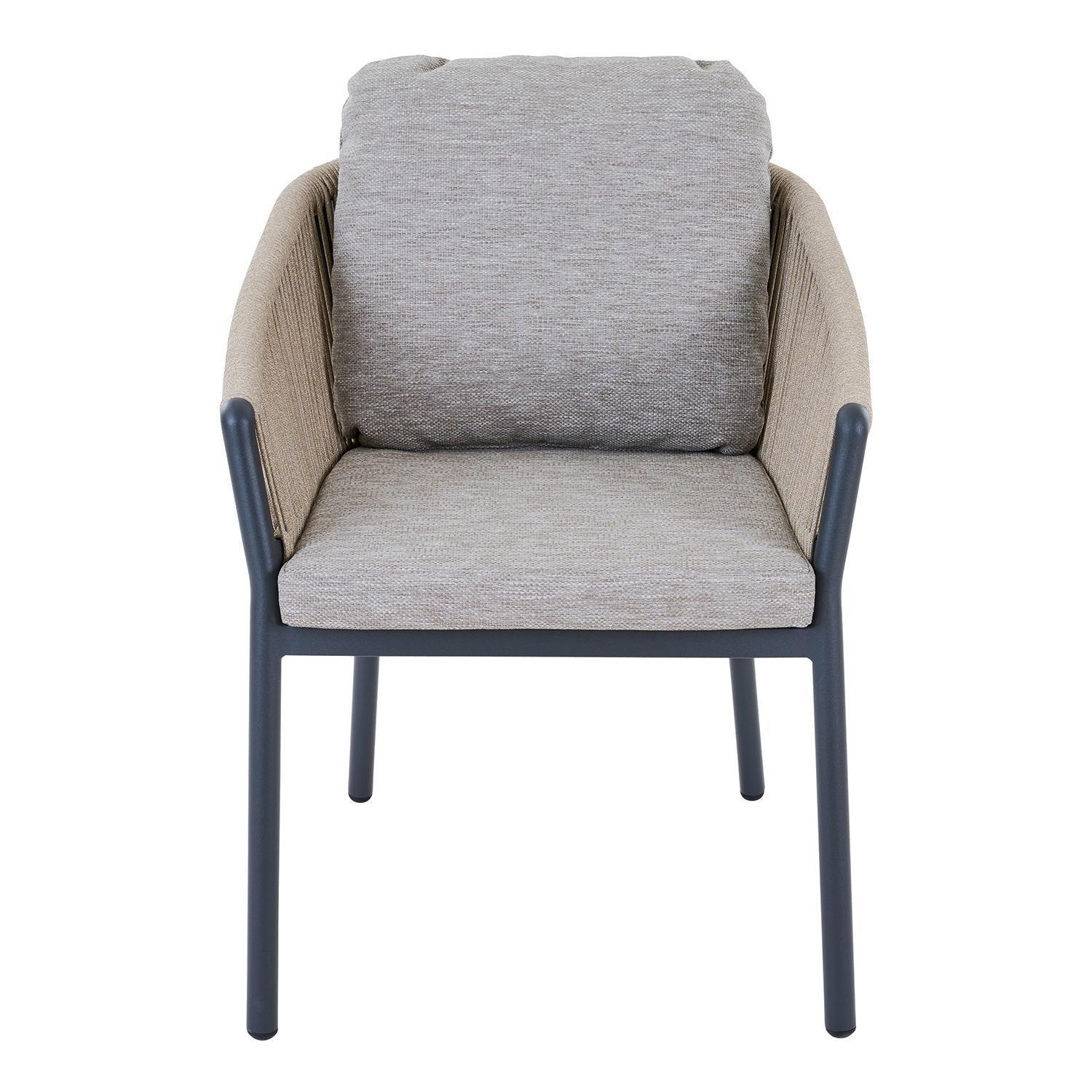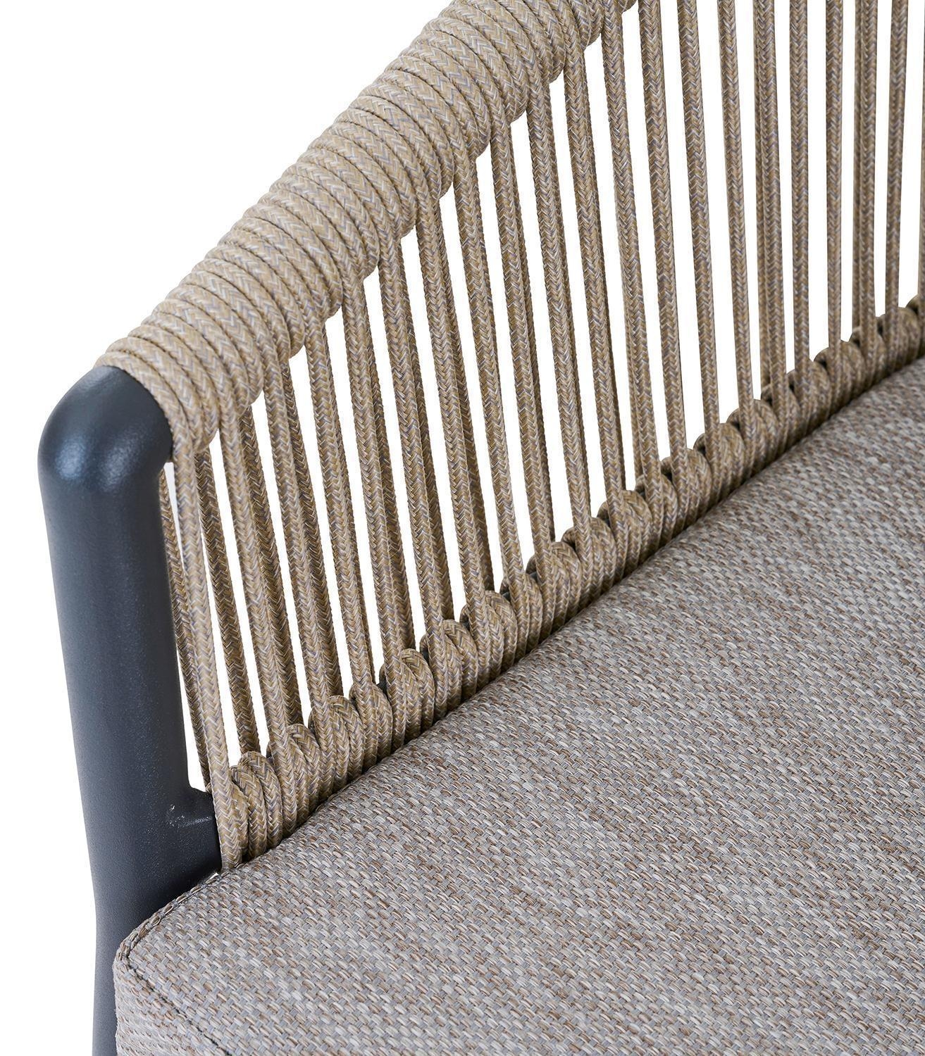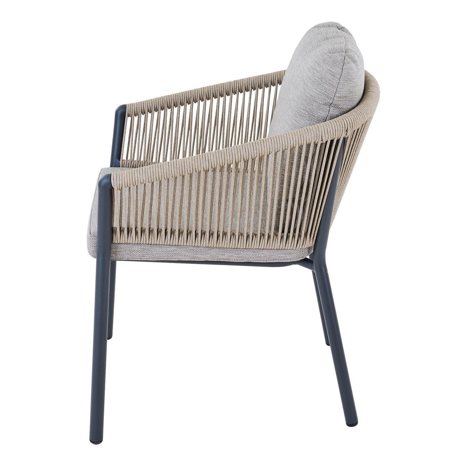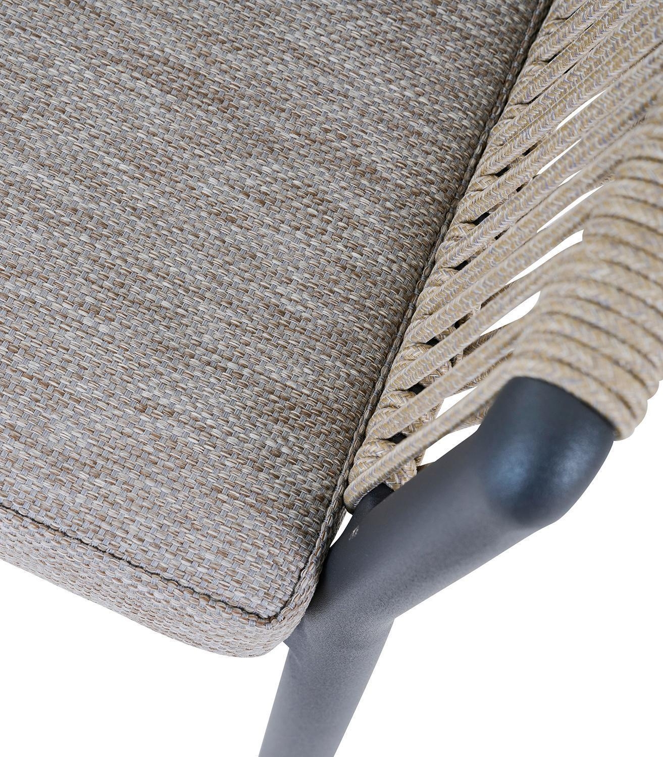 Der Gartenstuhl LATEA der Marke MONDO ist mit einem anthrazitfarbenen Aluminiumgestell ausgestattet und verfügt über eine Seiten- sowie Rückenbespannung aus Seilen in der Farbe Taupe. Dieser Balkonstuhl weist eine Breite von 60 cm, eine Höhe von 70 cm sowie eine Tiefe von 64 cm auf. Zur Ausstattung gehören Sitz- und Rückenkissen, die mit einem Polyesterbezug in Taupe versehen sind. Aufgrund der Materialwahl ist dieser Stuhl für den Außenbereich geeignet, langlebig und witterungsbeständig.
