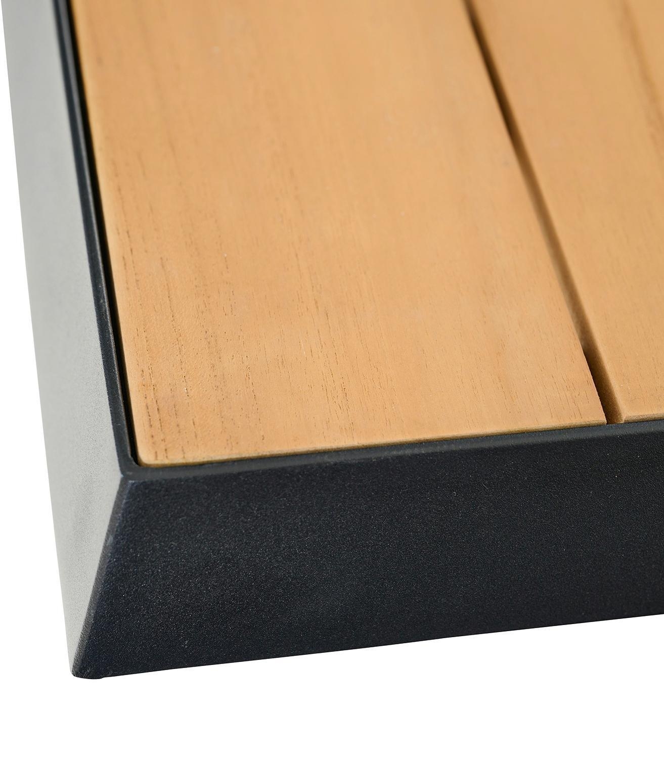Die Platte aus Teakholz ist robust und witterungsbeständig. Durch die natürlichen Öle im Holz ist das Material bereits gut geschützt und hat eine hohe Lebensdauer. Zu Beginn können die Farbpigmente im Holz durch Nässe und Regen herausgewaschen werden und somit Flecken auf hellen Bodenbelägen verursachen. Deshalb wird es empfohlen, das Gestell auf einem unempfindlichen Untergrund mehrmals zu wässern, um das Auswaschen der Farbpigmente zu beschleunigen.