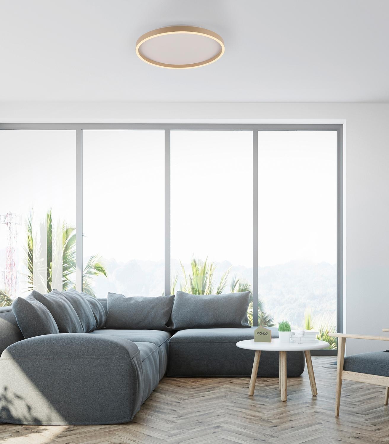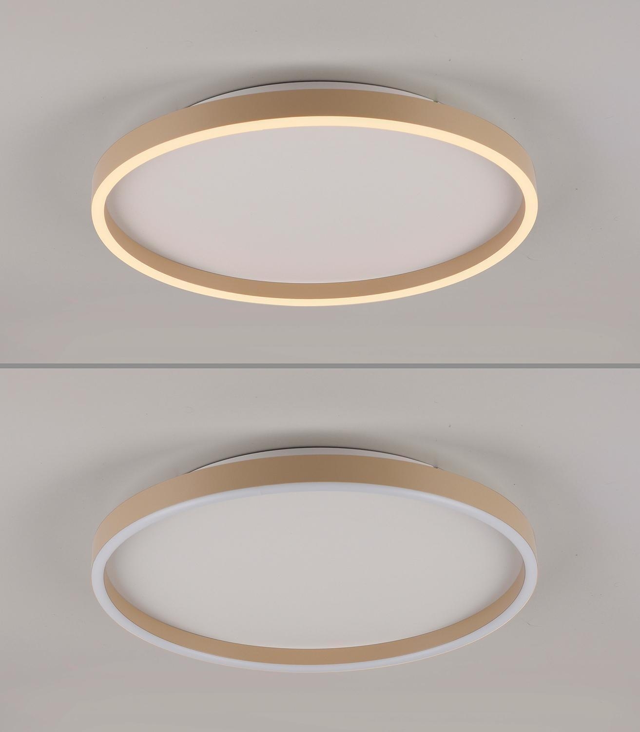 Die LED-Deckenleuchte ELARO der Marke MONDO besteht aus Metall in Sandfarben und hat einen Durchmesser von 40 cm sowie eine Höhe von 5,5 cm. Sie ist 3-stufig über einen herkömmlichen Wandschalter dimmbar und hat eine Leistung von 17 Watt. Die Leuchte hat eine Helligkeit von 1900 Lumen bei einer Lichtfarbe von 3000 Kelvin.