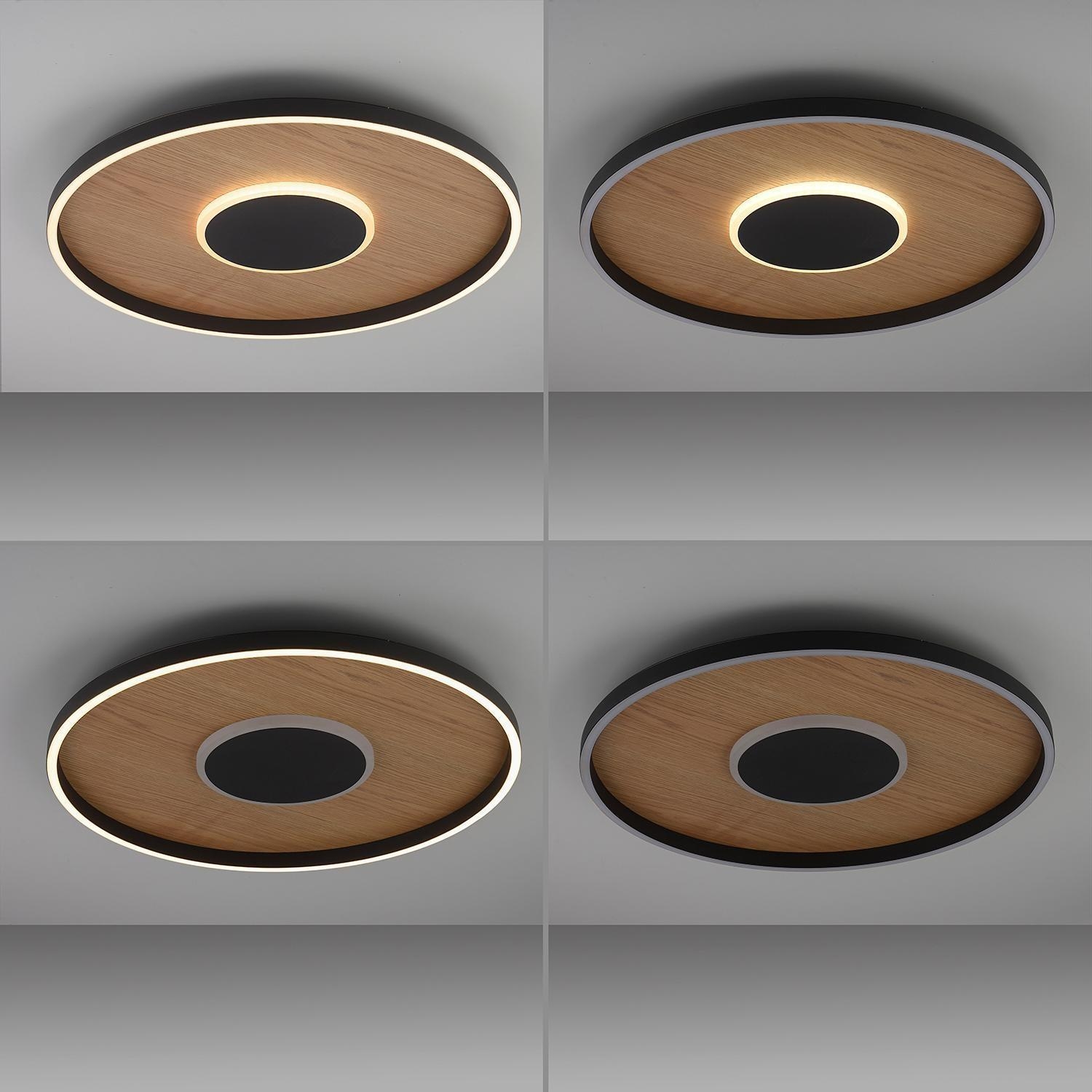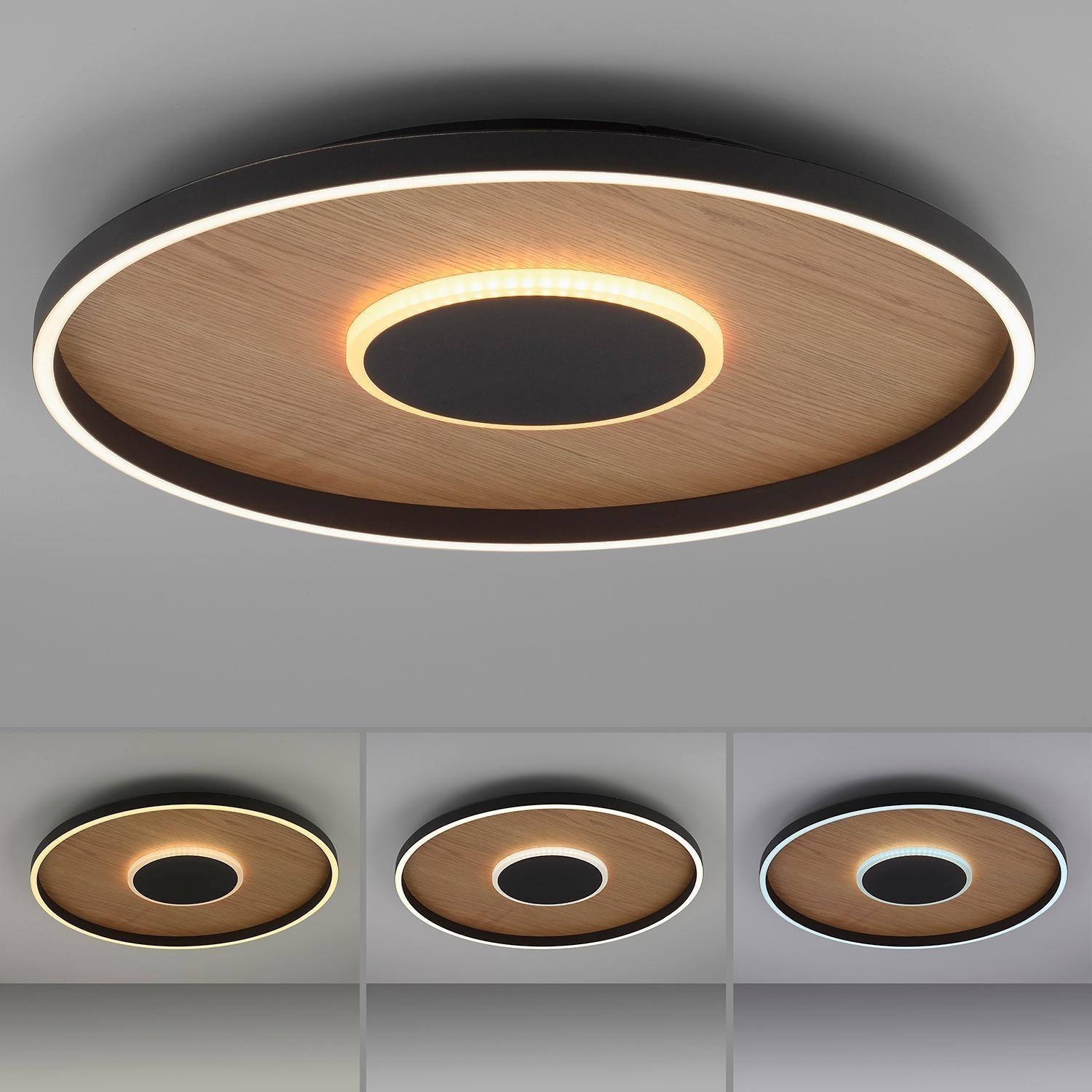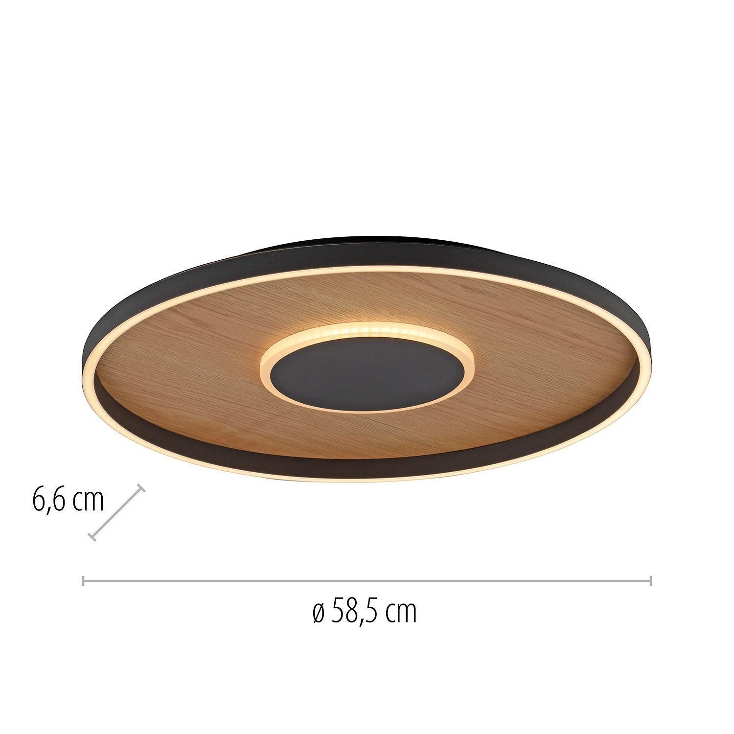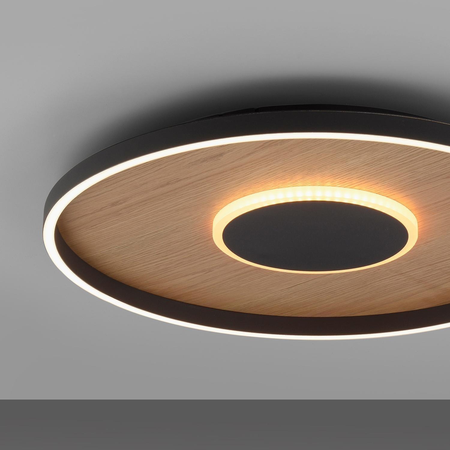 Die LED-Deckenleuchte FAMERA der Marke MONDO ist aus schwarzem Metall gefertigt und besitzt einen Lampenschirm, der teilweise aus massivem Eichenholz besteht. Sie hat einen Durchmesser von 58,5 cm und eine Höhe von 6,6 cm. Die Leuchte ist mit zwei fest verbauten LED-Leuchtmitteln ausgestattet, die im Lieferumfang enthalten sind. Diese bieten eine Gesamtleistung von 40,5 Watt, einen Lichtstrom von 3800 lm sowie eine anpassbare Farbtemperatur im Bereich von 2700 bis 5000 K. Über die mitgelieferte Fernbedienung lassen sich Dimmfunktion, Memory-, Nachtlicht- und Timerfunktion steuern. Außen- und Innenlicht können separat voneinander ein- und ausgeschaltet werden.