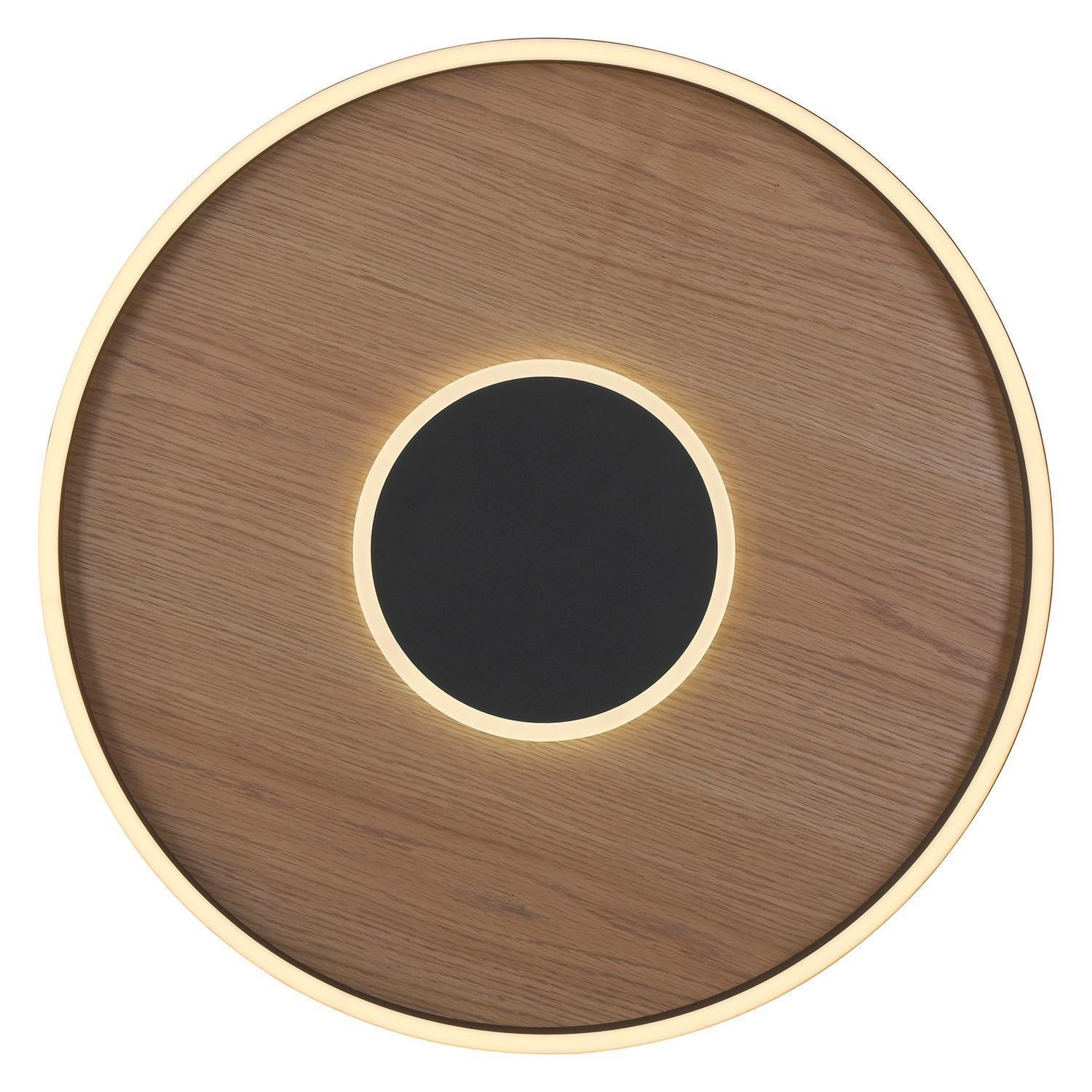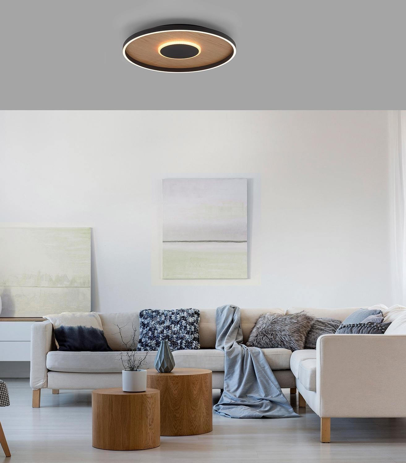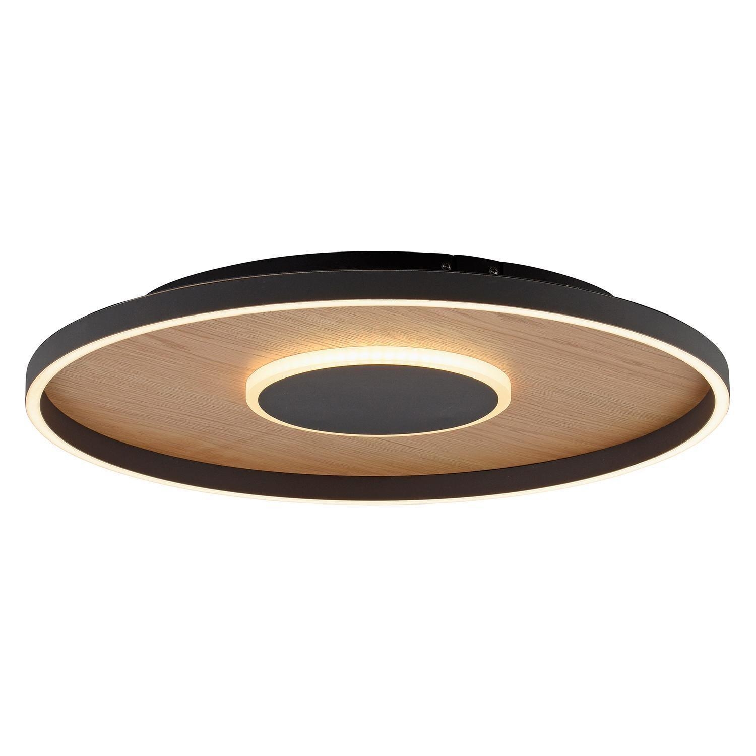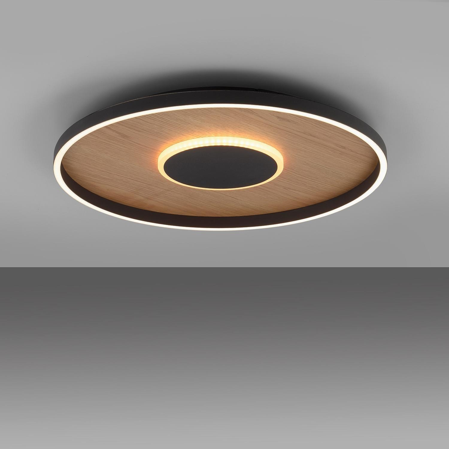 Die LED-Deckenleuchte FAMERA der Marke MONDO ist aus schwarzem Metall gefertigt und besitzt einen Lampenschirm, der teilweise aus massivem Eichenholz besteht. Sie hat einen Durchmesser von 58,5 cm und eine Höhe von 6,6 cm. Die Leuchte ist mit zwei fest verbauten LED-Leuchtmitteln ausgestattet, die im Lieferumfang enthalten sind. Diese bieten eine Gesamtleistung von 40,5 Watt, einen Lichtstrom von 3800 lm sowie eine anpassbare Farbtemperatur im Bereich von 2700 bis 5000 K. Über die mitgelieferte Fernbedienung lassen sich Dimmfunktion, Memory-, Nachtlicht- und Timerfunktion steuern. Außen- und Innenlicht können separat voneinander ein- und ausgeschaltet werden.
