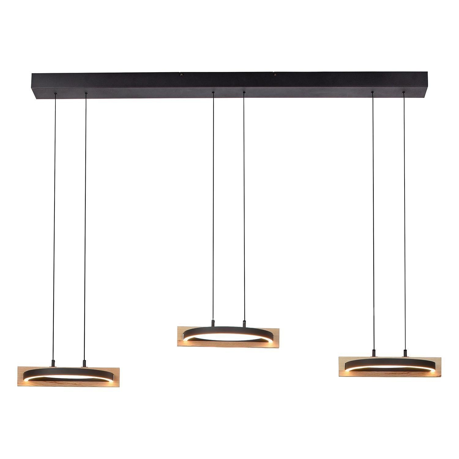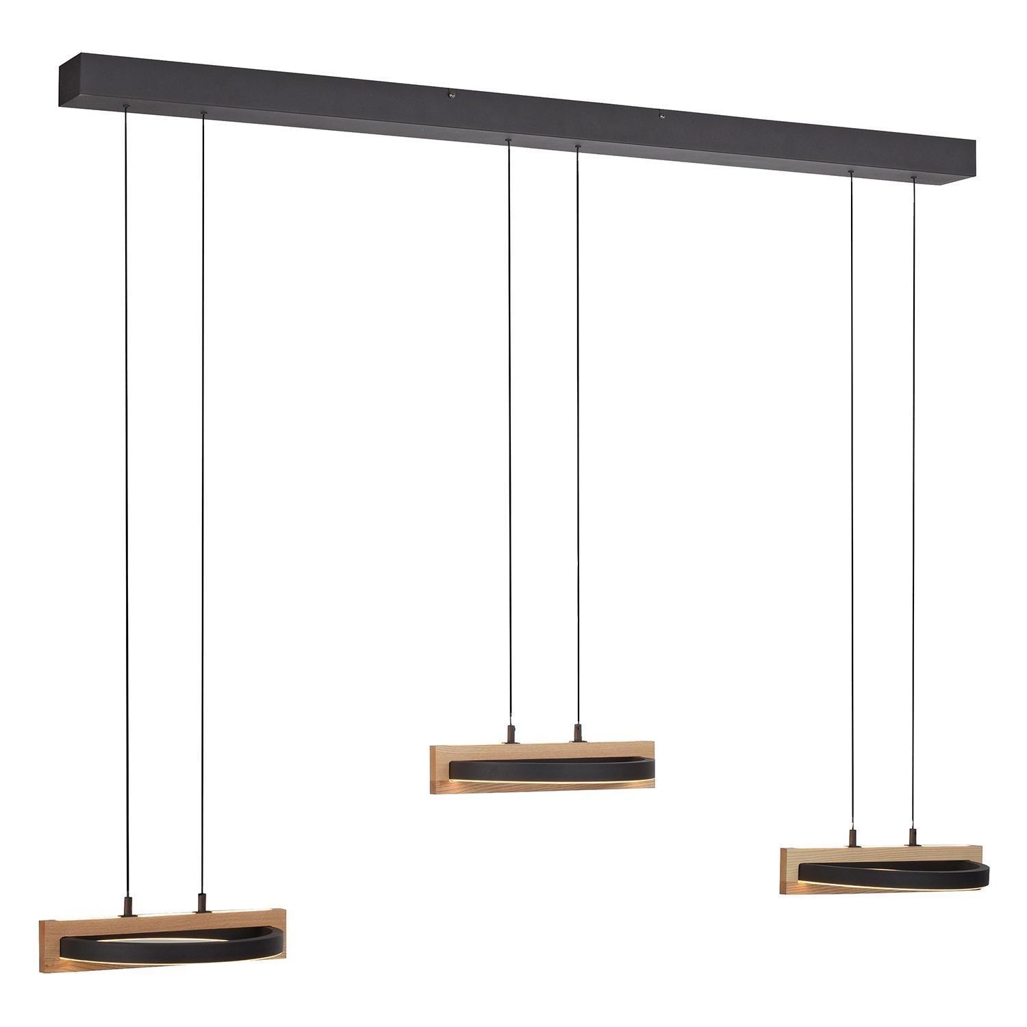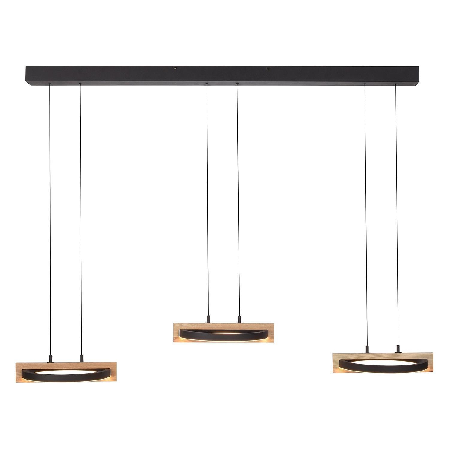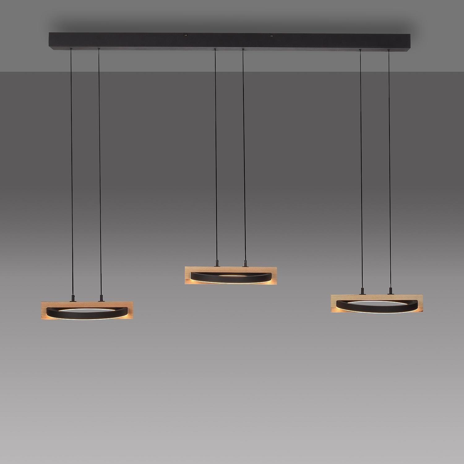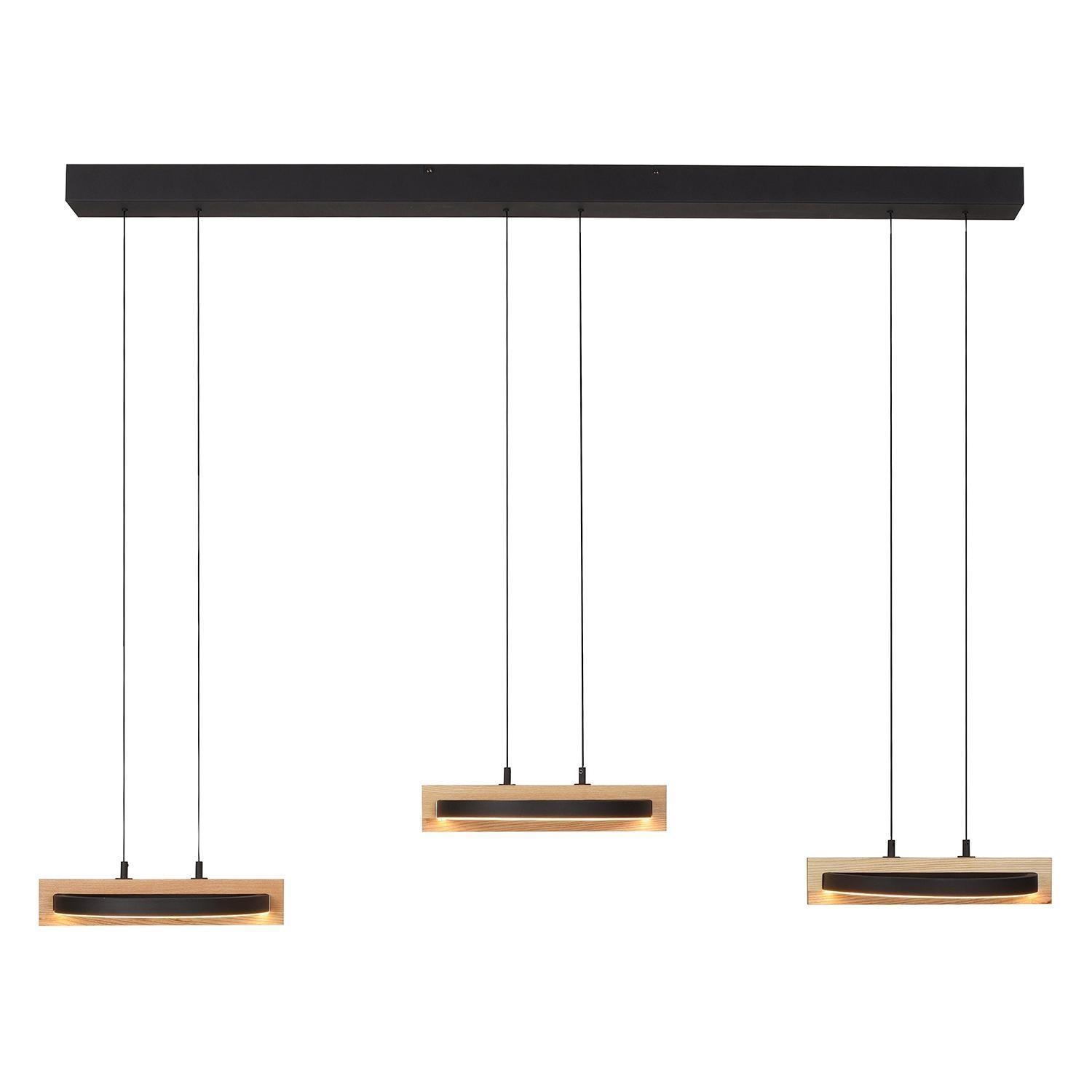 Die LED-Pendelleuchte FAMERA der Marke MONDO besteht aus Metall in Schwarz und verfügt über drei Lampenschirme, die teilweise aus massivem Eichenholz bestehen. Sie hat eine Breite von 135 cm, eine Tiefe von 28,5 cm und jeder Lampenschirm ist manuell höhenverstellbar von 80 bis 200 cm. Die Leuchte ist mit sechs fest verbauten LED-Leuchtmittel ausgestattet, die im Lieferumfang enthalten sind. Diese bieten eine Leistung von ingesamt 63 Watt, einen Lichtstrom von 6900 lm sowie eine anpassbare Farbtemperatur im Bereich von 2700 bis 5000 K. Die Dimmfunktion, Nachtlicht- und Timerfunktion lassen sich über die mitgelieferte Fernbedienung steuern.