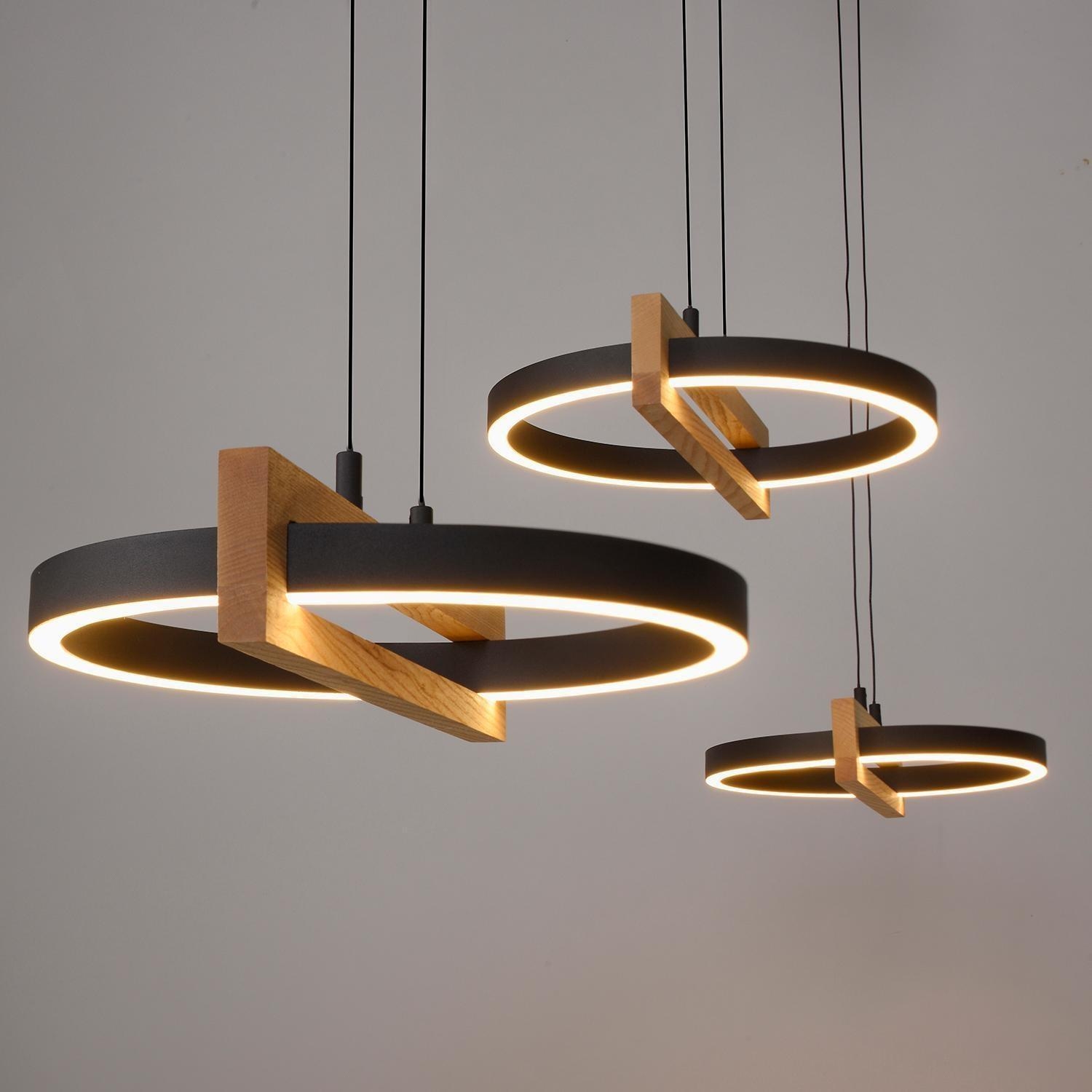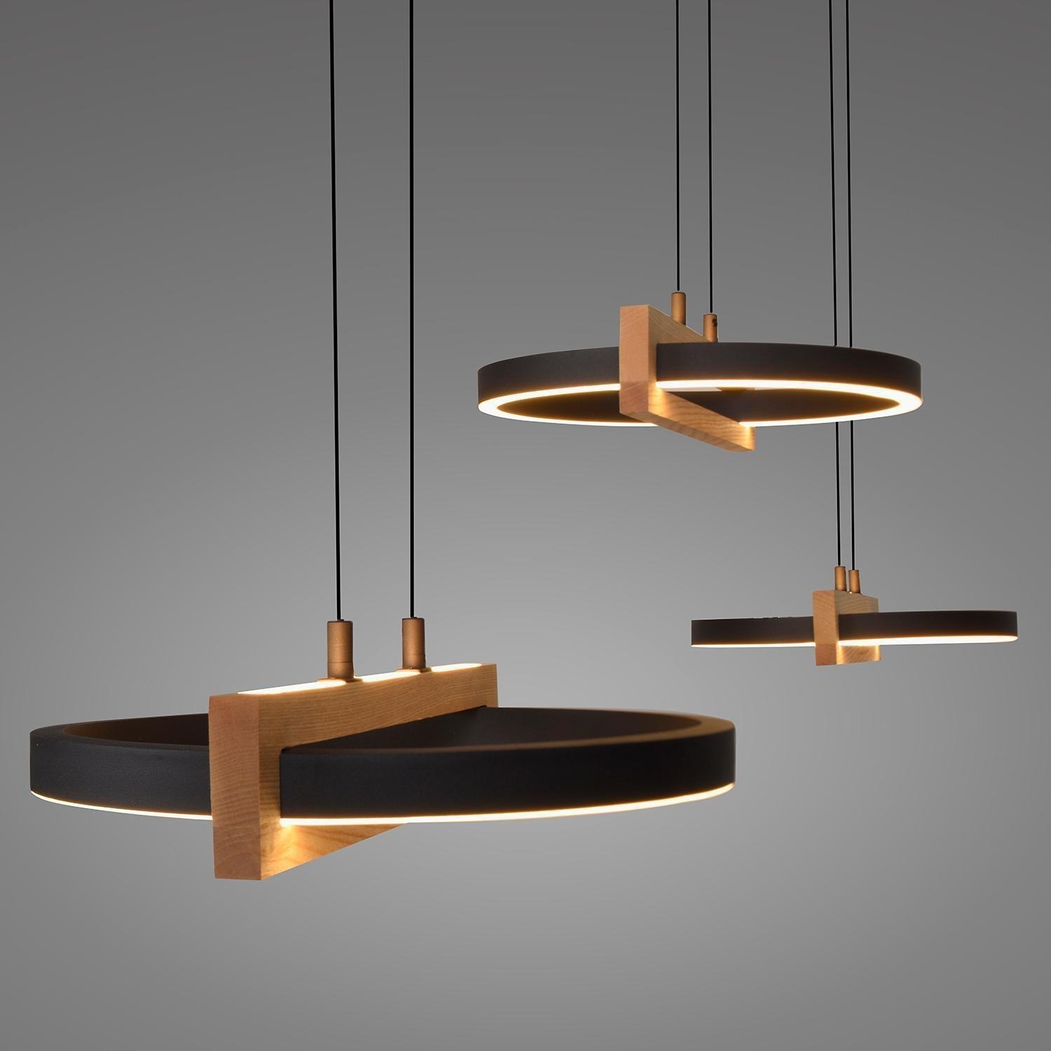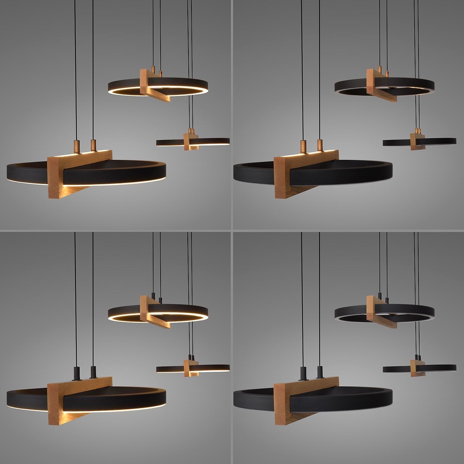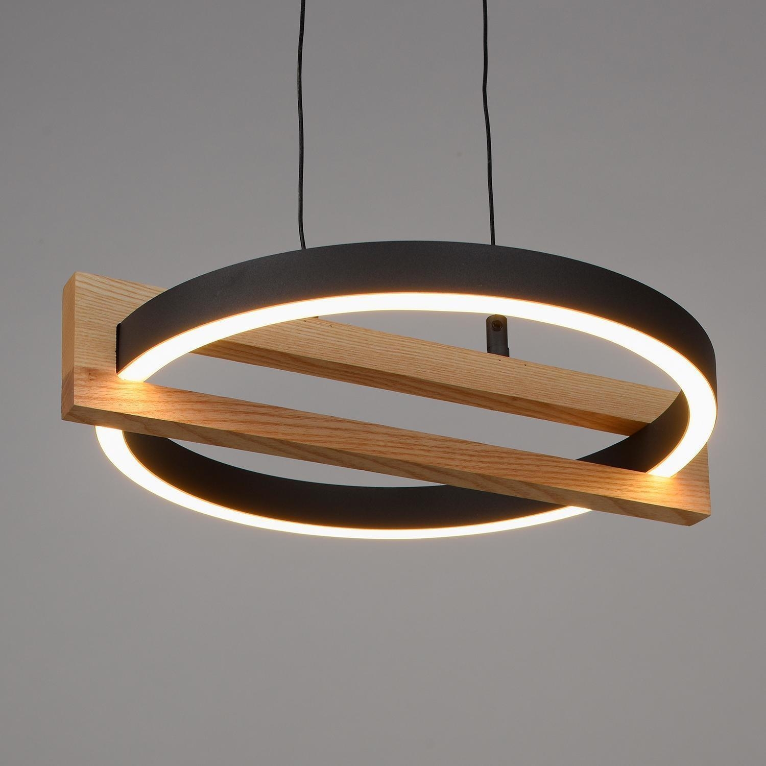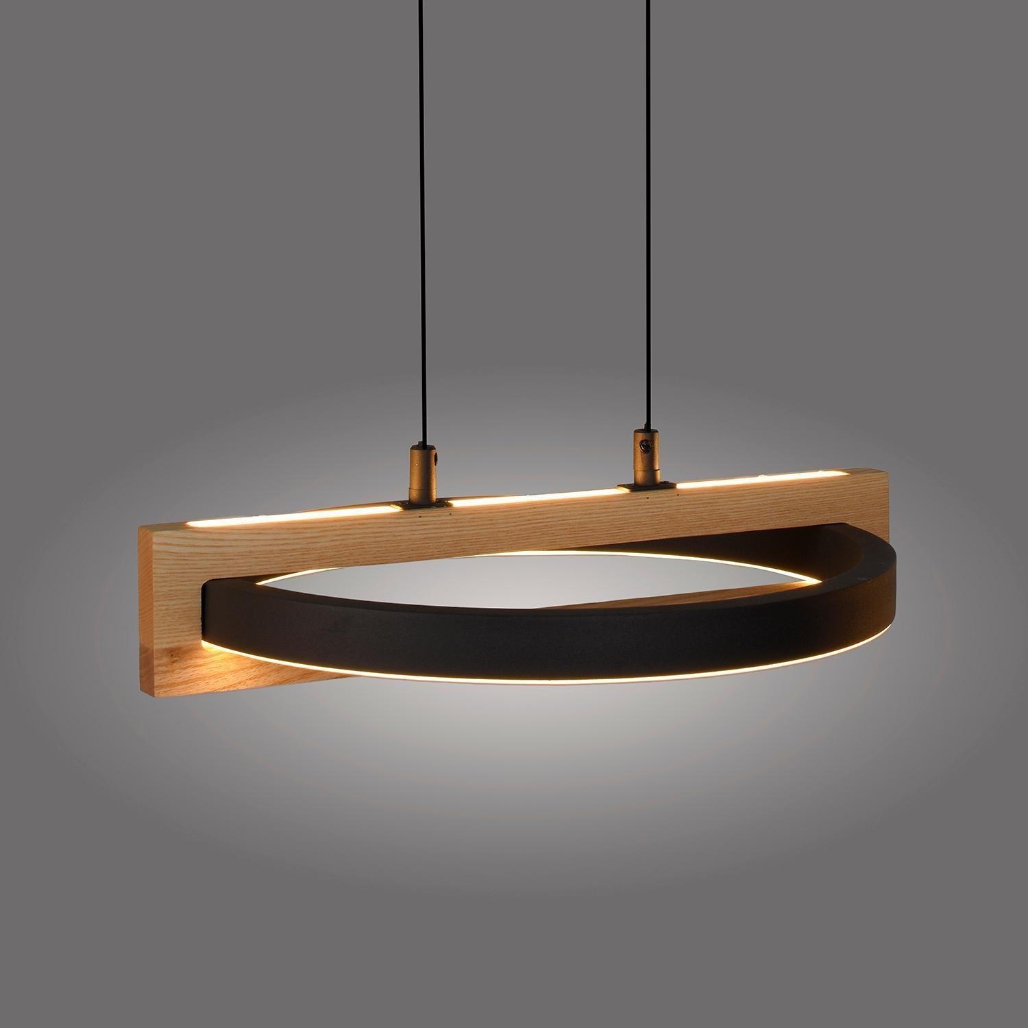 Die LED-Pendelleuchte FAMERA der Marke MONDO besteht aus Metall in Schwarz und verfügt über drei Lampenschirme, die teilweise aus massivem Eichenholz bestehen. Sie hat eine Breite von 135 cm, eine Tiefe von 28,5 cm und jeder Lampenschirm ist manuell höhenverstellbar von 80 bis 200 cm. Die Leuchte ist mit sechs fest verbauten LED-Leuchtmittel ausgestattet, die im Lieferumfang enthalten sind. Diese bieten eine Leistung von ingesamt 63 Watt, einen Lichtstrom von 6900 lm sowie eine anpassbare Farbtemperatur im Bereich von 2700 bis 5000 K. Die Dimmfunktion, Nachtlicht- und Timerfunktion lassen sich über die mitgelieferte Fernbedienung steuern.