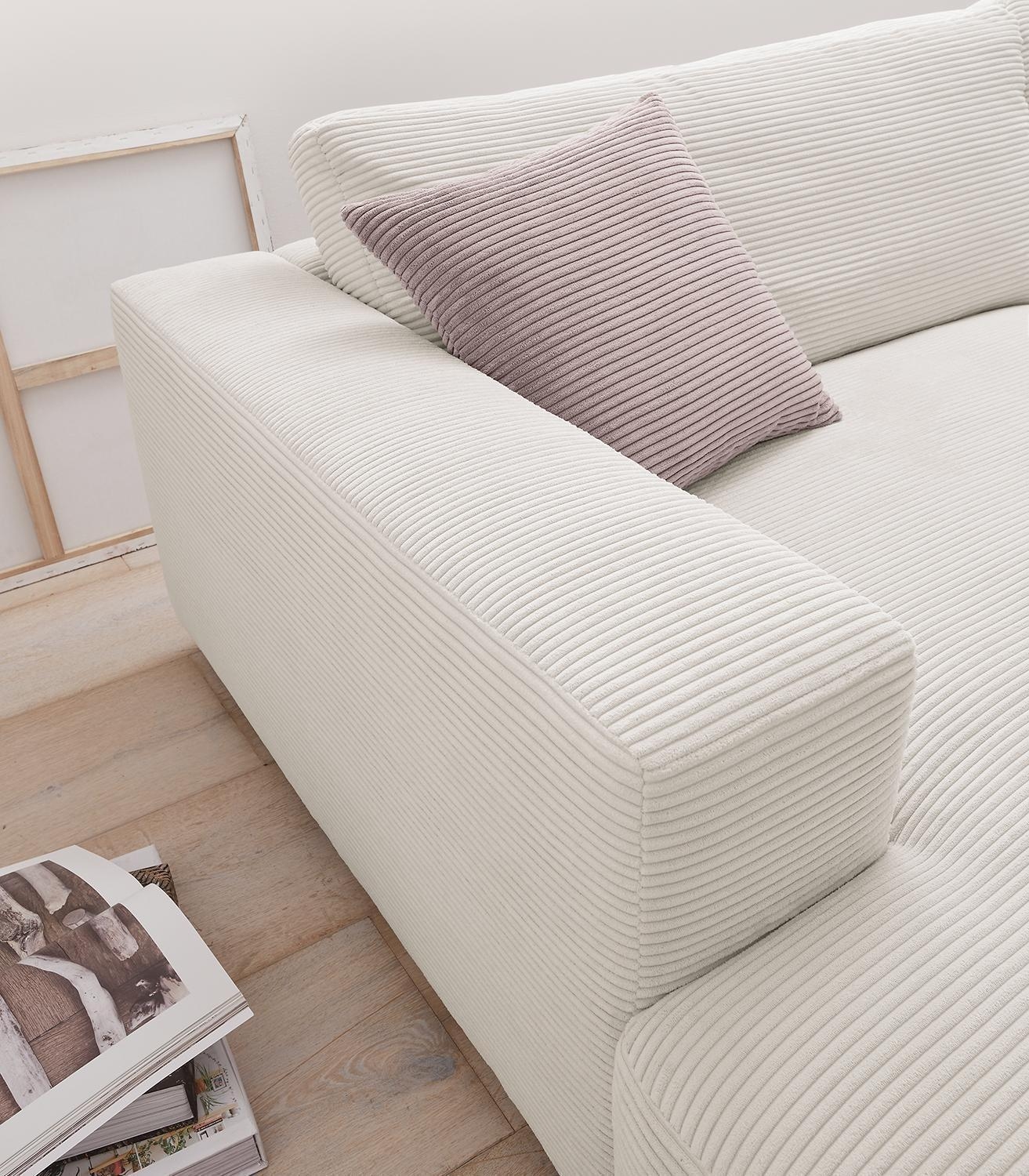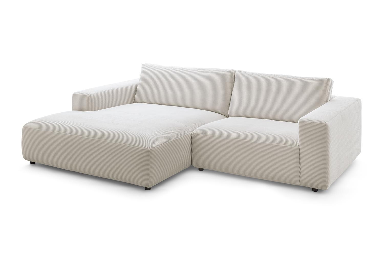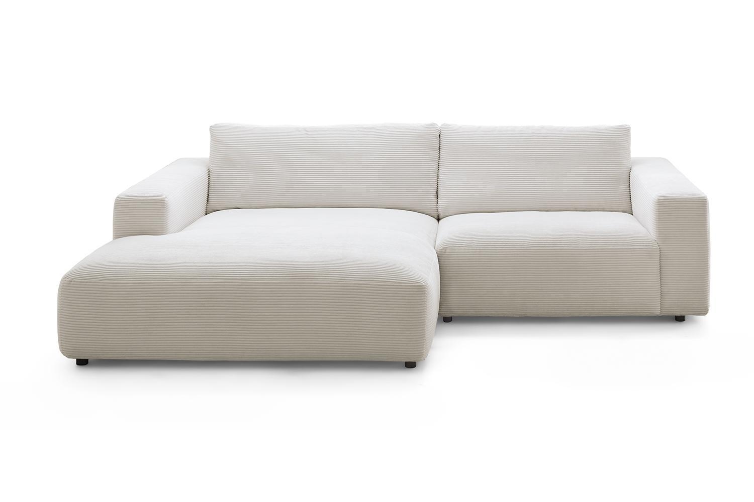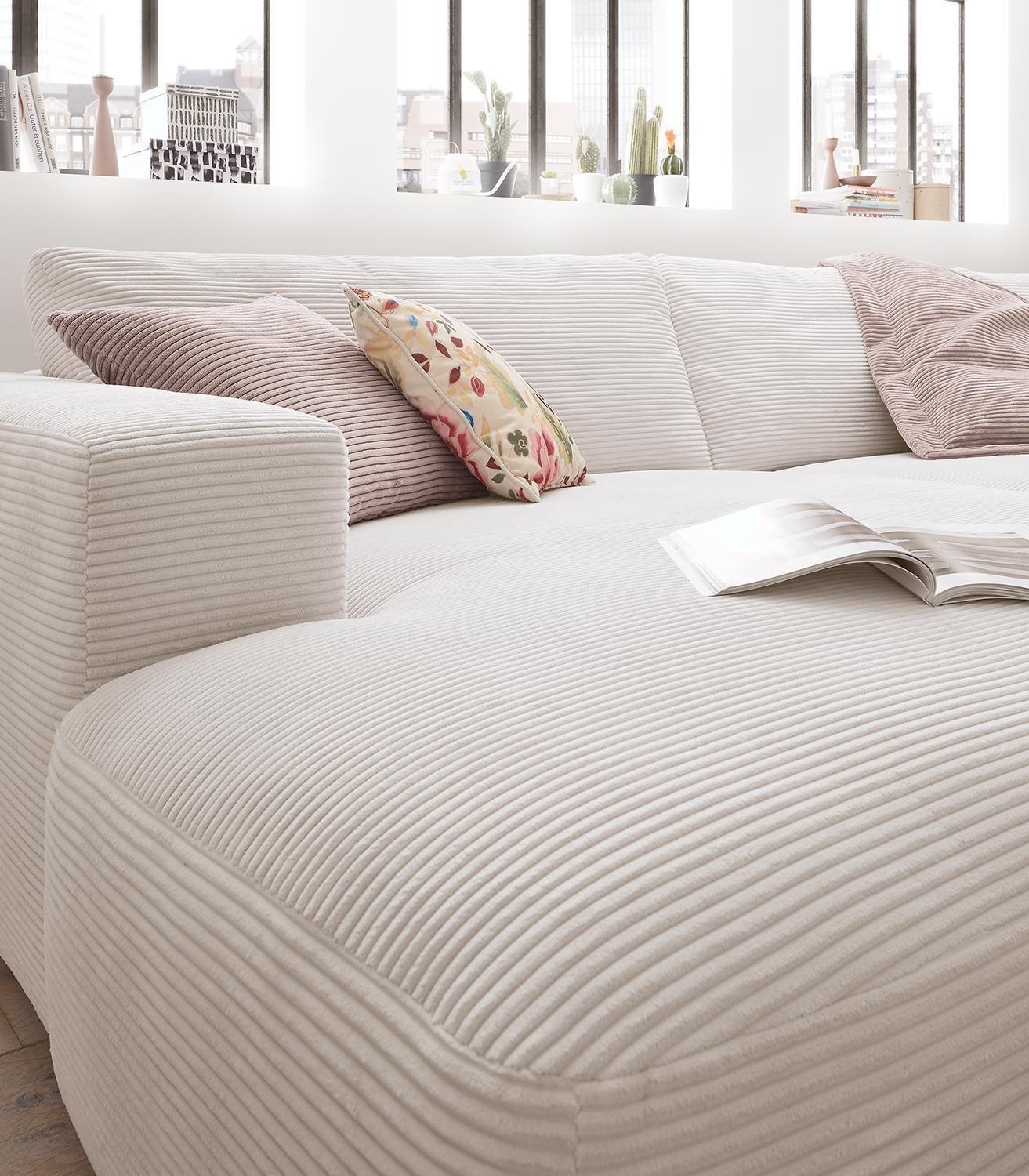 Das Ecksofa MR LUCIA der Marke Musterring ist mit einem weißen Cordbezug ausgestattet. Es verfügt über eine Kaltschaumpolsterung in Kombination mit einer Wellenunterfederung, die für stabilen Sitzkomfort sorgt. Im Lieferumfang sind zwei Rückenkissen enthalten. Die Ottomane kann bei der Montage nur linksseitig angebracht werden, was eine flexible Raumgestaltung ermöglicht. Die Gesamtbreite des Sofas beträgt 296 cm, die Höhe liegt bei 81 cm und die Tiefe bei 190 cm. Die Sitzhöhe misst 43 cm, während die Sitztiefe 81 cm beträgt.