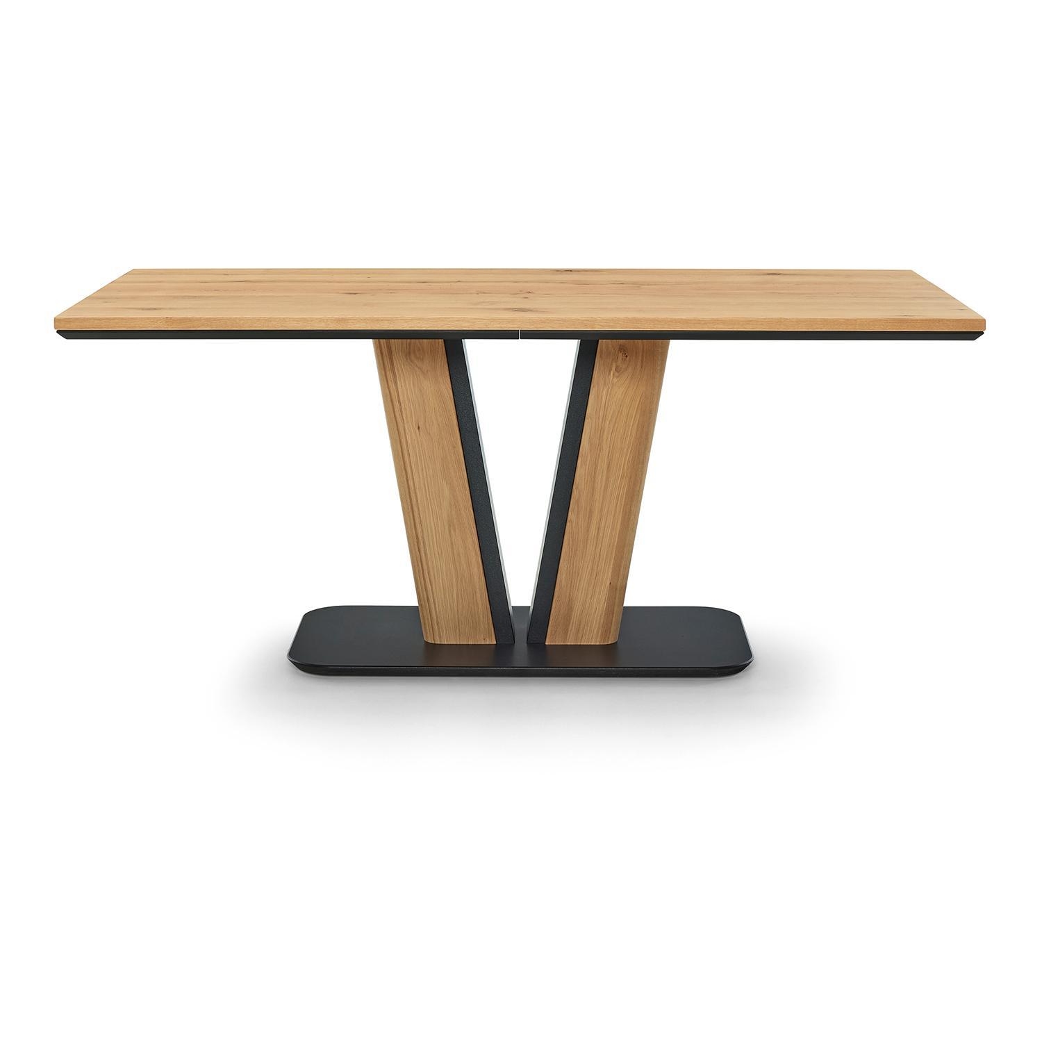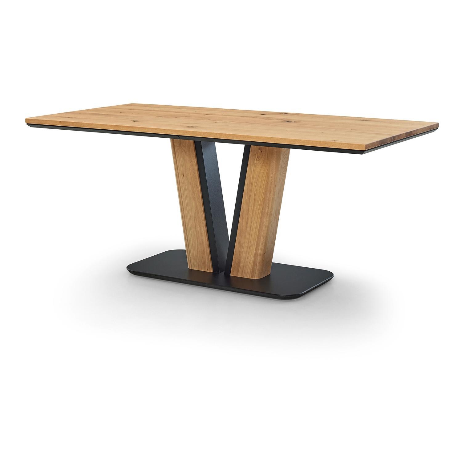 Der Esstisch T4010 von der Marke Musterring verfügt über eine Tischplatte aus massivem Eichenholz. Diese ist mit einem Hartwachsöl-Finish versehen und weist gerade Tischkanten auf. Die Tischplatte besitzt eine Stärke von 2,7 cm. Als Unterbau dient ein V-förmiges Gestell, das aus einer Kombination von Eichenholz und Metall gefertigt ist. Dieses Gestell ruht auf einer Bodenplatte aus schwarzem Metall. Die Abmessungen des Tisches betragen 160 cm in der Breite, 90 cm in der Tiefe und 76 cm in der Höhe.