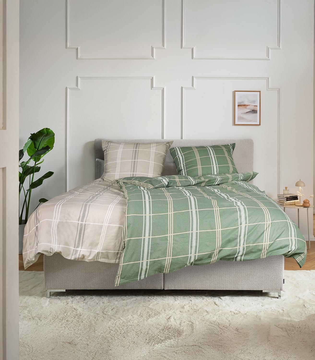 Die Flanell-Bettwäsche MARONA der Marke Musterring besteht aus einem Bettbezug und einem Kissenbezug. Sie ist aus Baumwolle gefertigt und in den Farbe Beige gehalten. Das Design zeigt dezente Karomuster in Grau und Weiß. Beide Bezüge sind mit einem praktischen Reißverschluss ausgestattet. Der Bettbezug hat die Maße 135 x 200 cm, der Kissenbezug misst 80 x 80 cm.