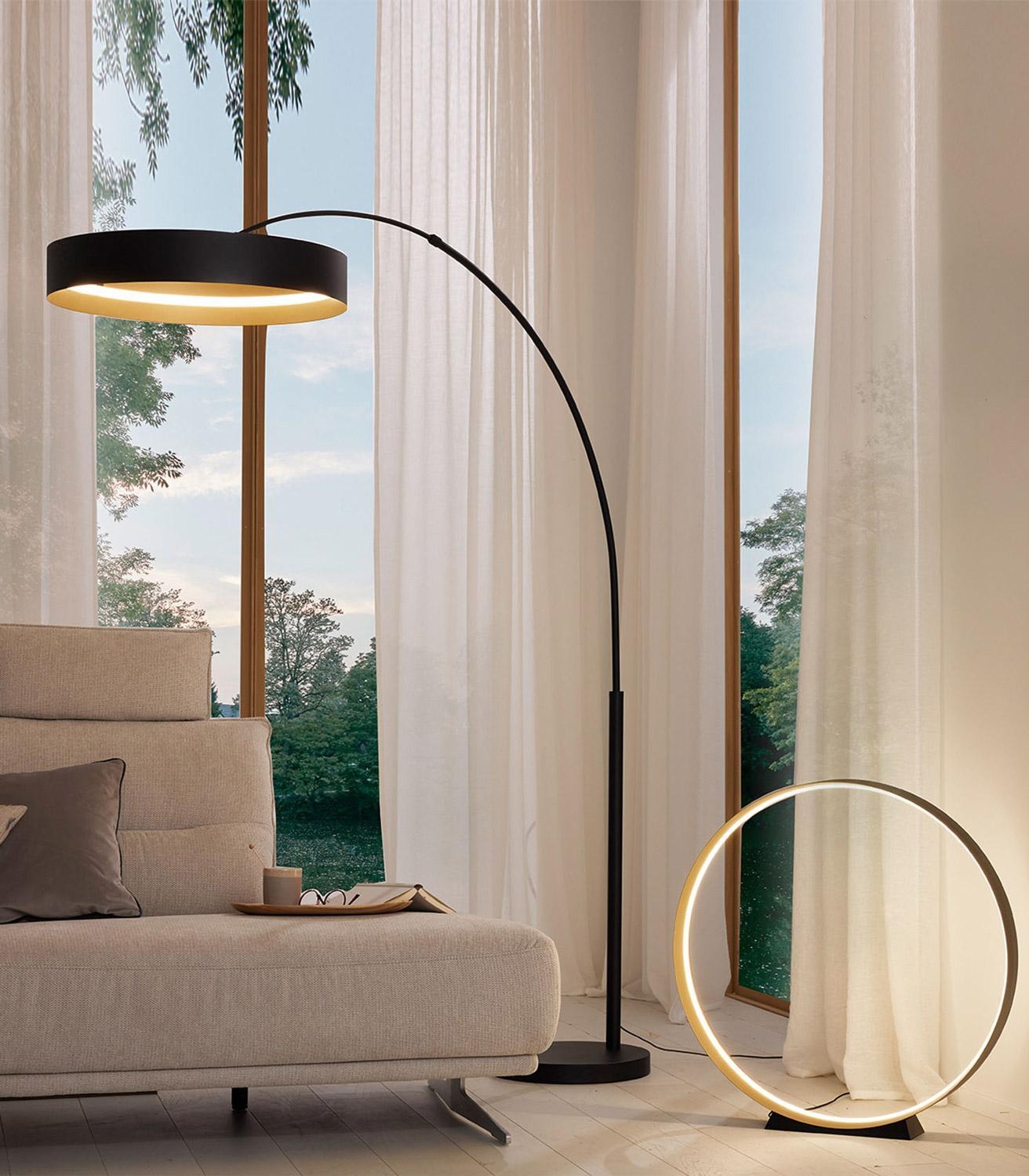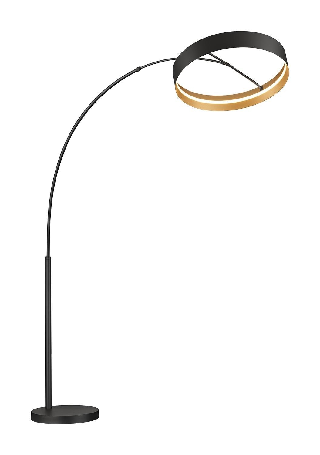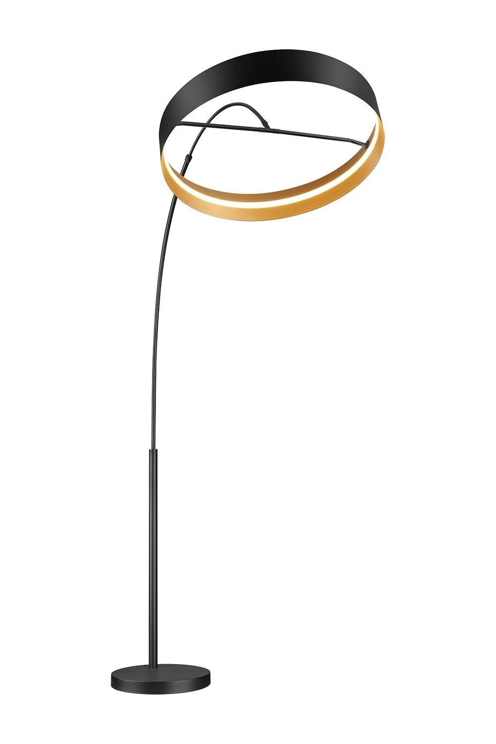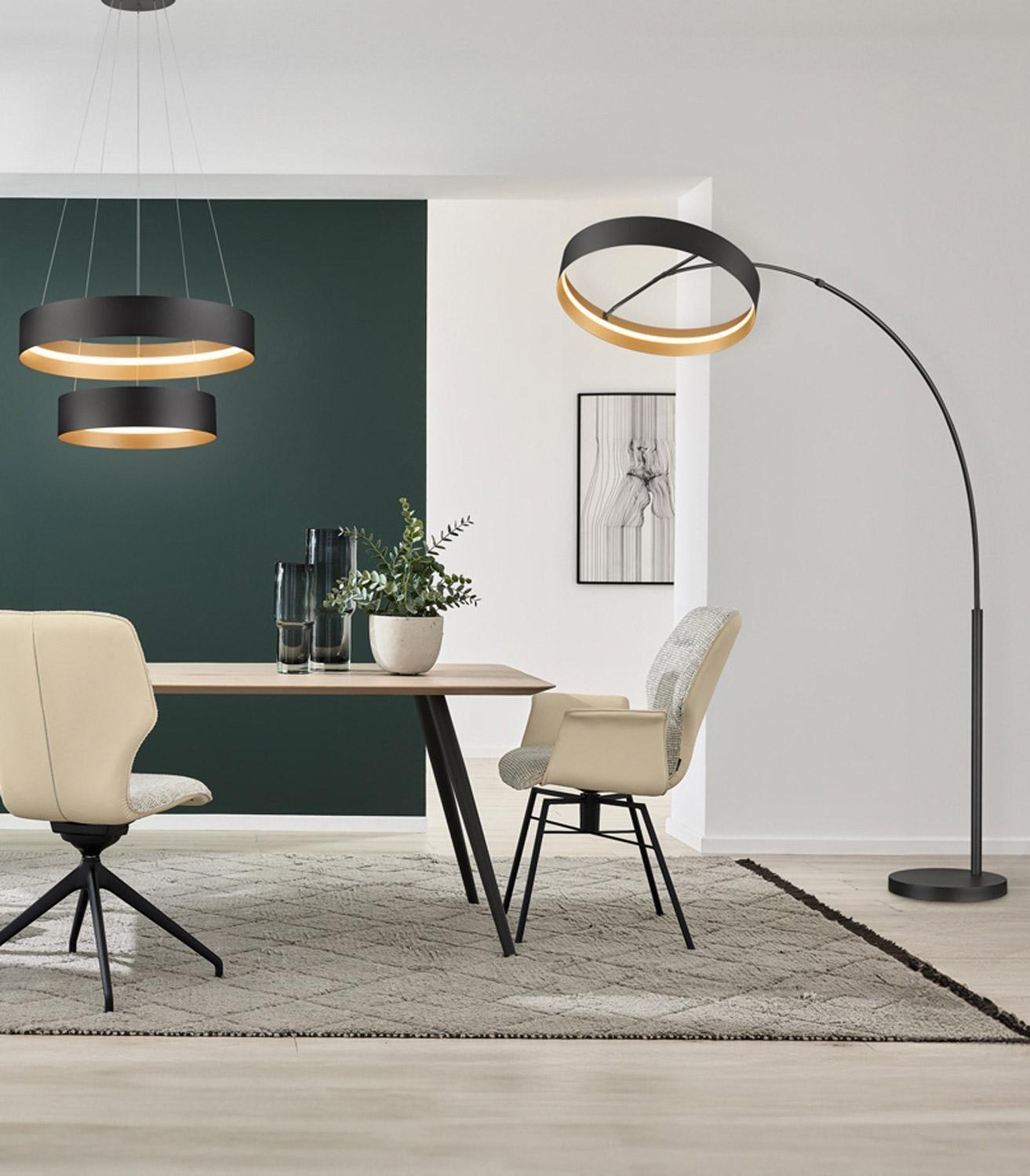 Die LED-Bogenstehlampe LOOP von Musterring beeindruckt durch ihr modernes Design und ihre Funktionalität. Sie besteht aus schwarzem Metall und hat einen goldgelben Lampenschirm. Die Lampe bietet flexible Beleuchtungsoptionen, da die Farbtemperatur anpassbar und dimmbar ist. Diese Einstellungen können bequem per Fernbedienung gesteuert werden. Ein- und ausgeschaltet wird die Lampe über einen praktischen Fußschalter. Mit einer Breite und Höhe von jeweils 200 cm sowie einer Tiefe von 60 cm fügt sie sich stilvoll in verschiedenste Wohnräume ein. Das fest integrierte LED-Leuchtmittel hat eine Leistung von 32 Watt, strahlt mit einer Helligkeit von 3800 Lumen und bietet Farbtemperaturen von 2700 bis 6000 Kelvin. Ein Austausch des Leuchtmittels ist nicht möglich.