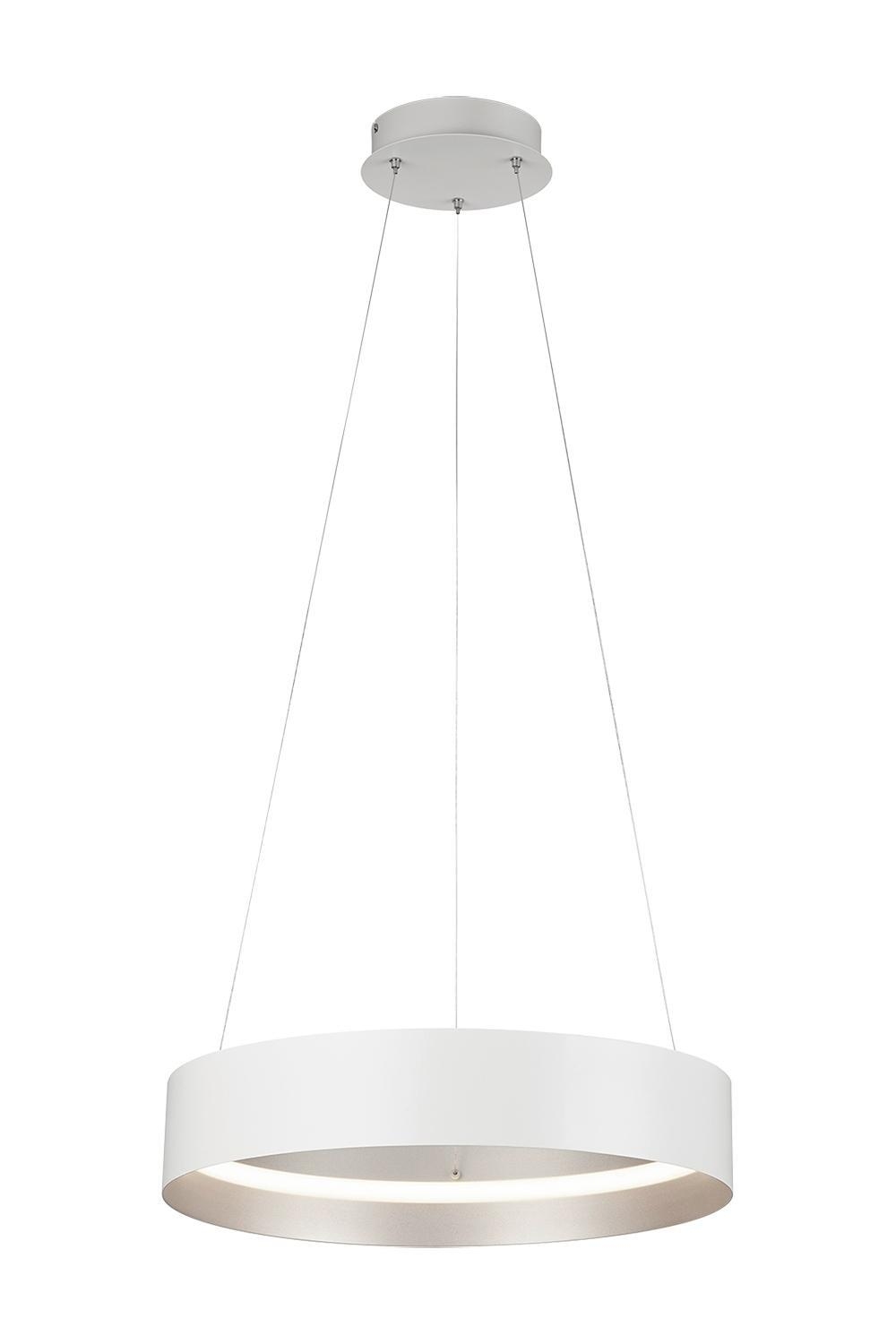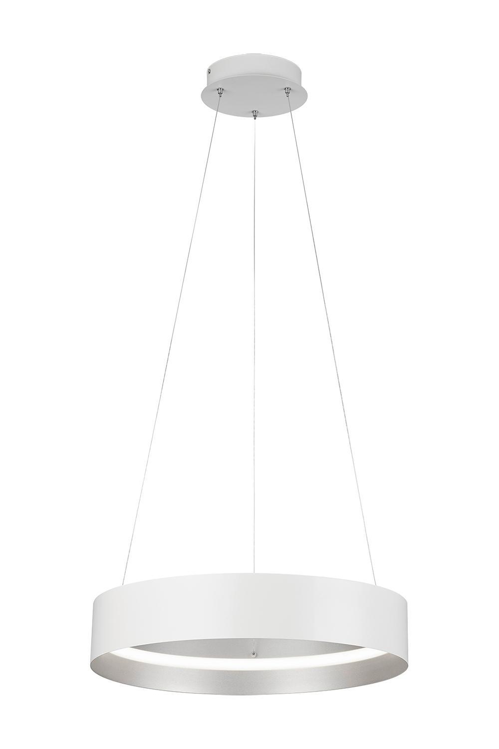 Die LED-Pendelleuchte LOOP von Musterring kombiniert stilvolles Design mit fortschrittlicher Beleuchtungstechnologie. Gefertigt aus weißem Metall und ergänzt durch einen silbergrauen Lampenschirm, fügt sie sich elegant in jedes Interieur ein. Sie bietet flexible Lichtgestaltung durch anpassbare Farbtemperatur und Dimmfunktion, die bequem über eine Fernbedienung gesteuert werden können. Mit einem Durchmesser von 50 cm und einer Höhe von 150 cm ist sie ein markanter Blickfang. Die Leuchte beinhaltet ein fest integriertes LED-Leuchtmittel mit einer Leistung von 36 Watt, das 4150 Lumen Helligkeit erzeugt und Farbtemperaturen zwischen 2700 und 6000 Kelvin ermöglicht. Ein Austausch des Leuchtmittels ist nicht vorgesehen.